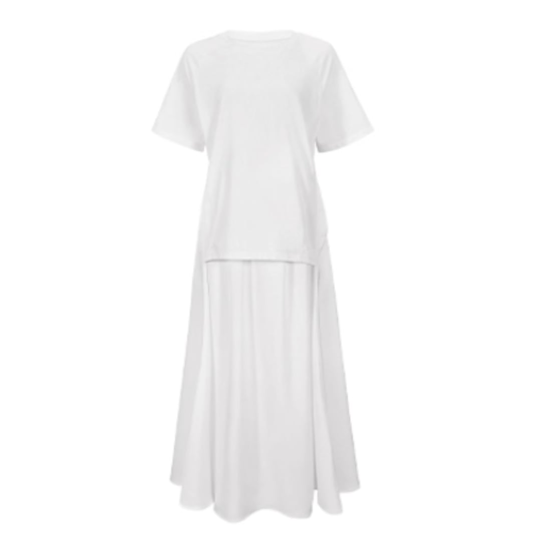 セットアップのように見える切り替えを施したTシャツワンピース。