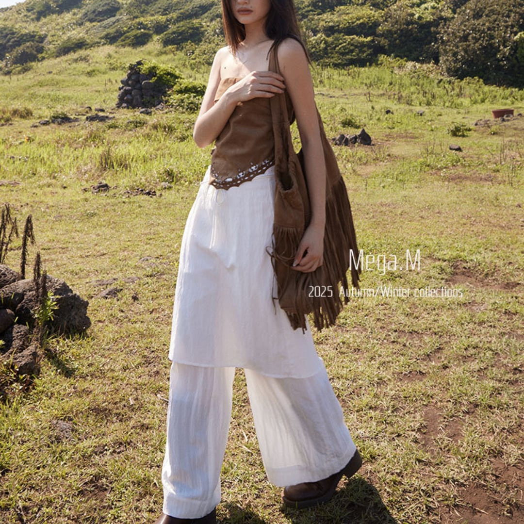 スカートとパンツを重ね着したように見えるレイヤードパンツ。