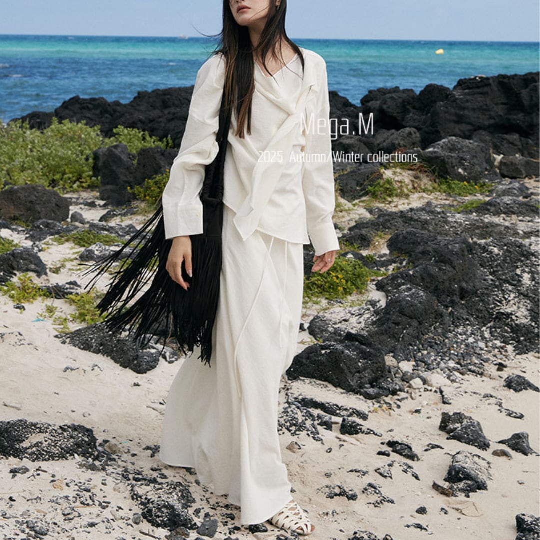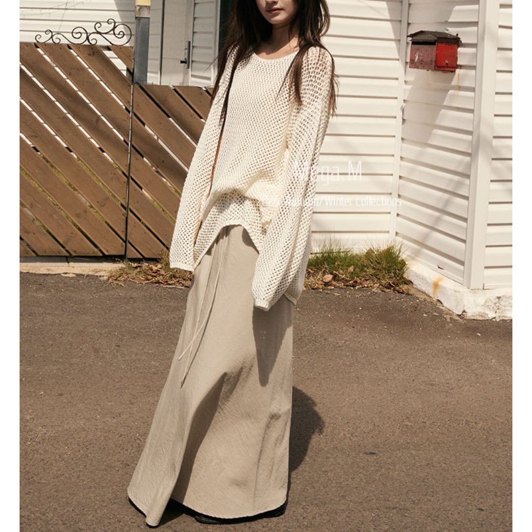楽にきれいめスタイルが作れるウエストドローコード仕様のロングスカート。