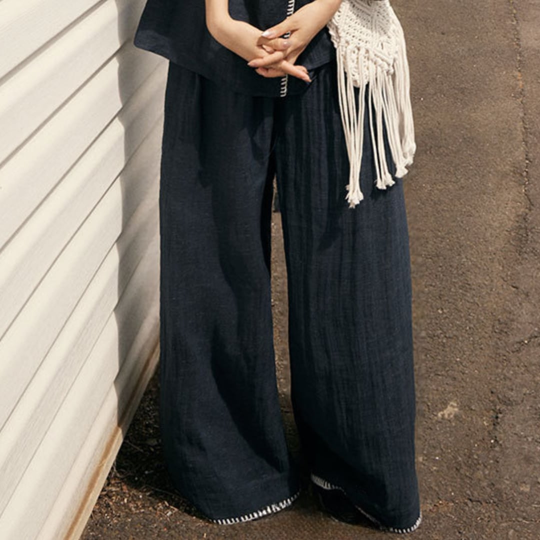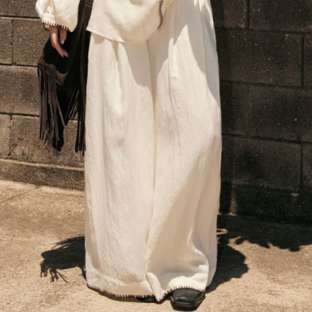 裾まわりのステッチデザインがさり気なく目を惹くワイドストレートパンツ。