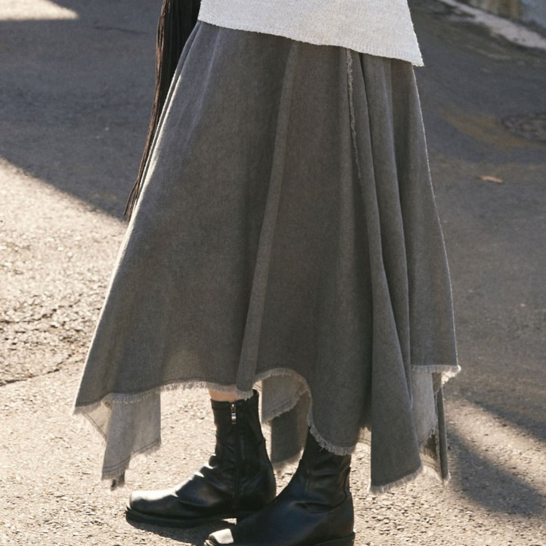 遊び心のあるイレギュラーヘムにフリンジを施したロングスカート。