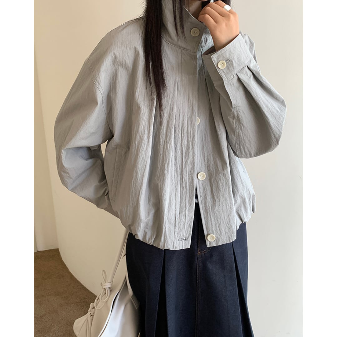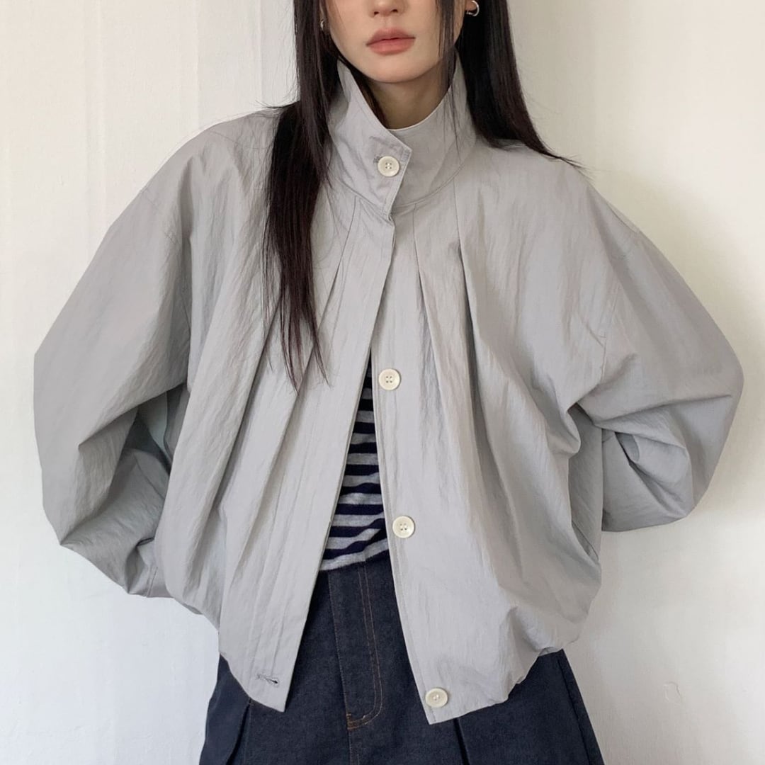 フロントと袖にタックを施した、ゆったり設計のスタンドカラージャケット。