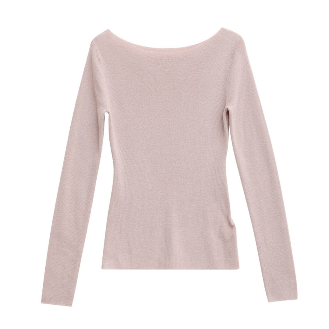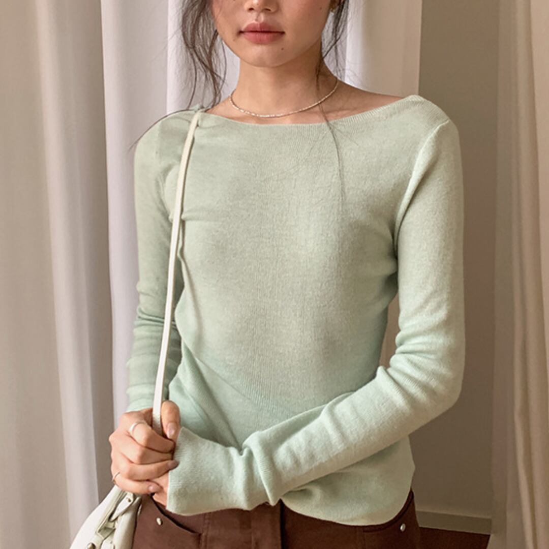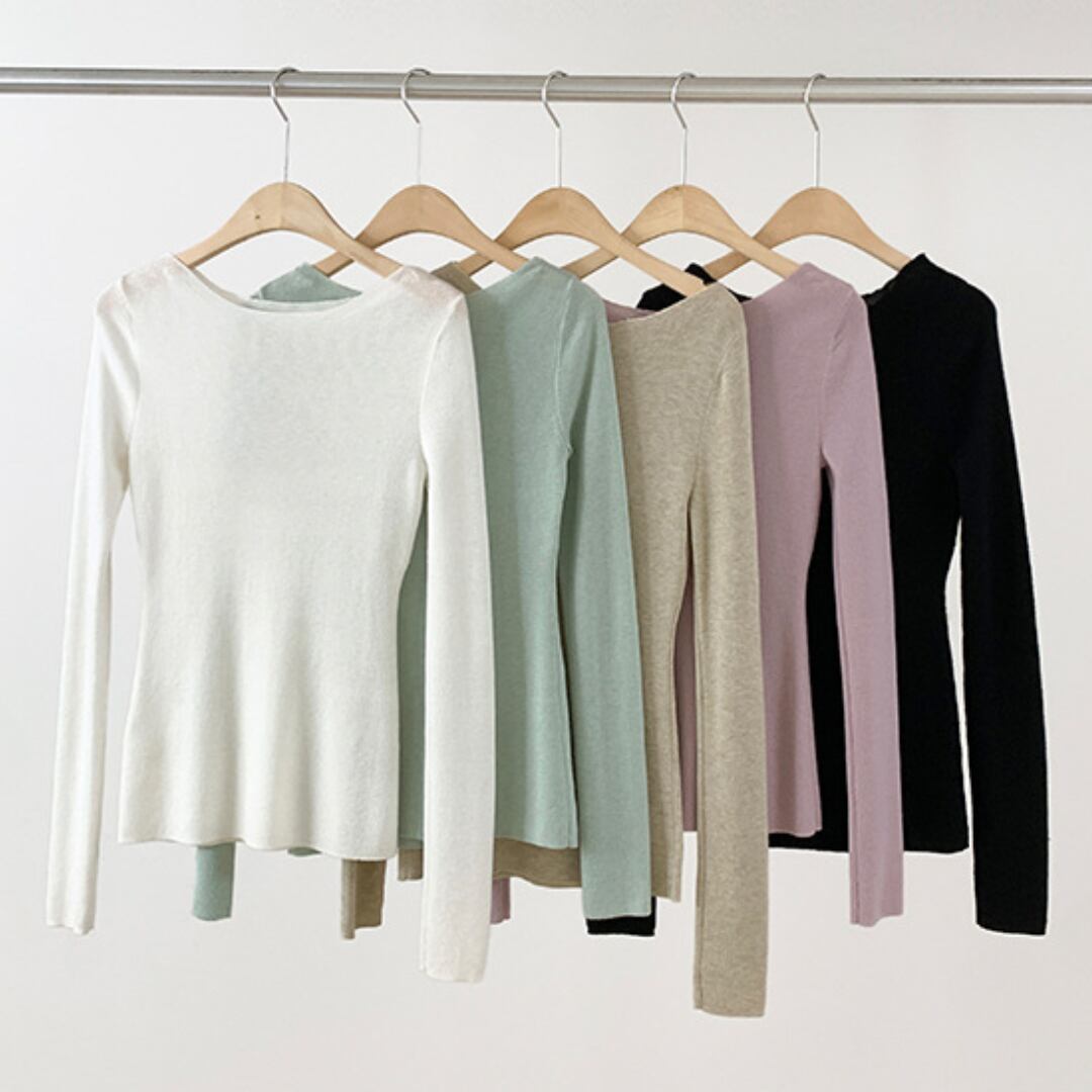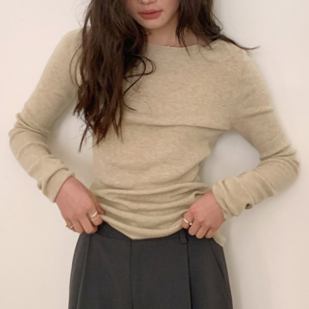 浅めのネックラインで上品さがあり、長く着回せる薄手仕様。