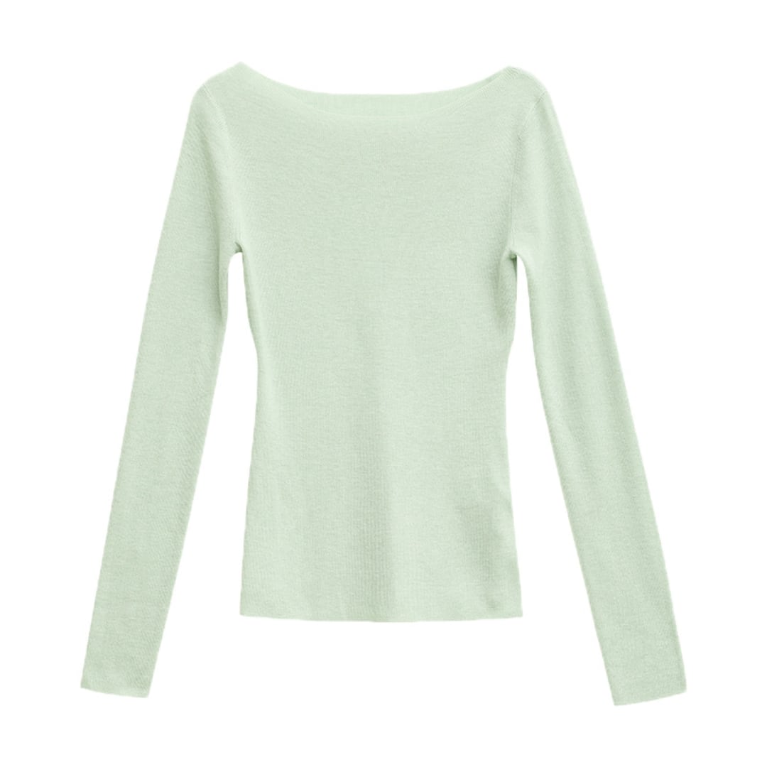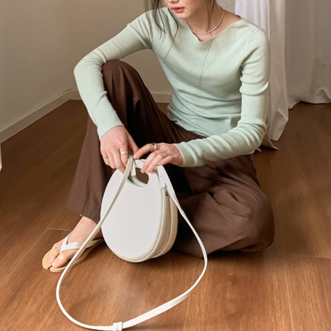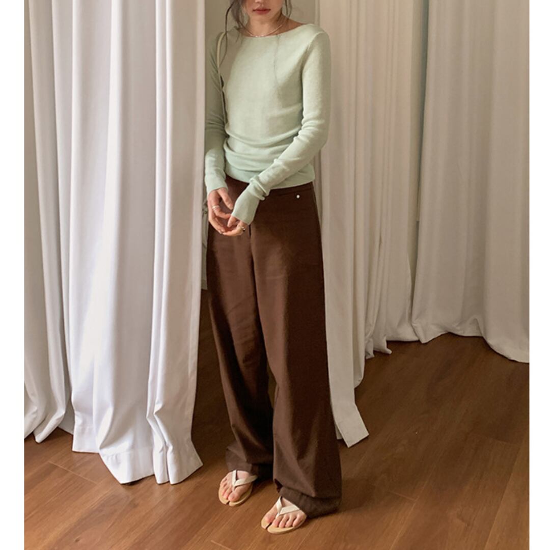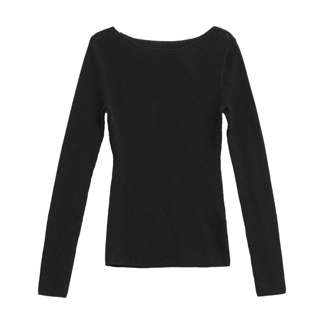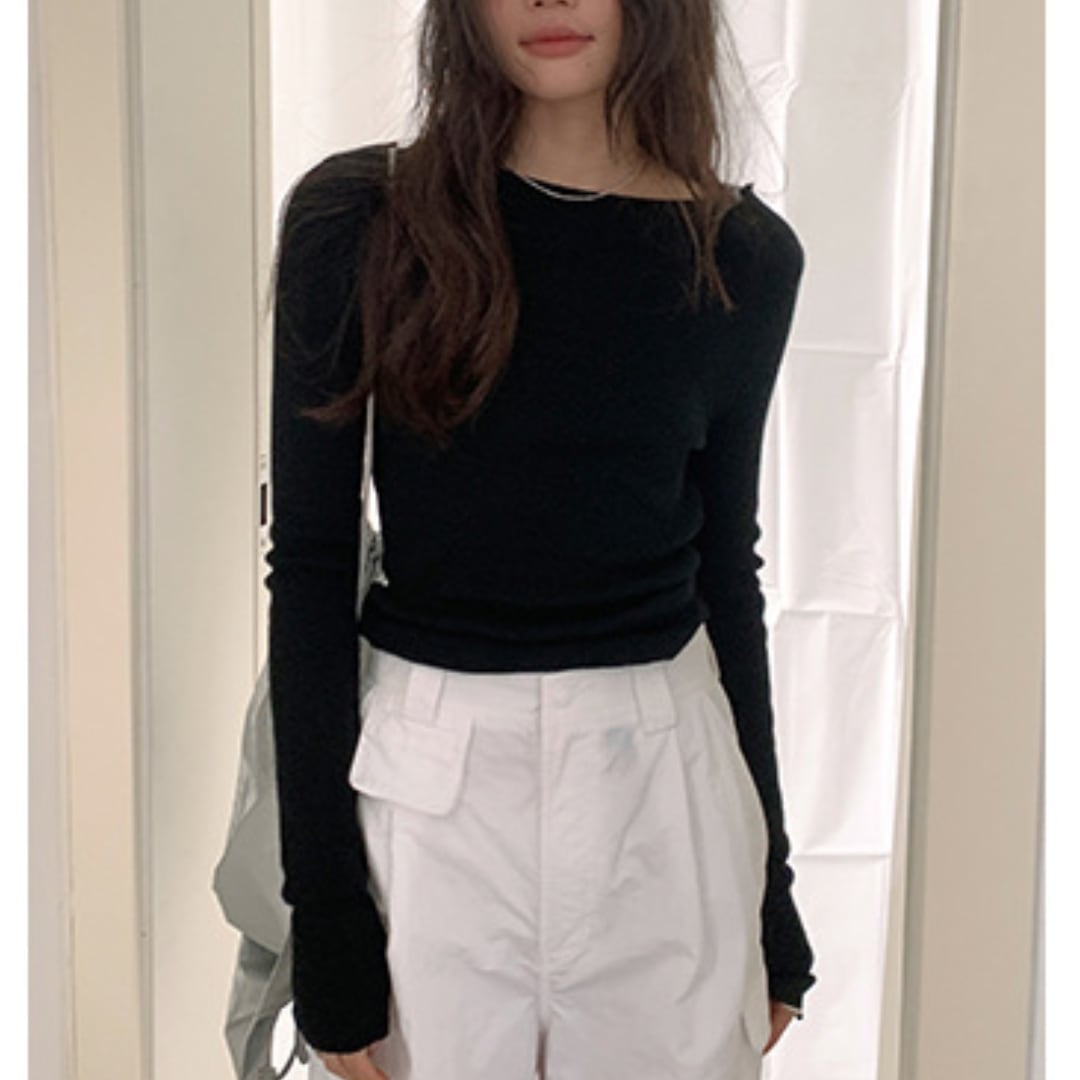 浅めのネックラインで上品さがあり、長く着回せる薄手仕様。