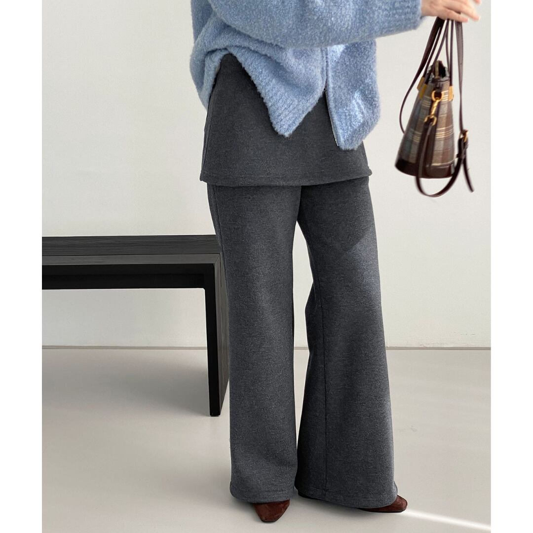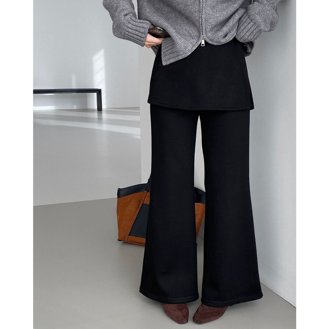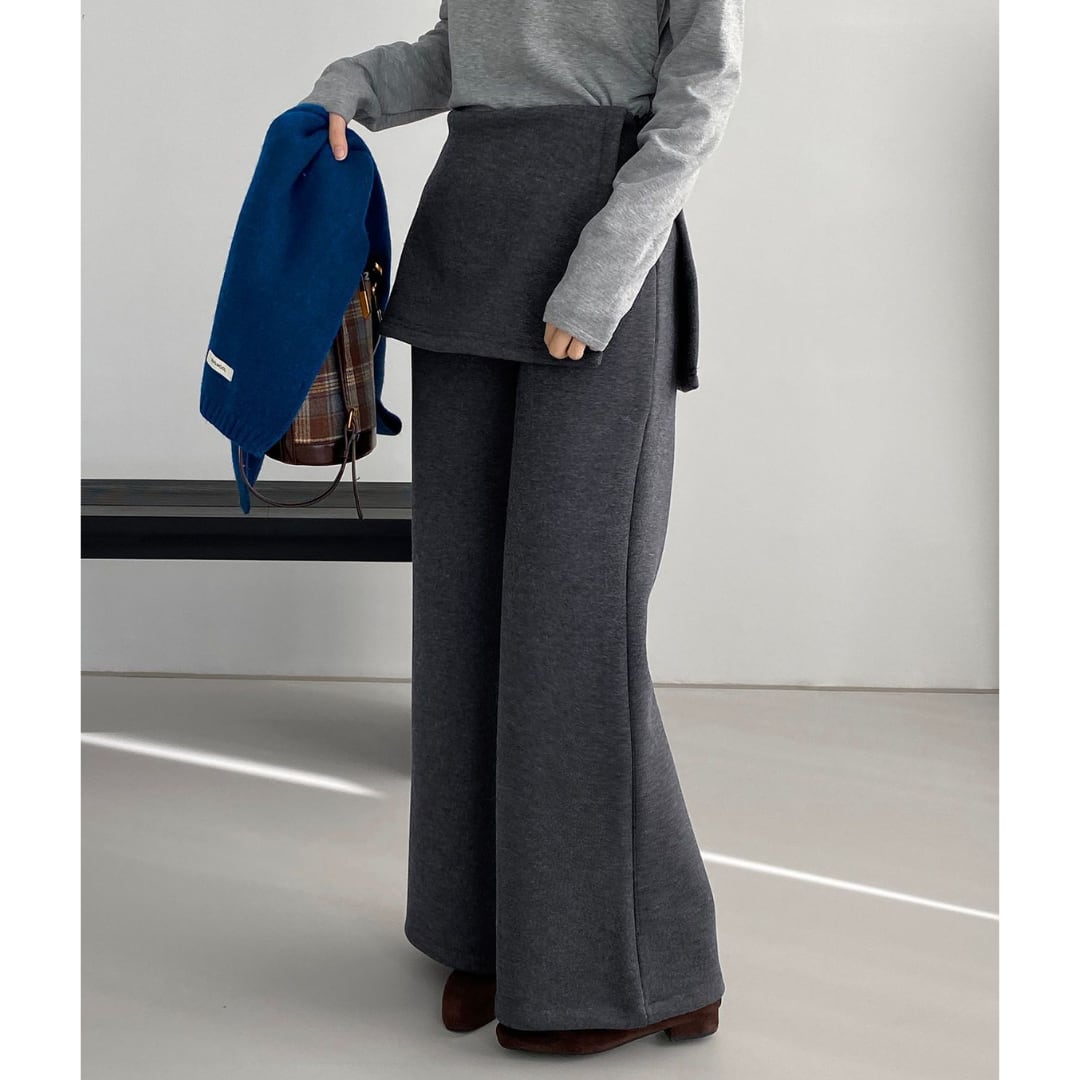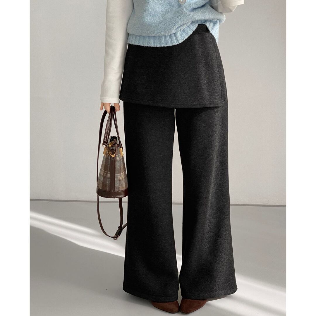 スカートとパンツを重ね着したかのように見えるレイヤード風パンツ。