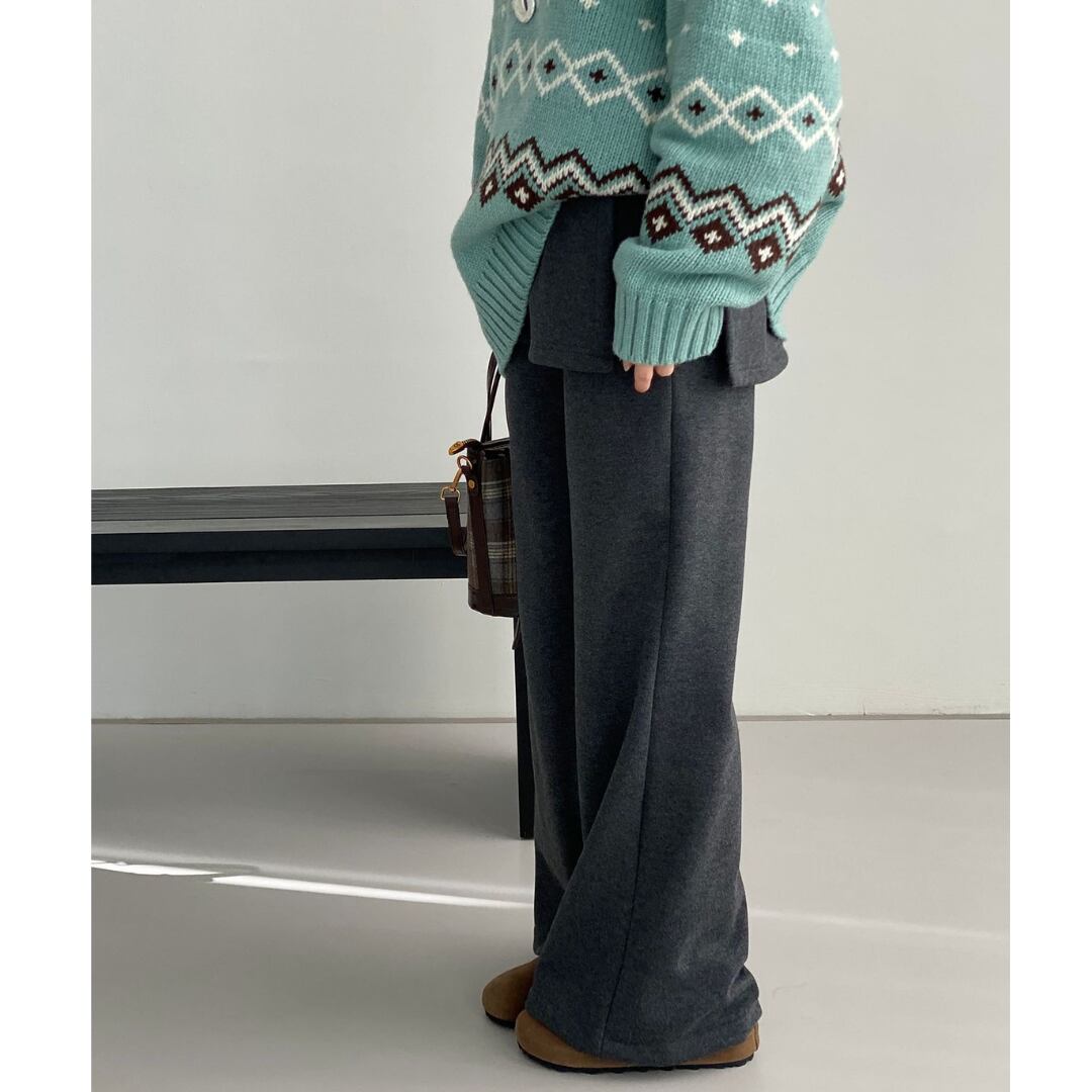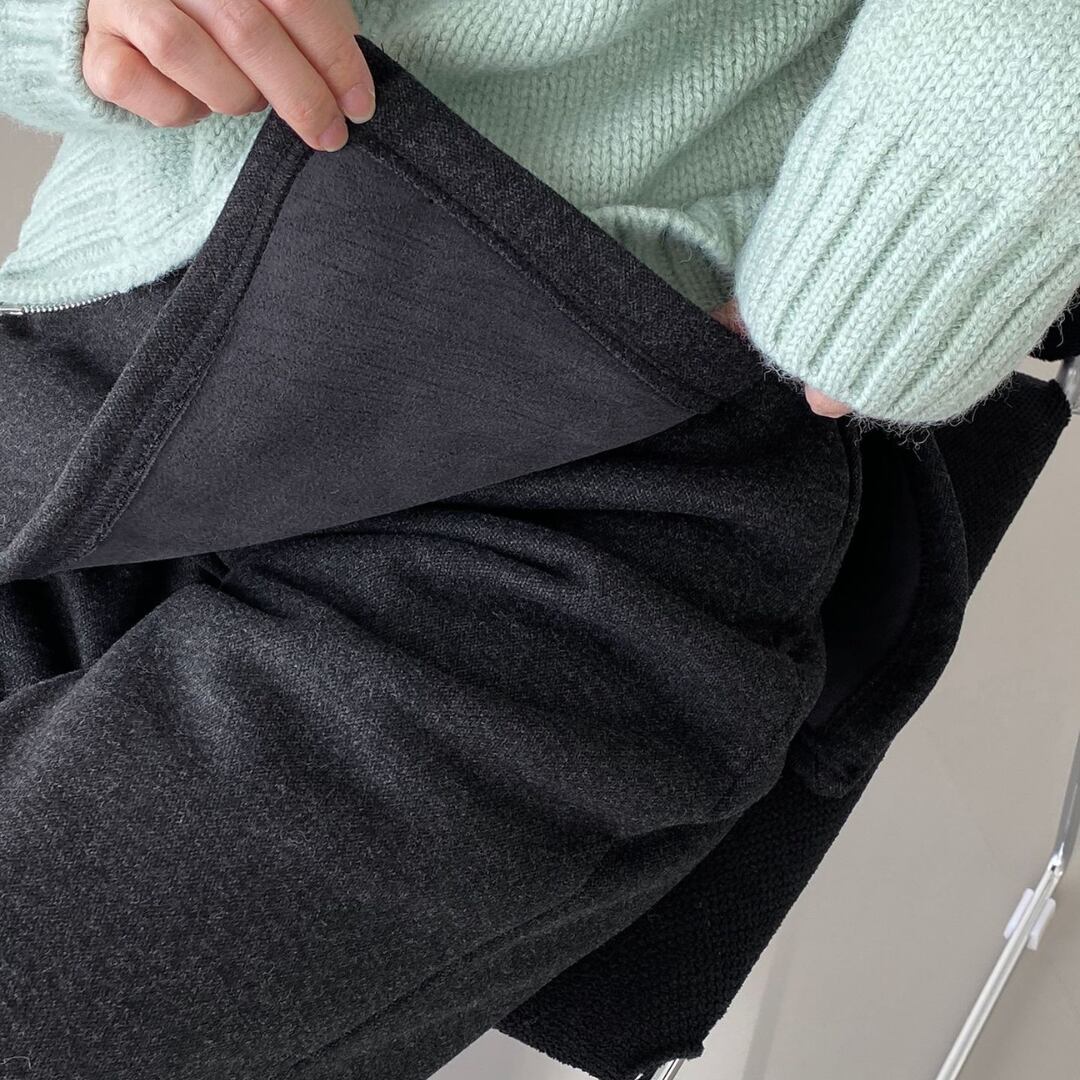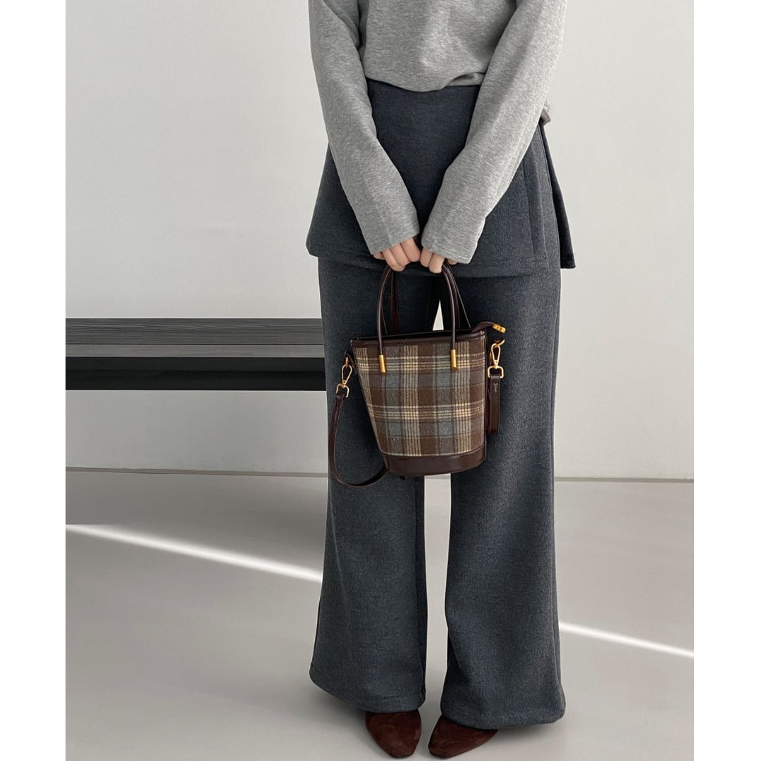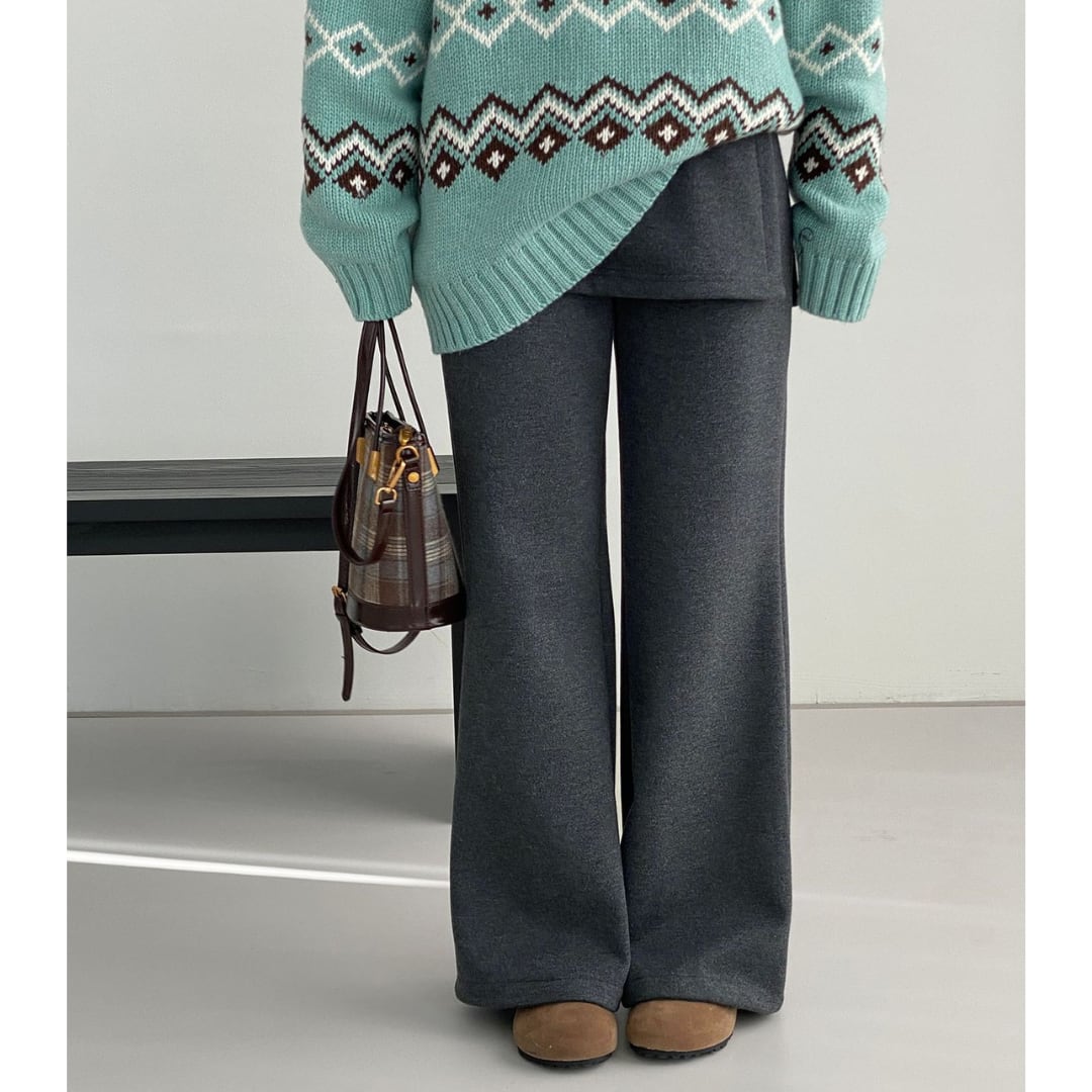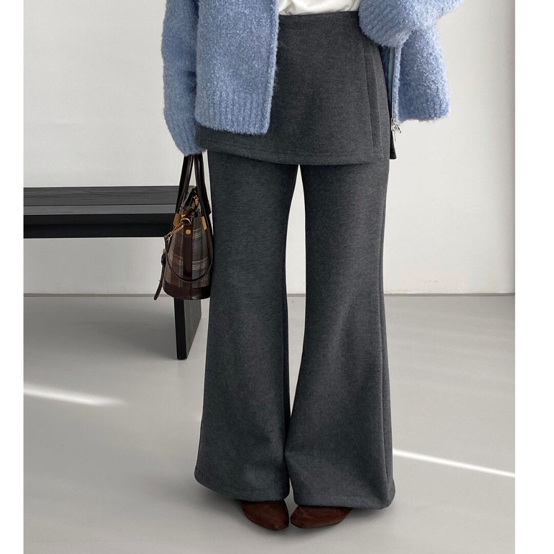 スカートとパンツを重ね着したかのように見えるレイヤード風パンツ。