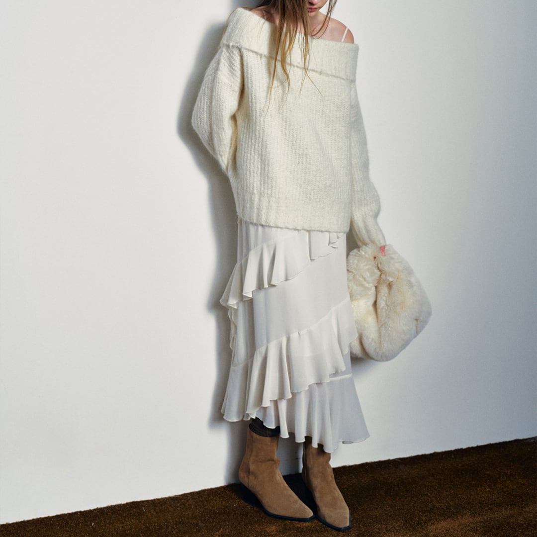 デコルテの見えるオフショルダーデザインが女性らしさの引き立て役に。