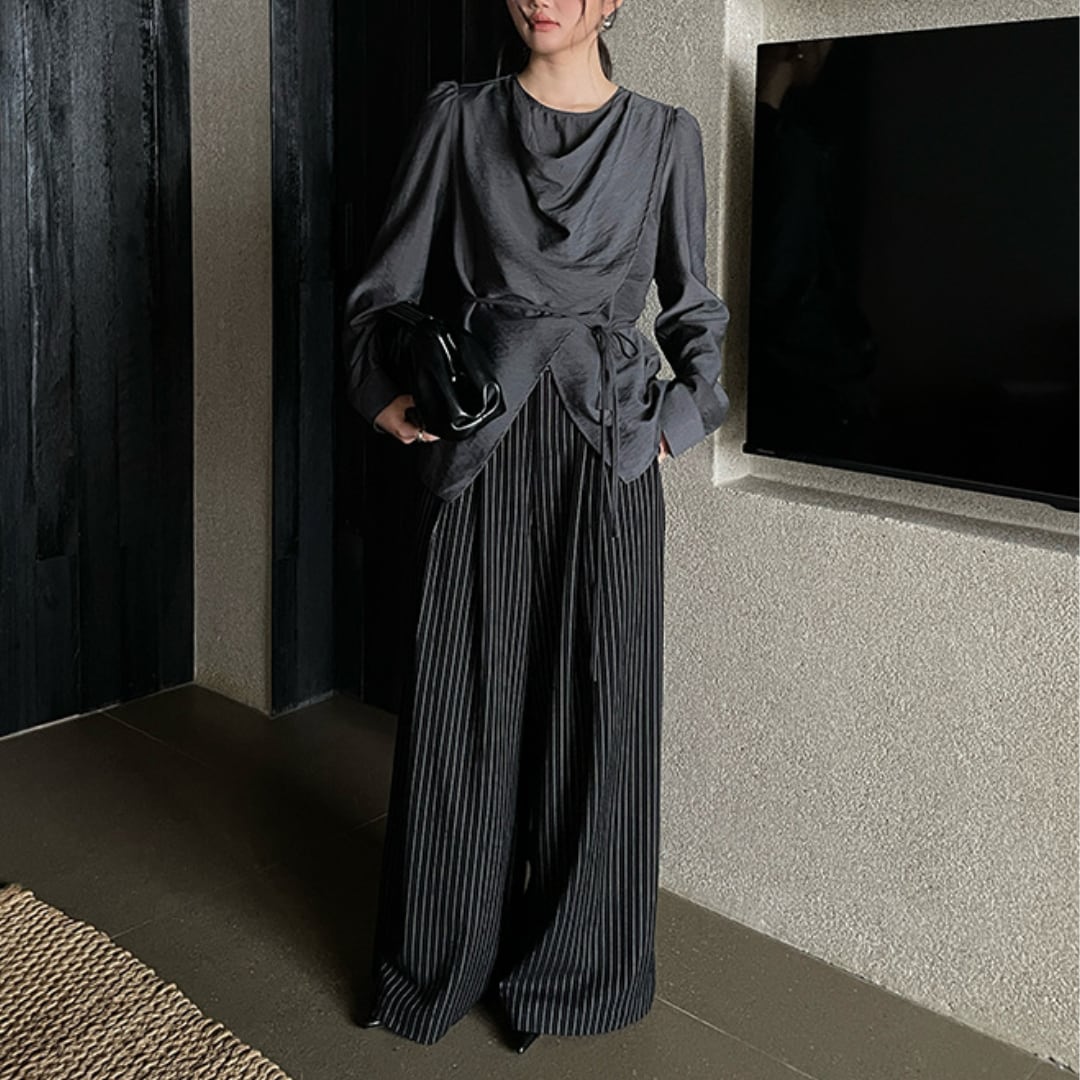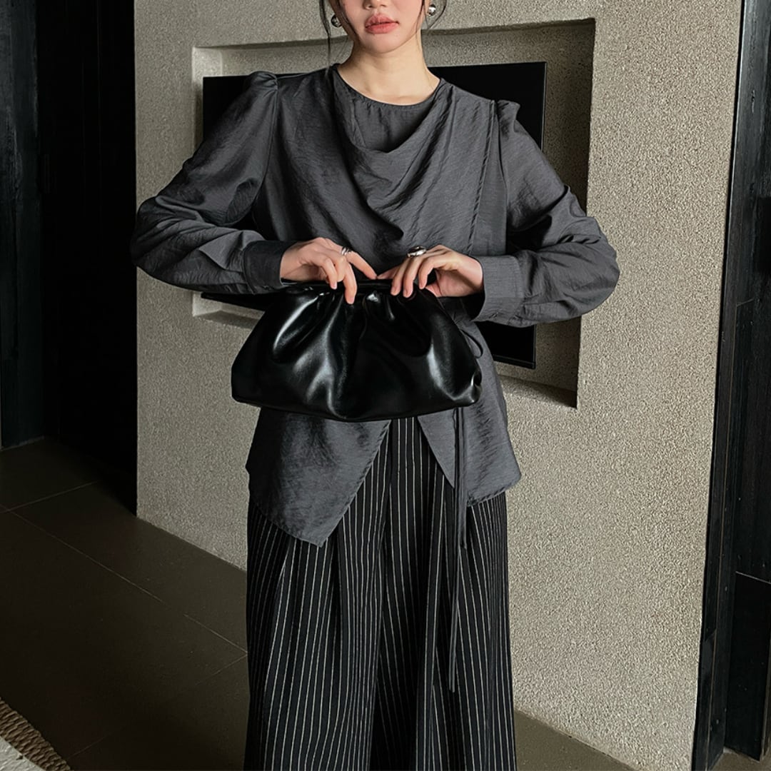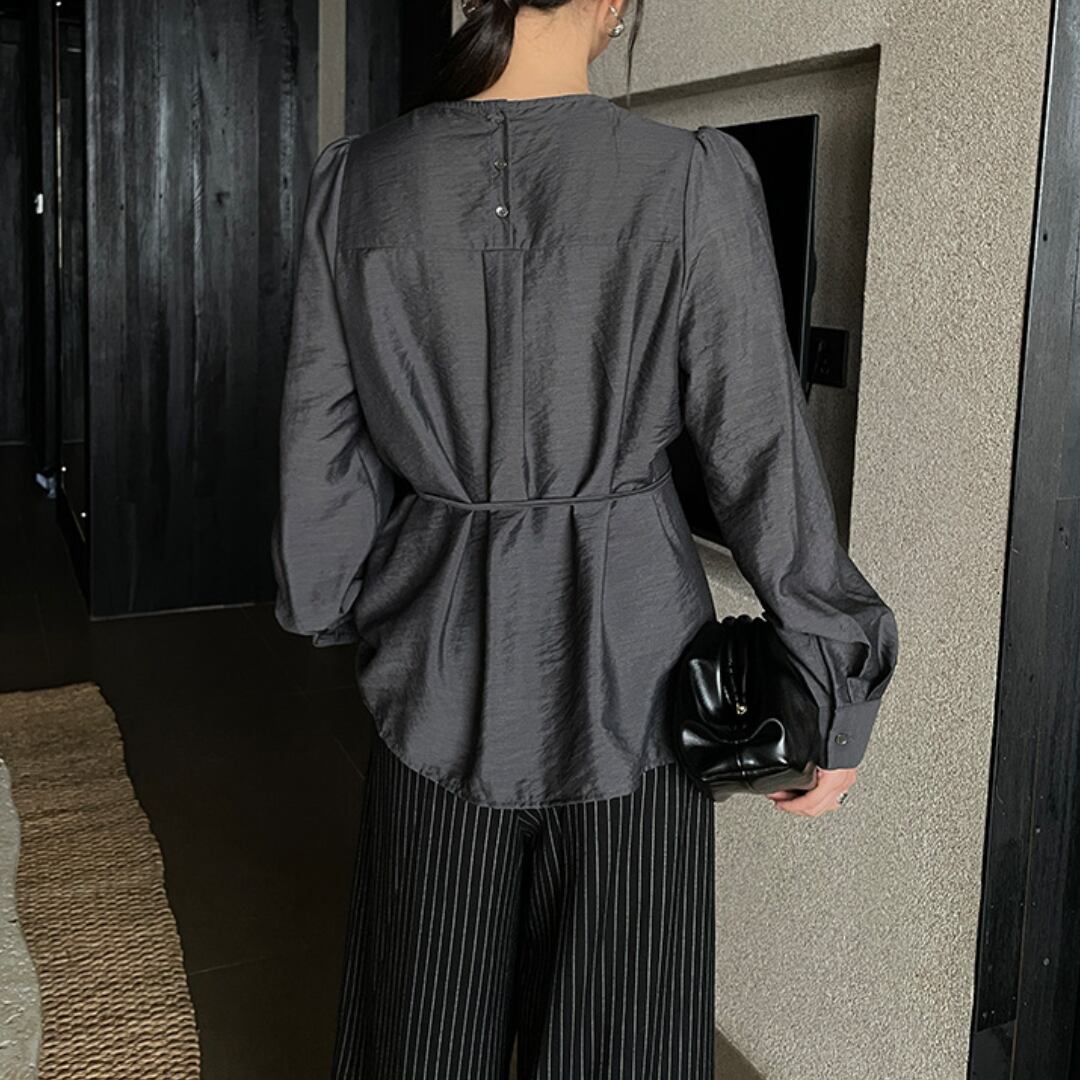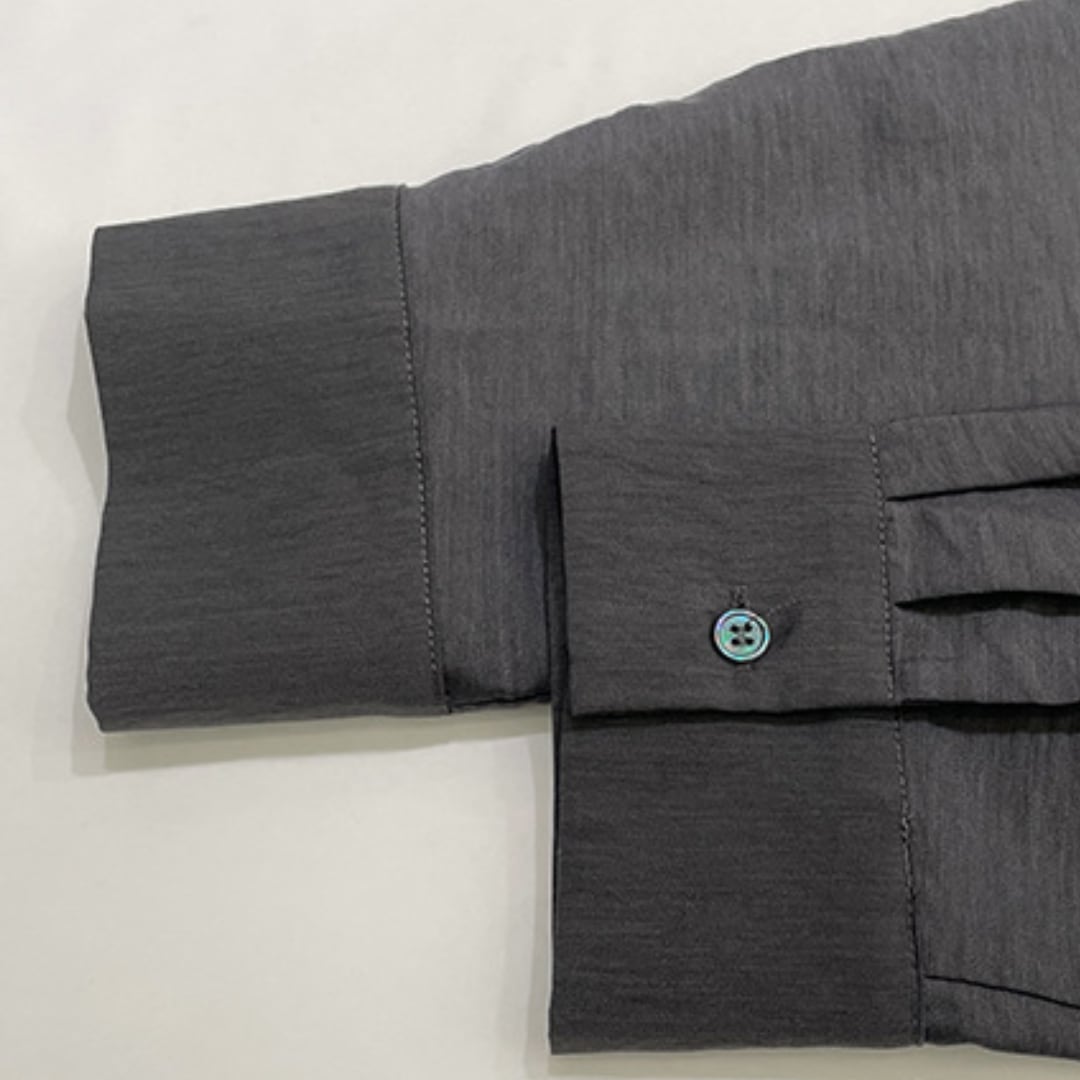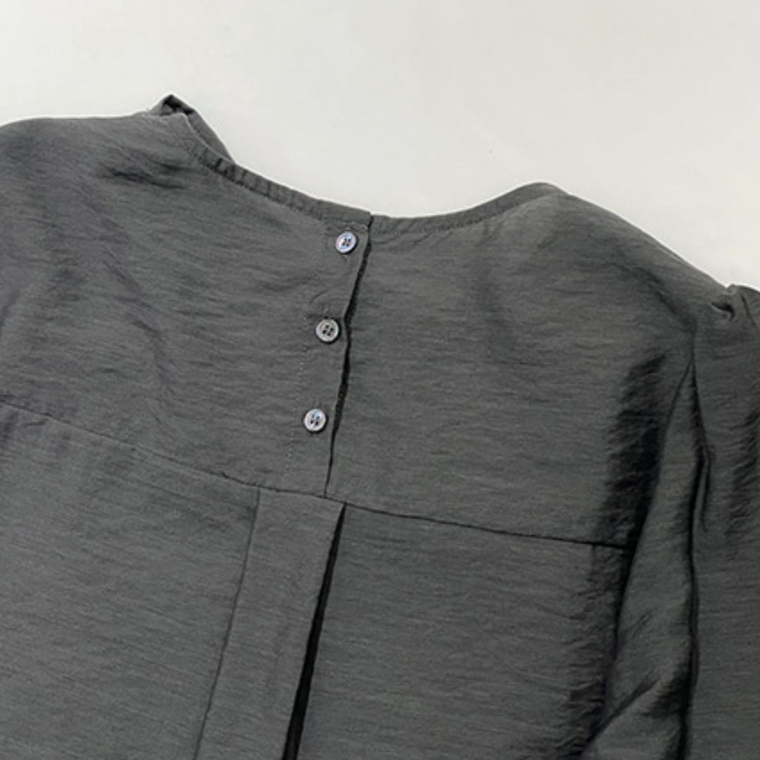 光沢のあるさらりとした生地で、バックボタンがコーデのアクセントに。