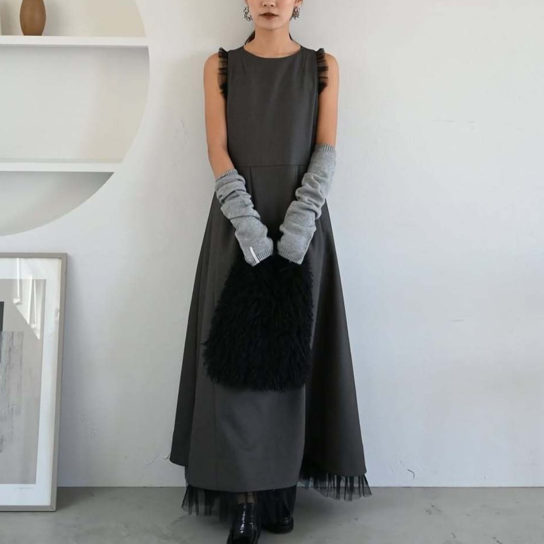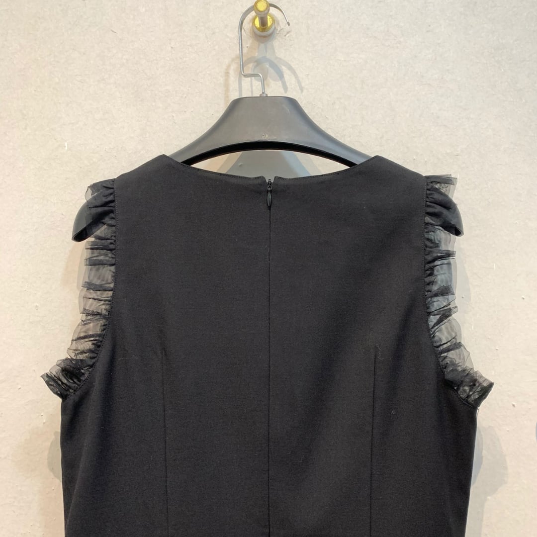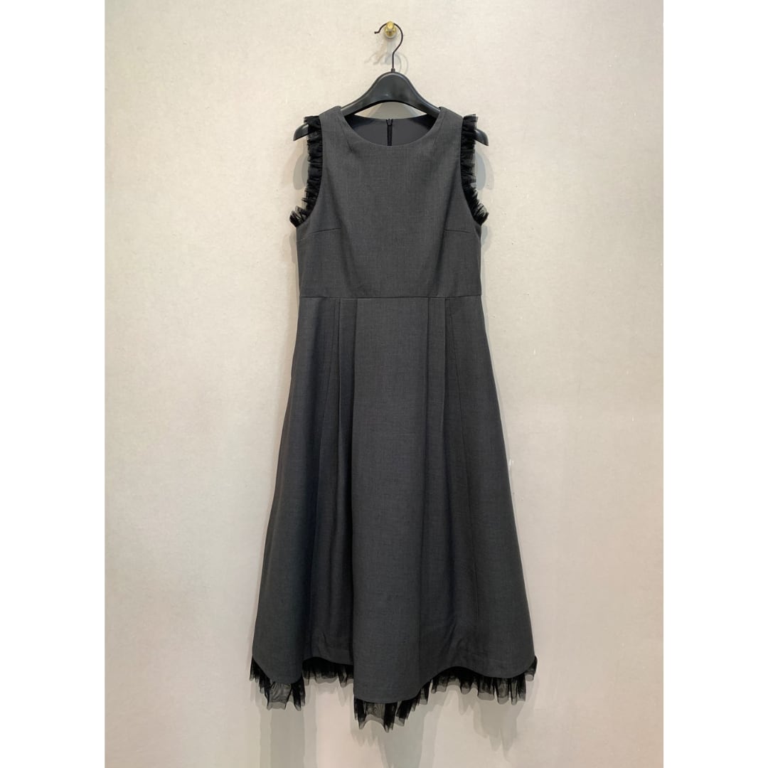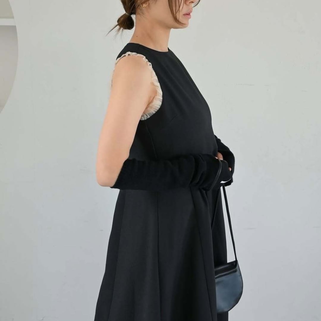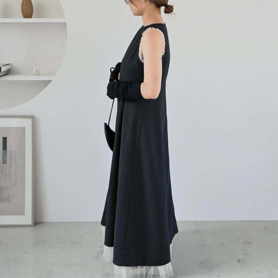 裾とアームホールにフリルレースをあしらったノースリーブワンピース。