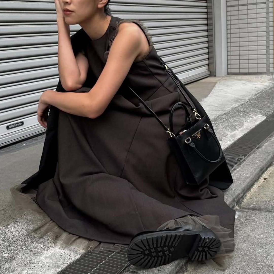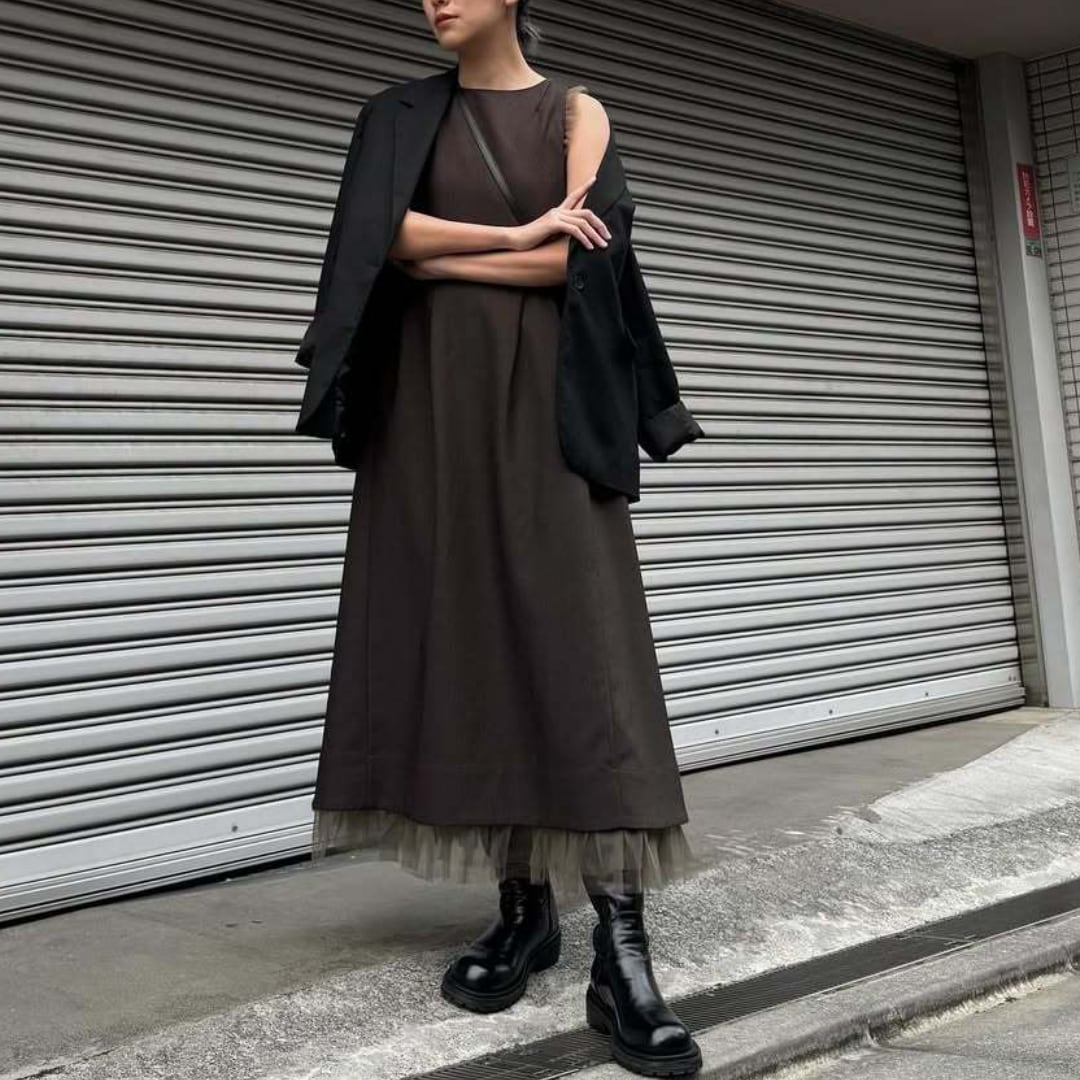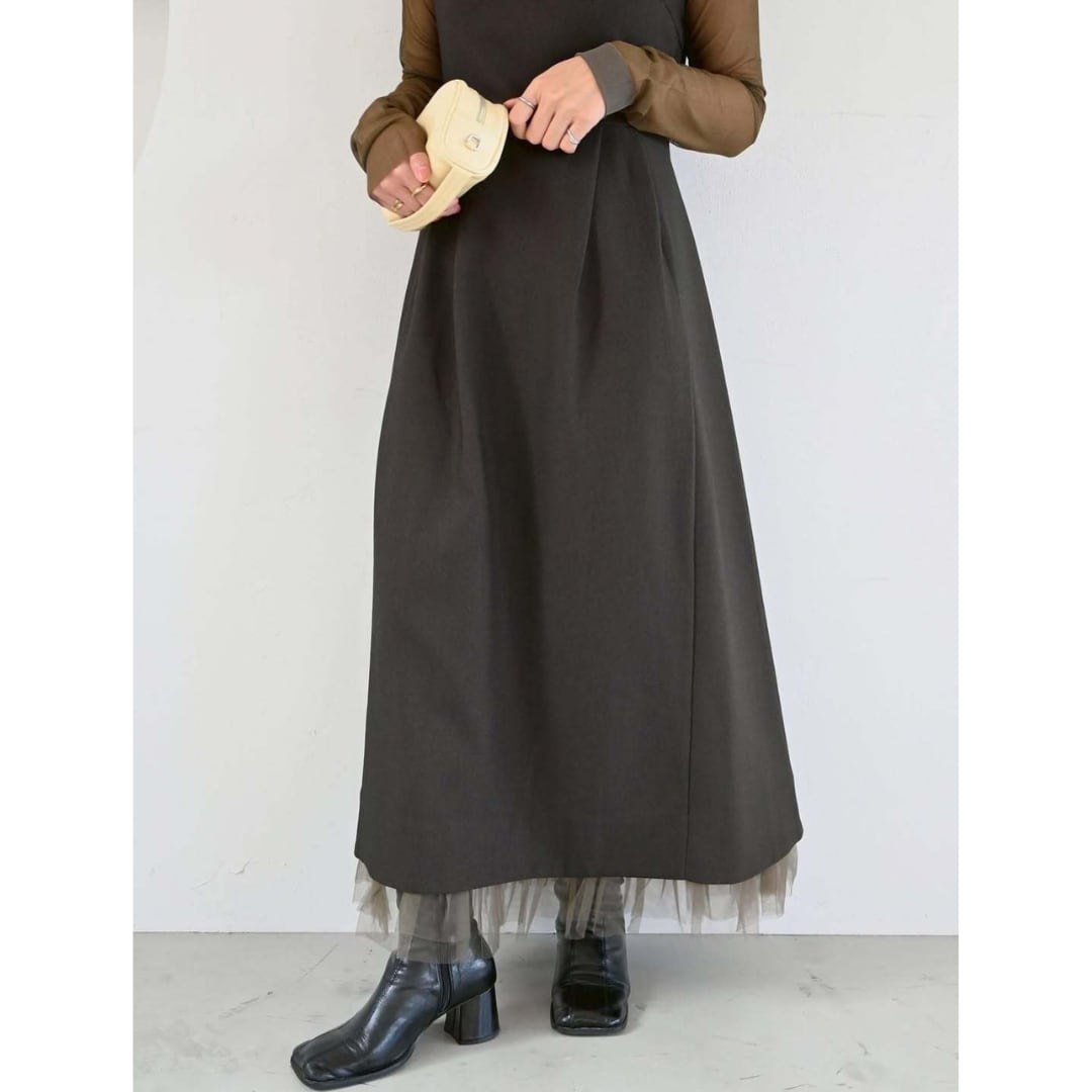 ドレッシーなAラインシルエットに加え、スタイルアップ効果のあるウエスト切り替え入り。大人の雰囲気の中にほんのりフェミニン感が漂う1着です。