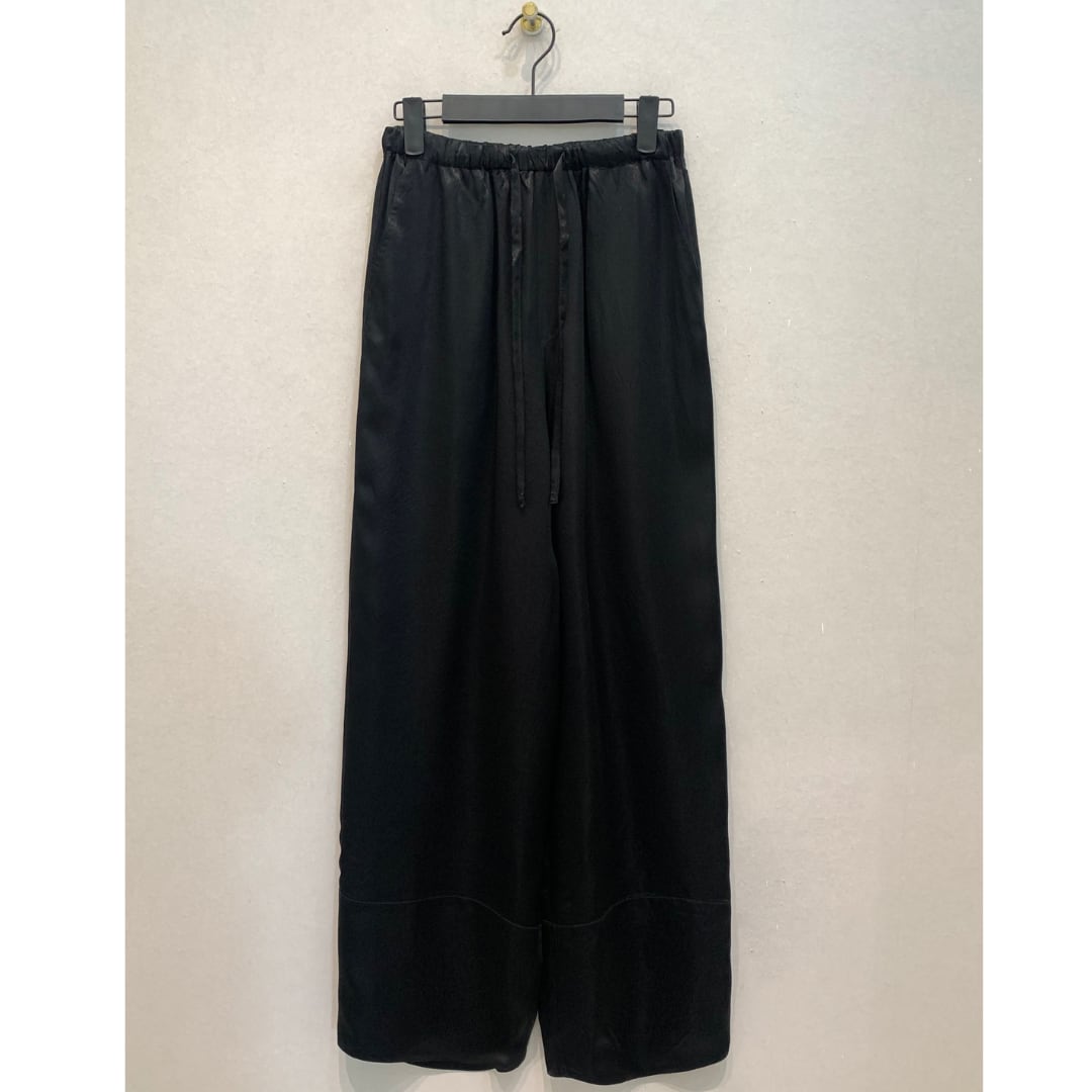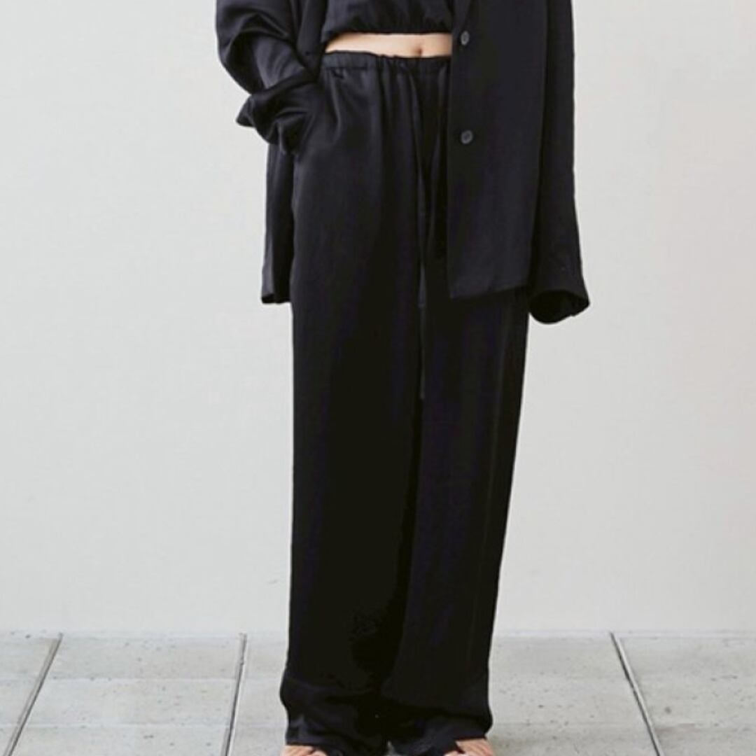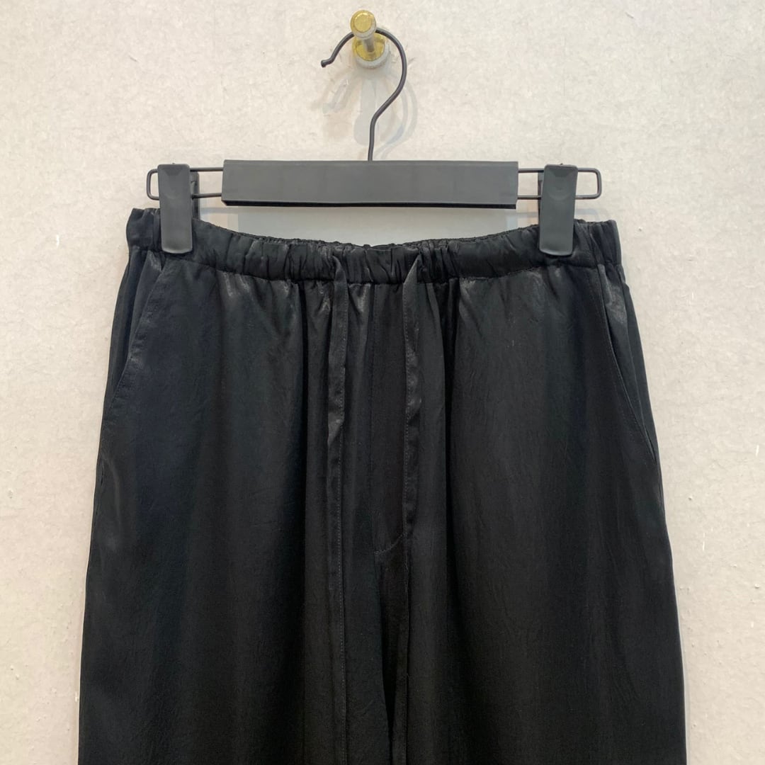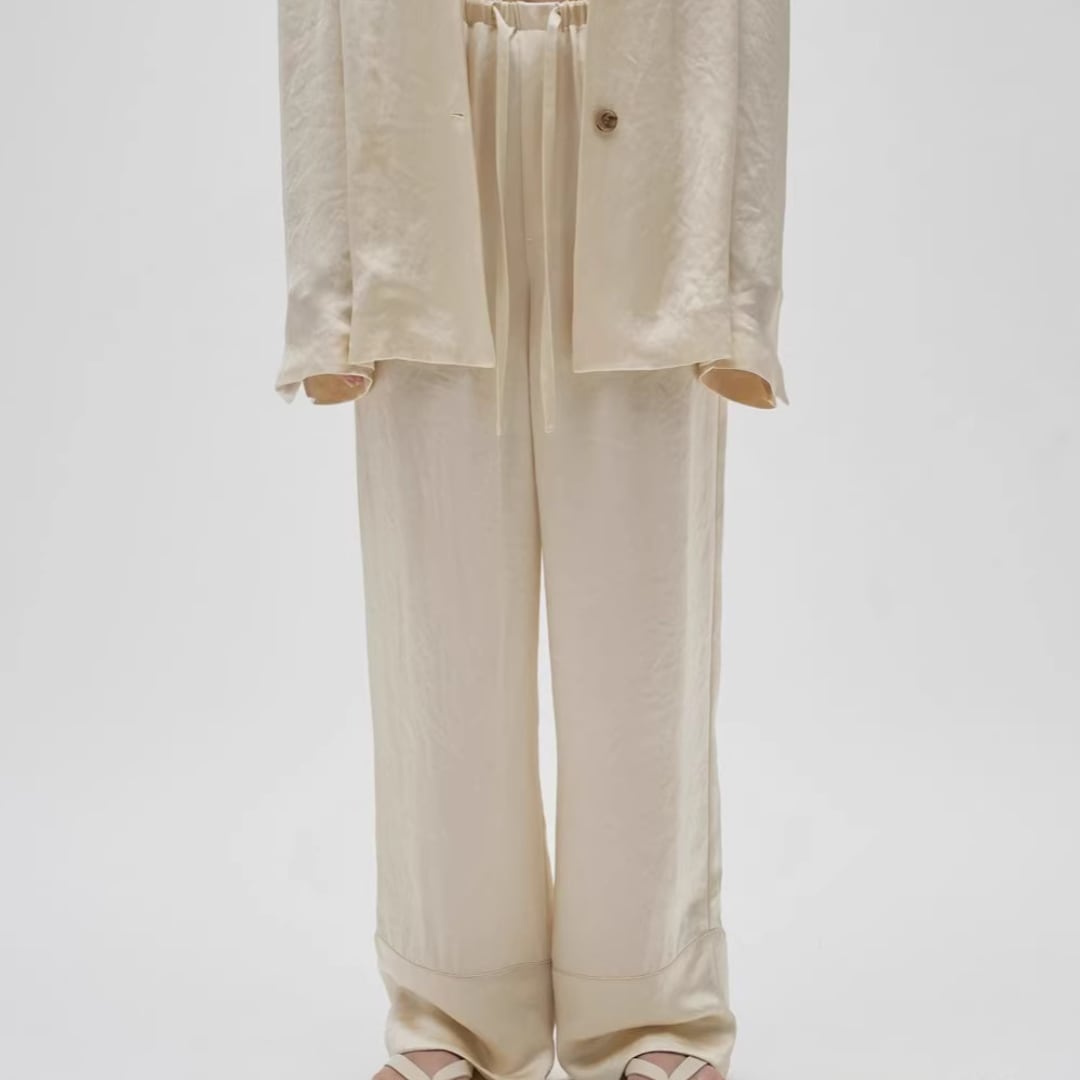 光沢感を放ち、ラグジュアリー感を漂わせるドロストパンツ。