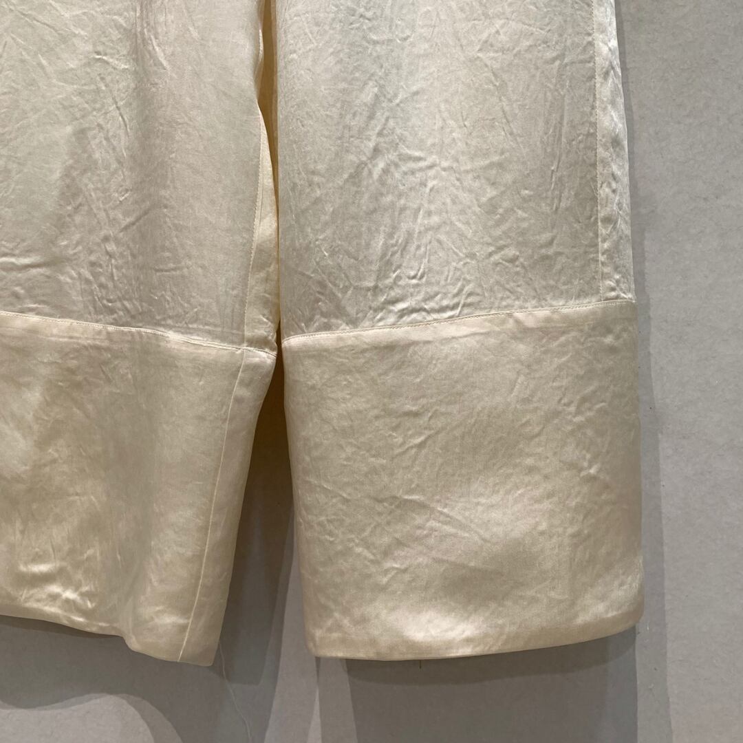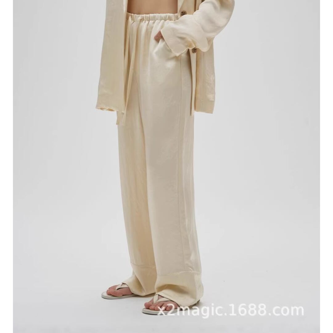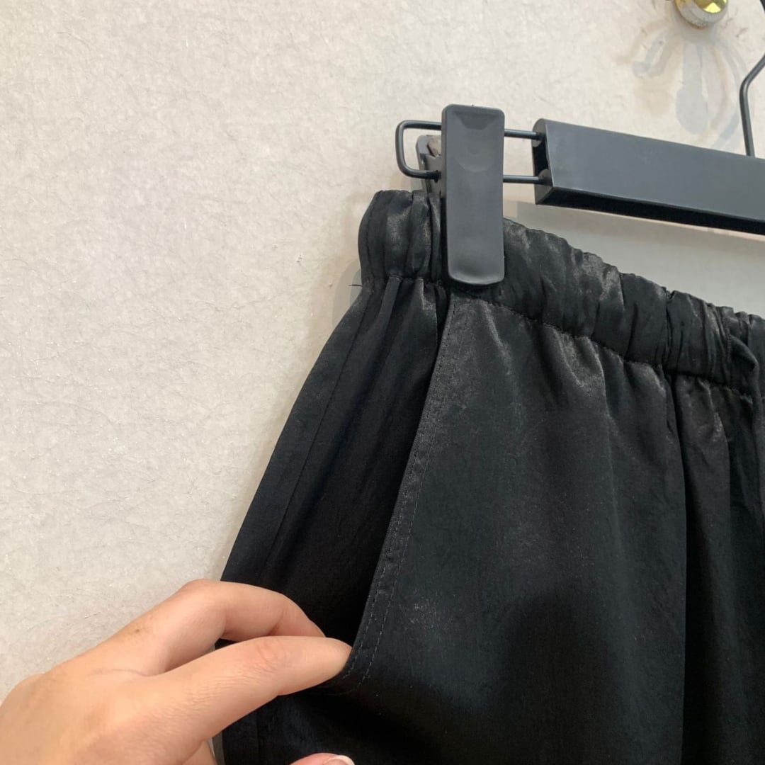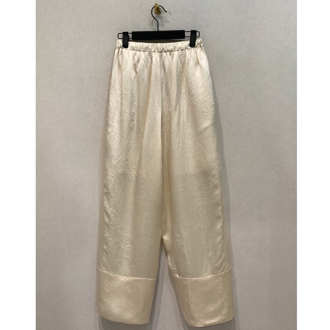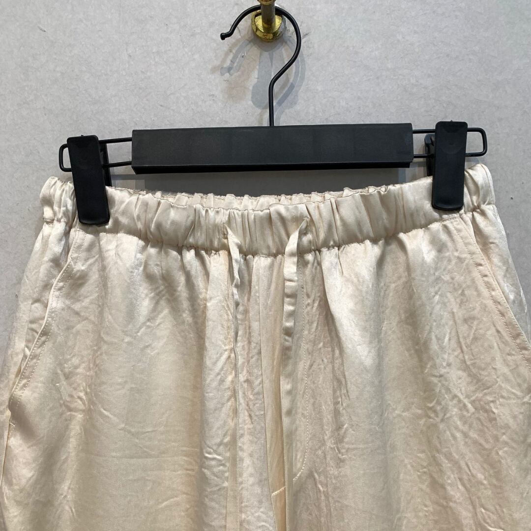 光沢感を放ち、ラグジュアリー感を漂わせるドロストパンツ。