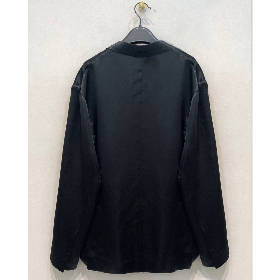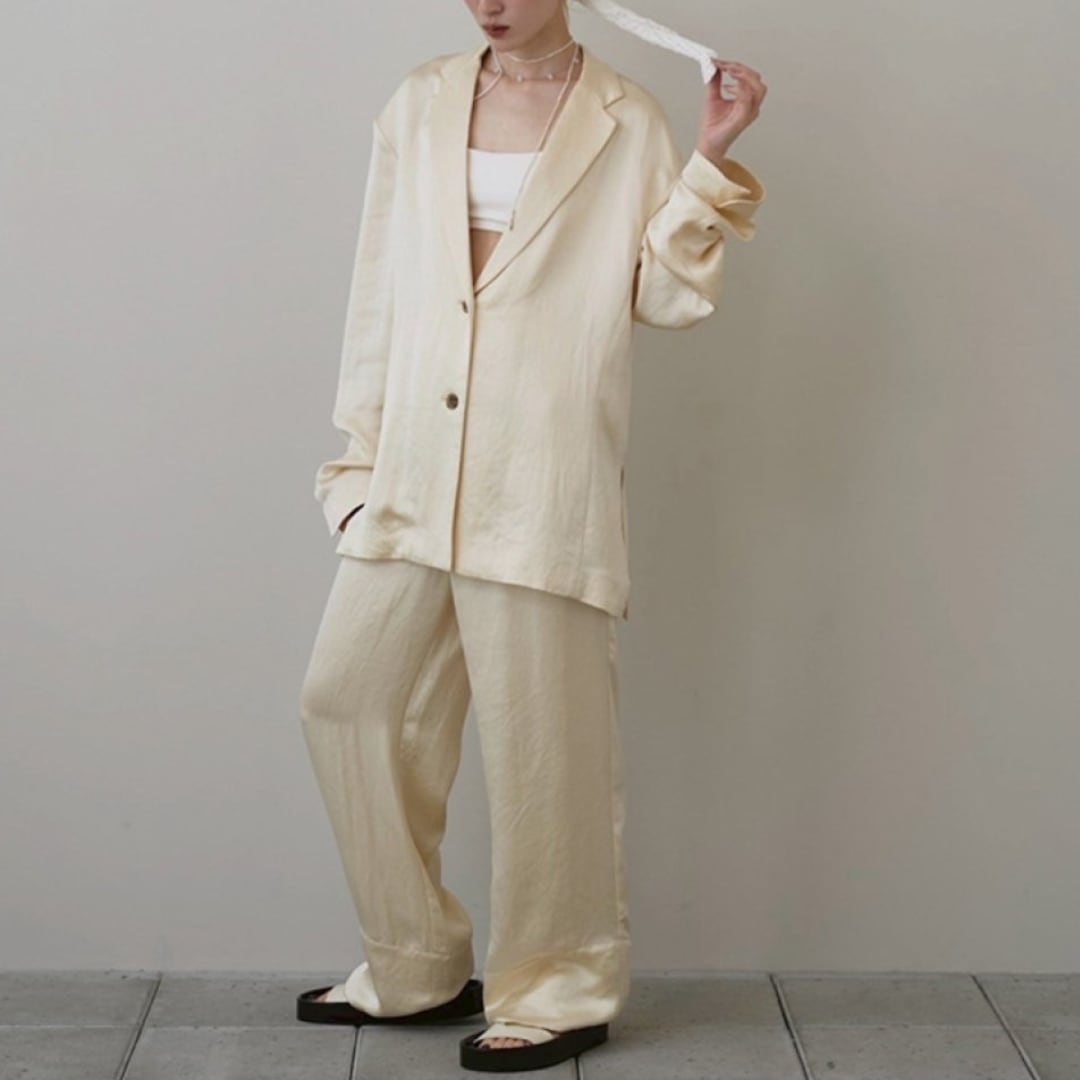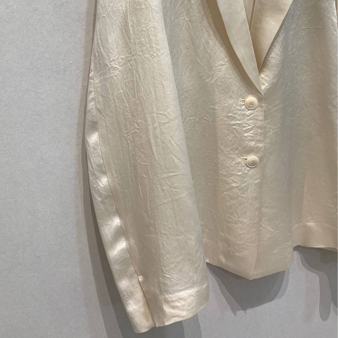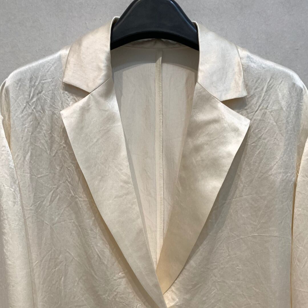 同生地のボトム「Laster wide straight drost pants(品番:G992)」とのセットアップにも対応しており、美しい光沢が非日常感を演出。肌触りが良く、さらりと軽く羽織れる1枚です。