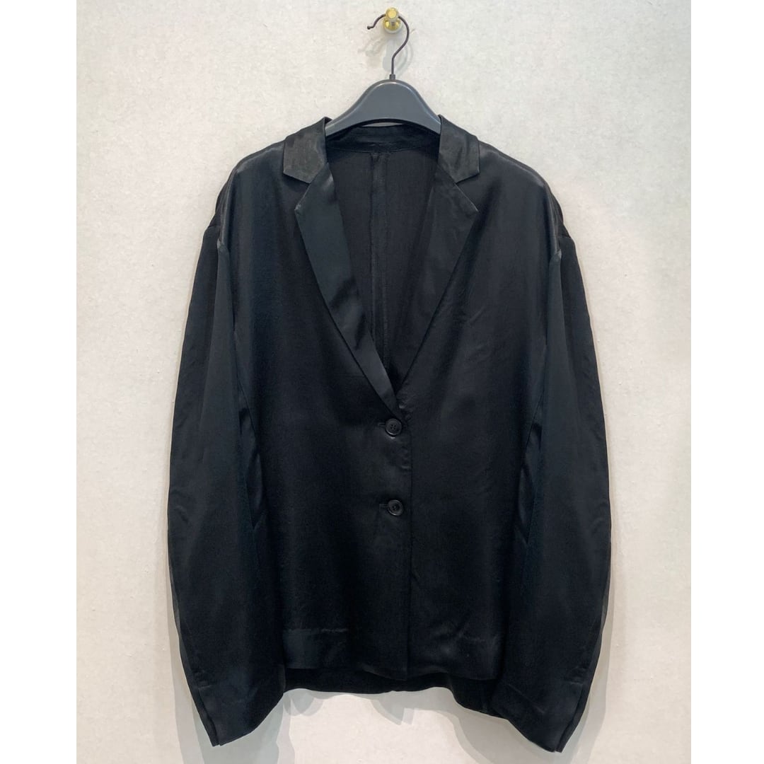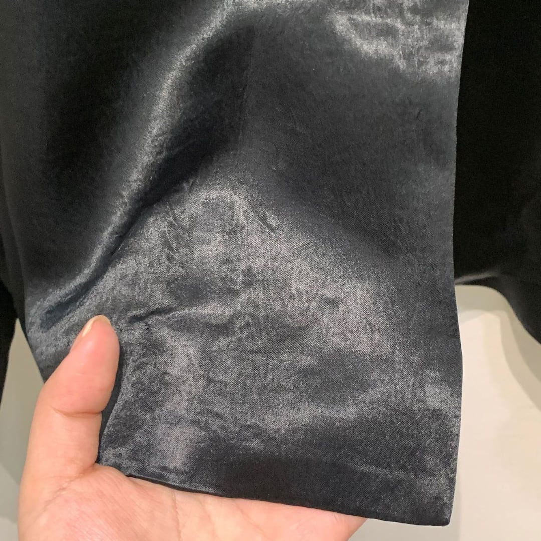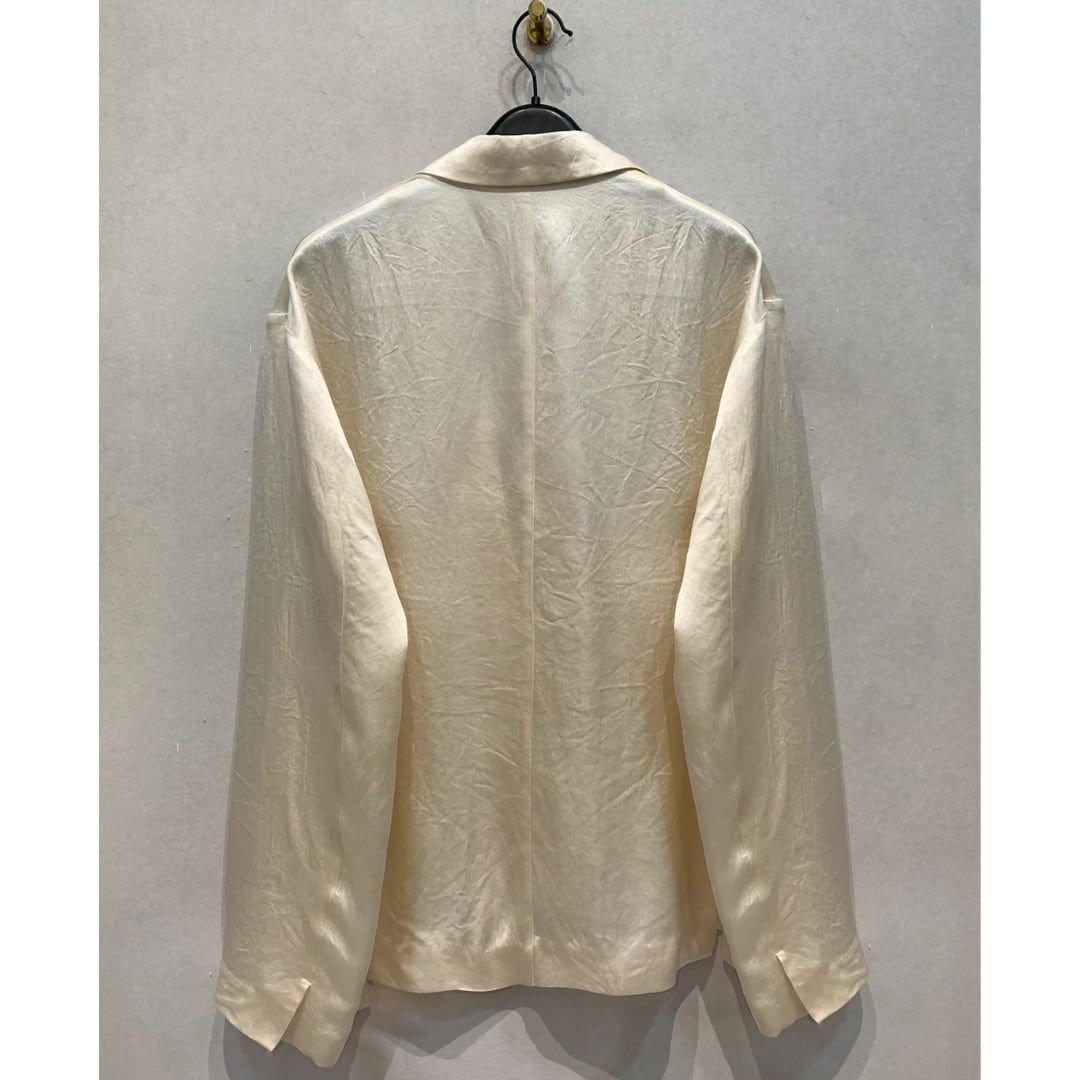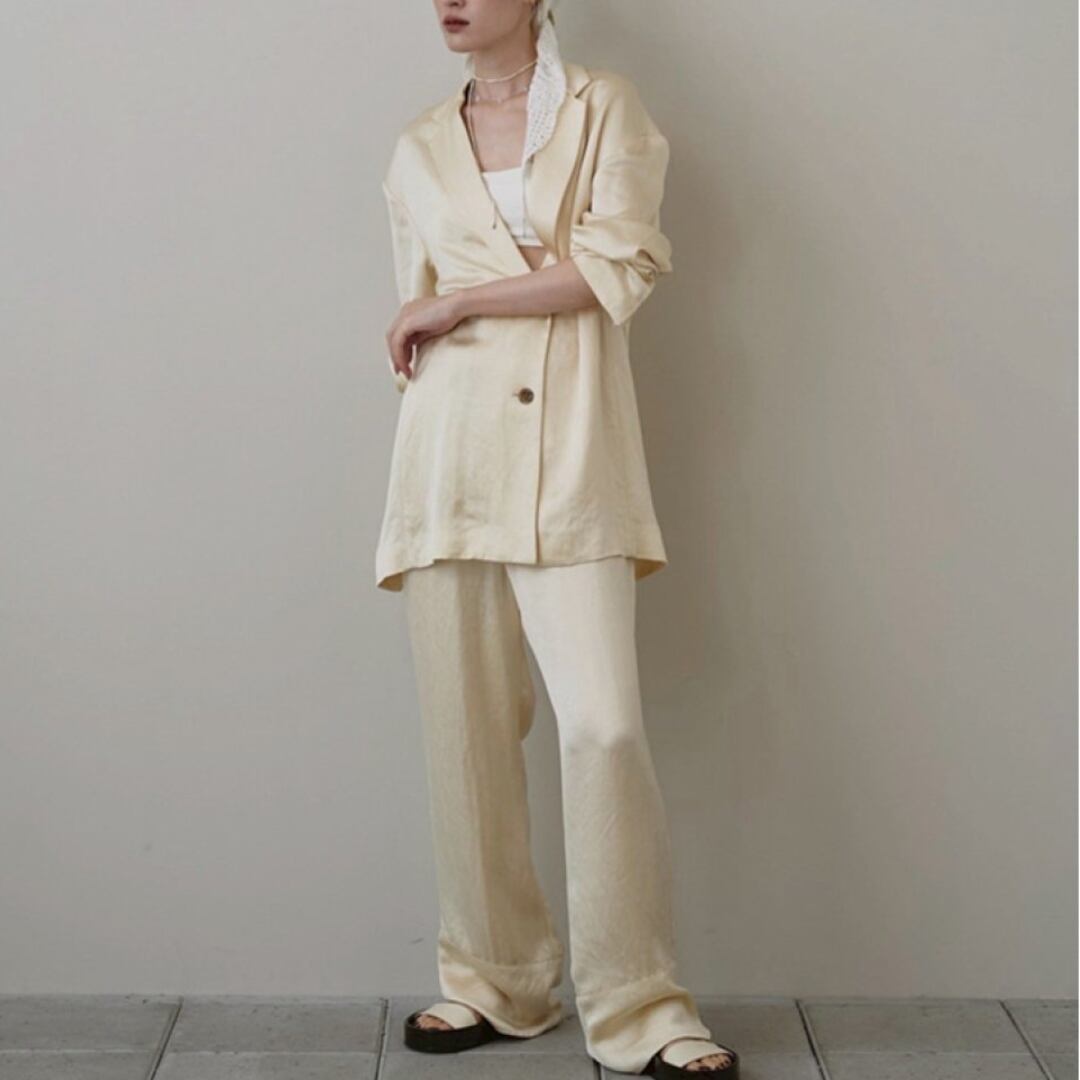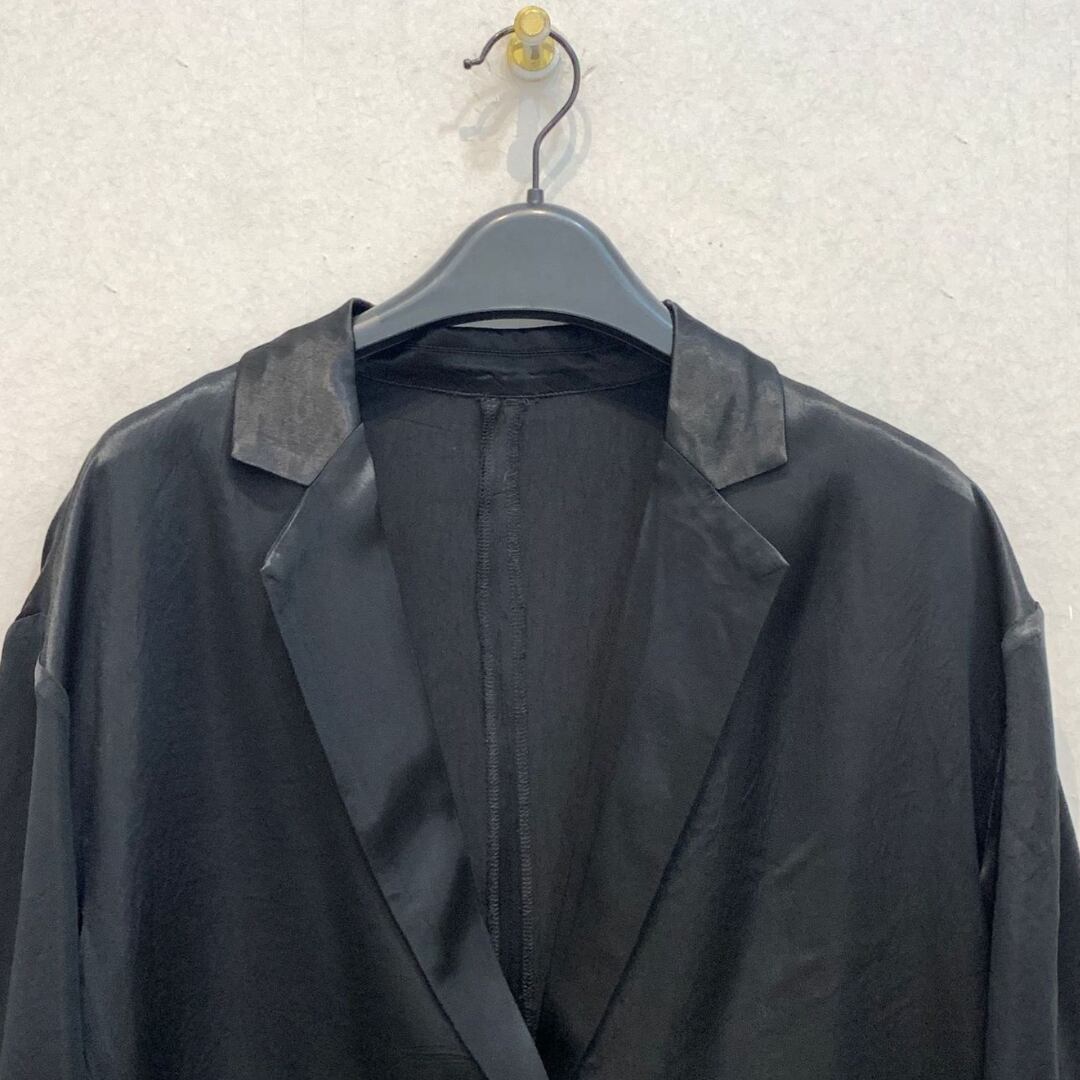 同生地のボトム「Laster wide straight drost pants(品番:G992)」とのセットアップにも対応しており、美しい光沢が非日常感を演出。肌触りが良く、さらりと軽く羽織れる1枚です。