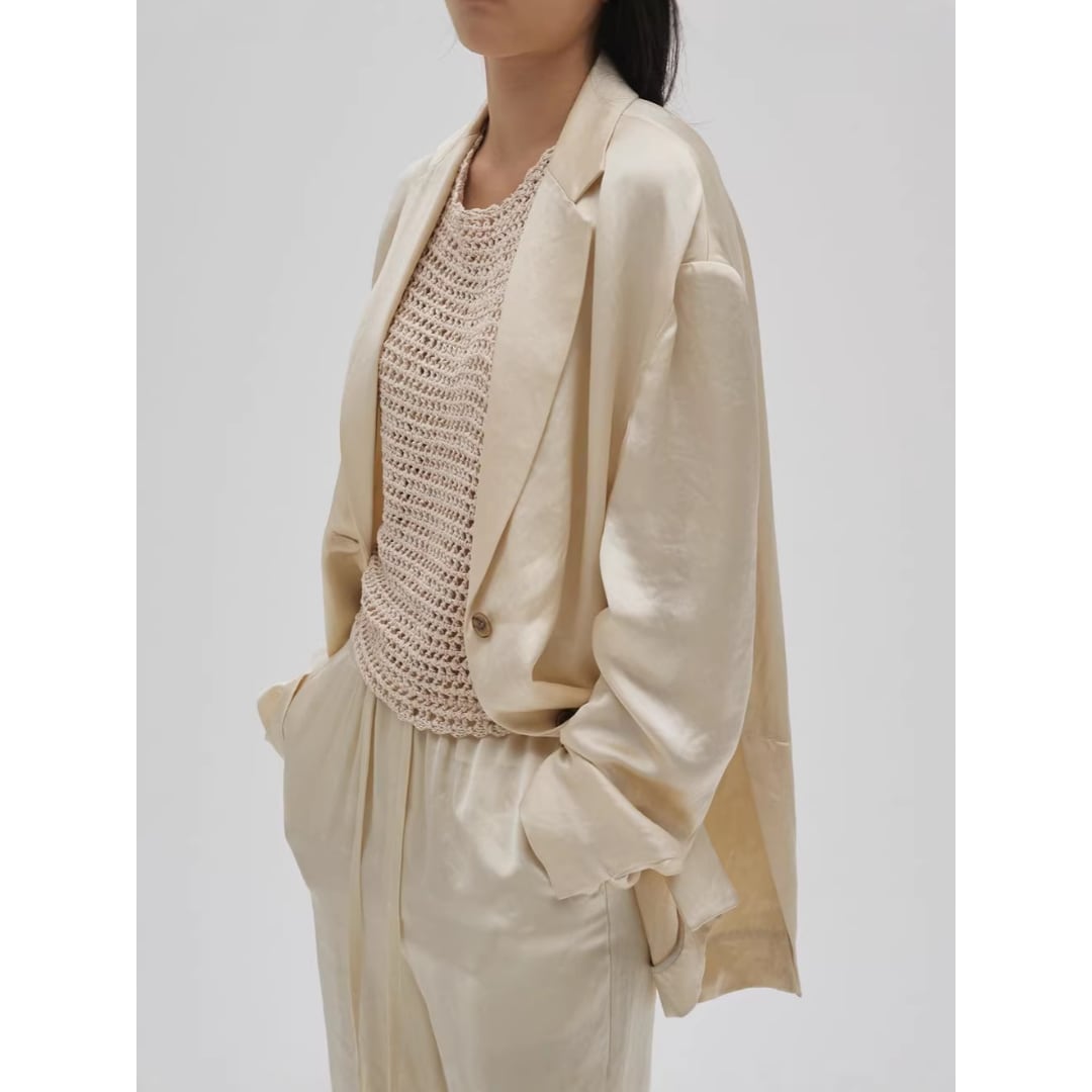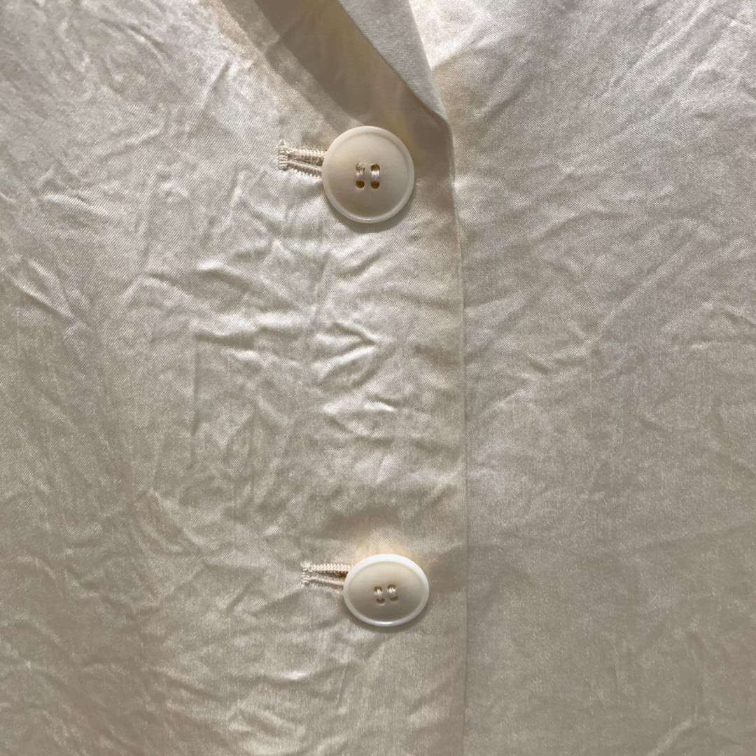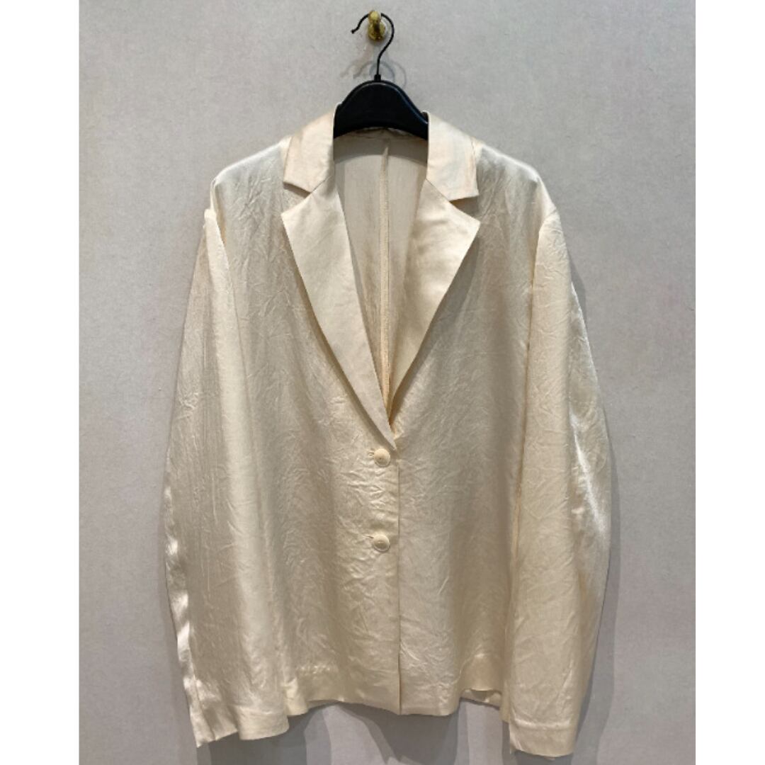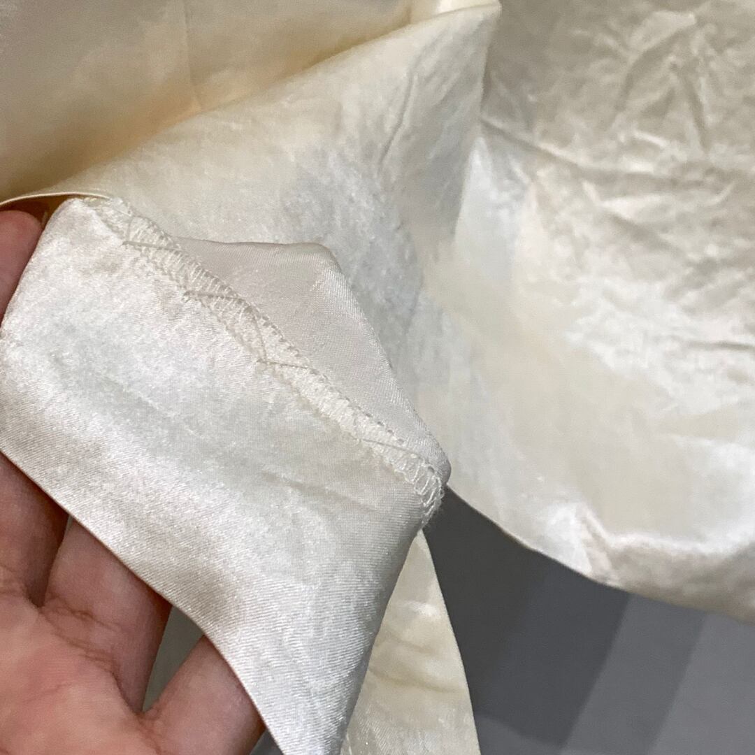 同生地のボトム「Laster wide straight drost pants(品番:G992)」とのセットアップにも対応しており、美しい光沢が非日常感を演出。肌触りが良く、さらりと軽く羽織れる1枚です。