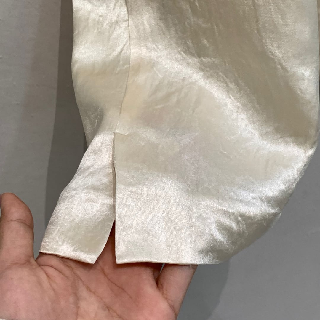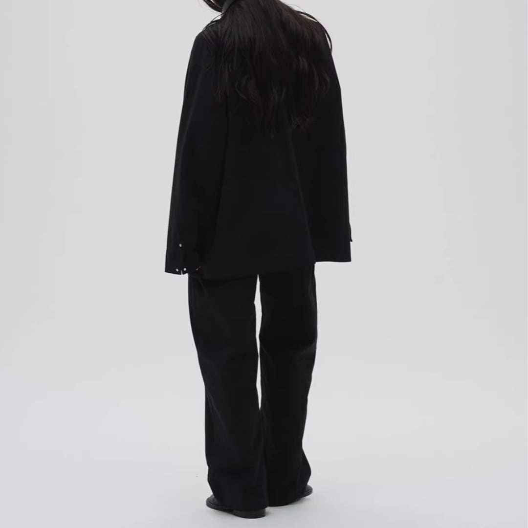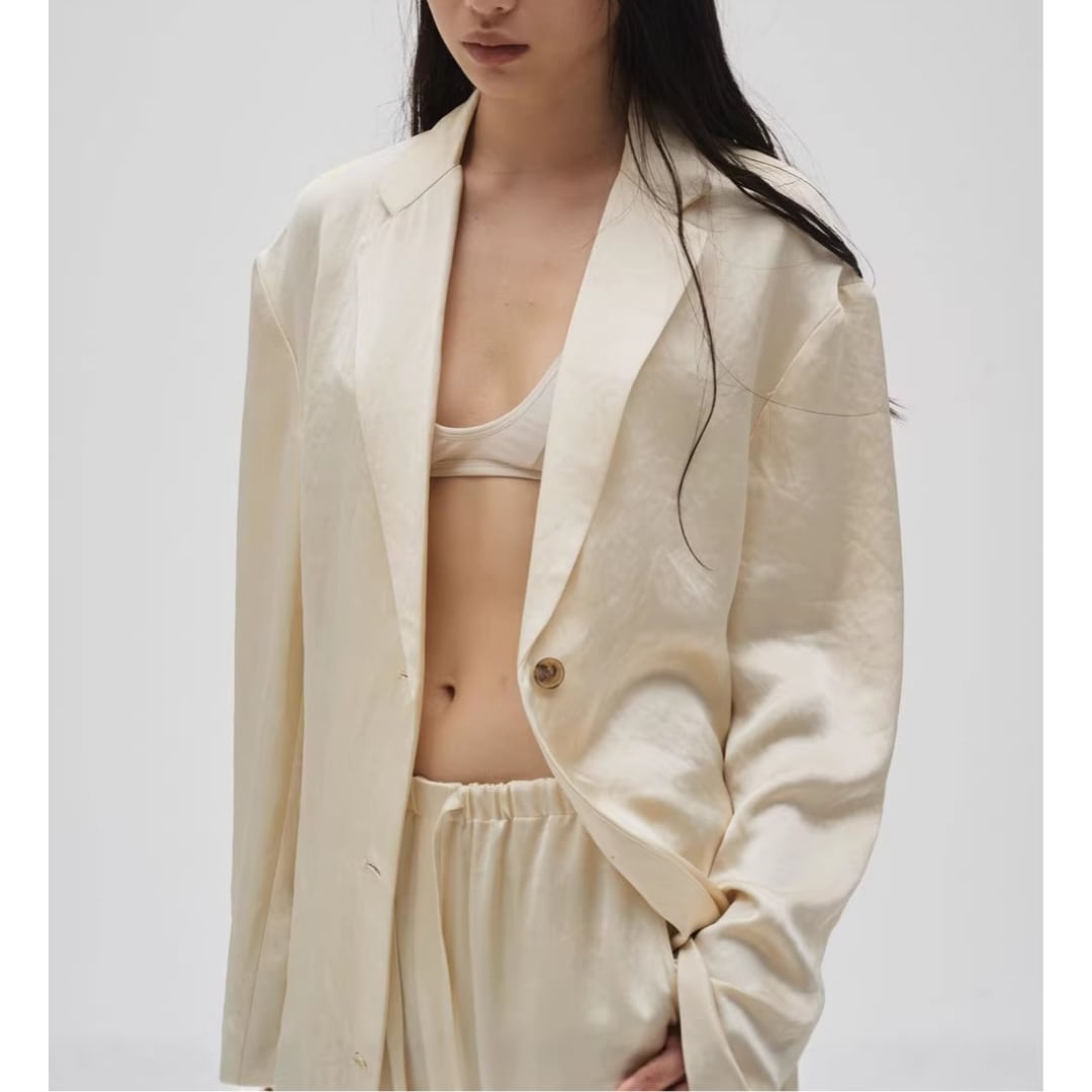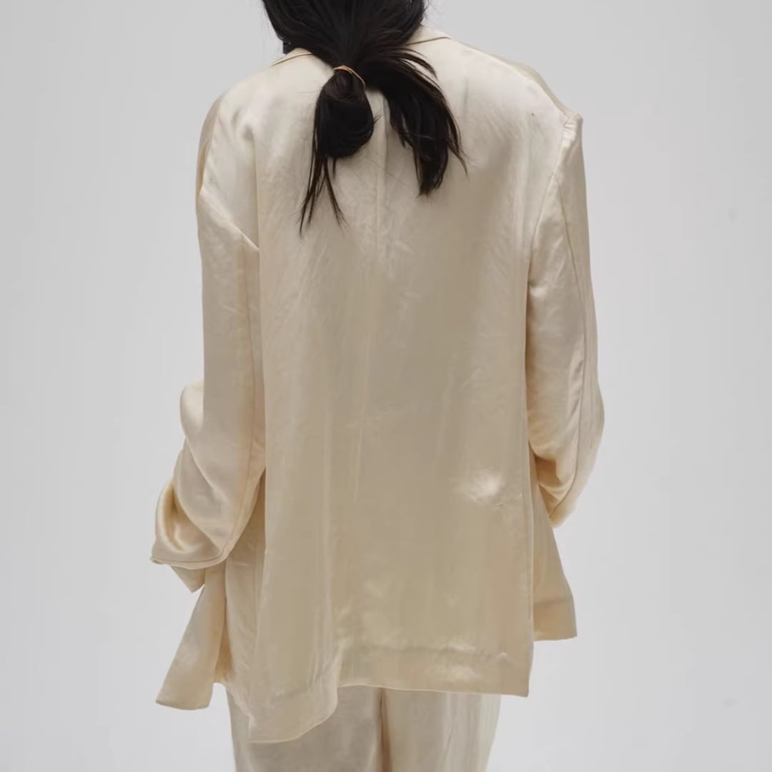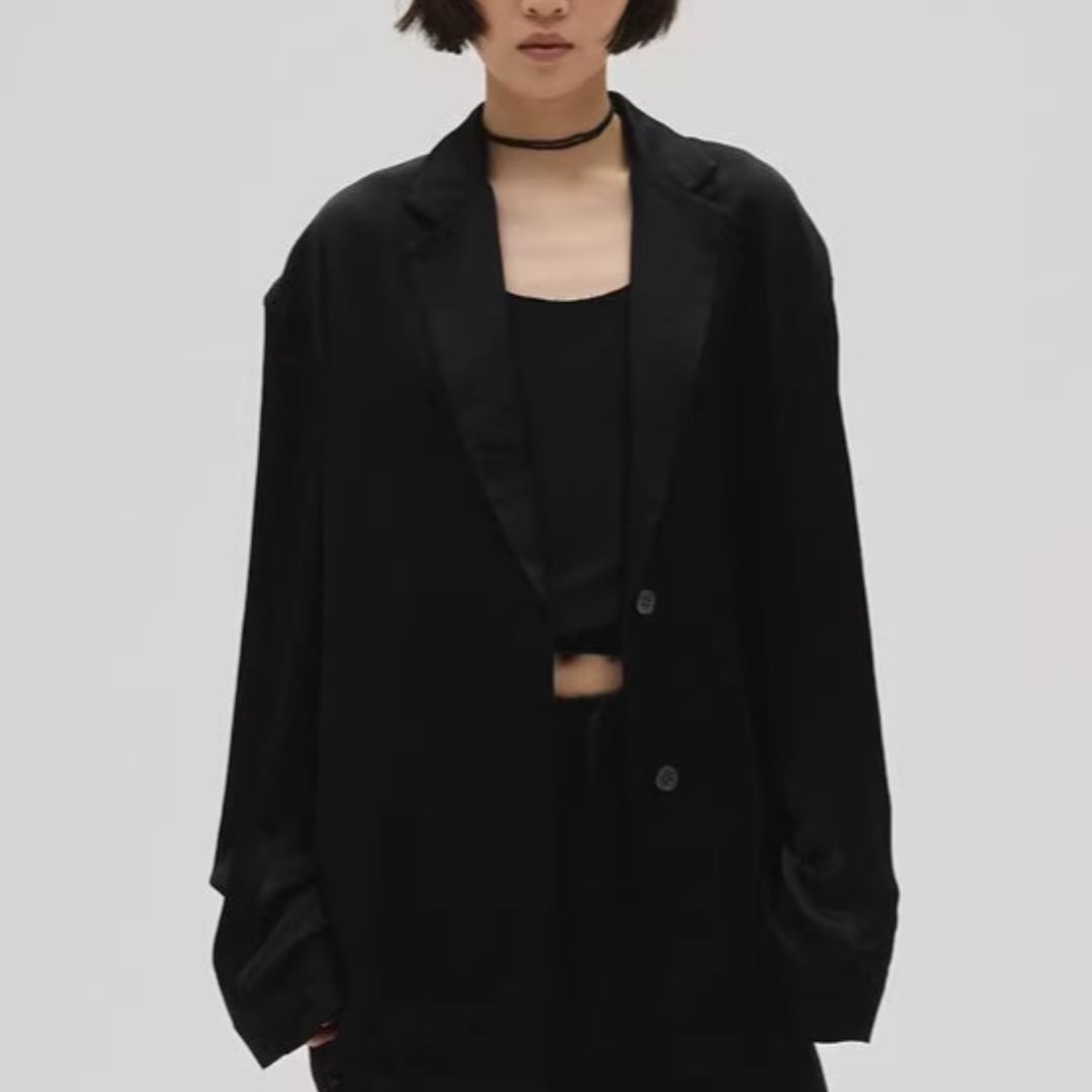 同生地のボトム「Laster wide straight drost pants(品番:G992)」とのセットアップにも対応しており、美しい光沢が非日常感を演出。肌触りが良く、さらりと軽く羽織れる1枚です。