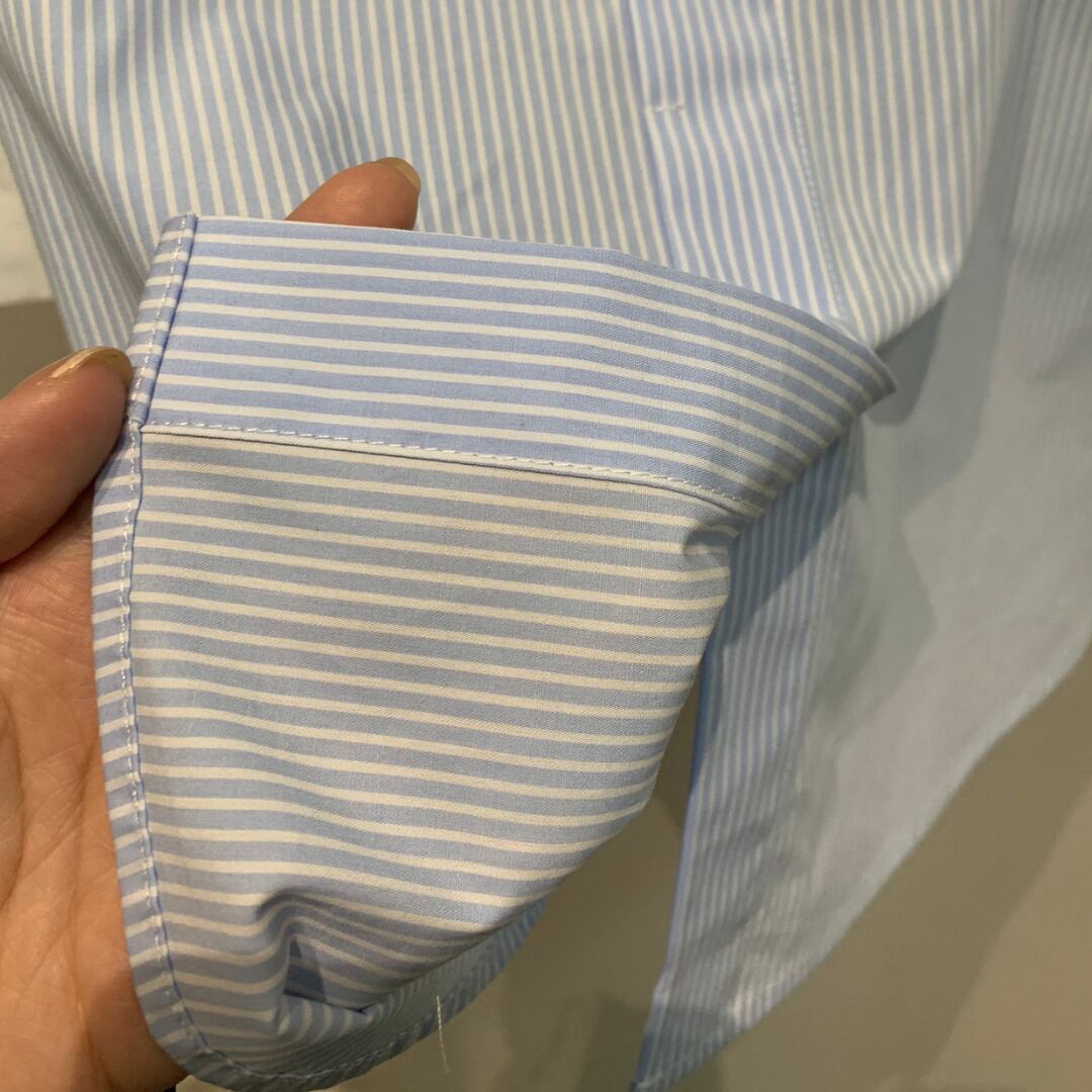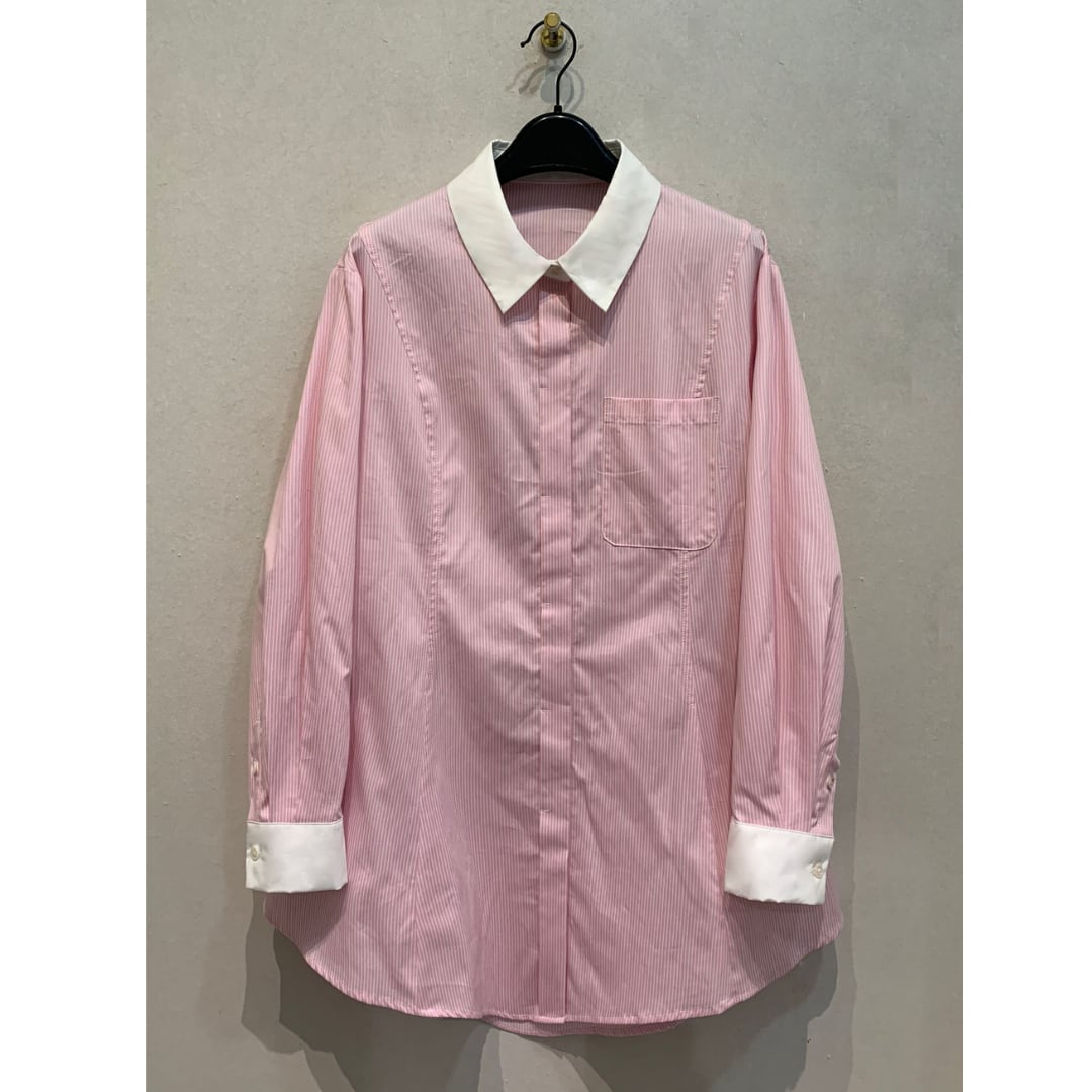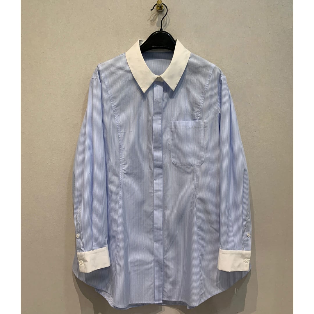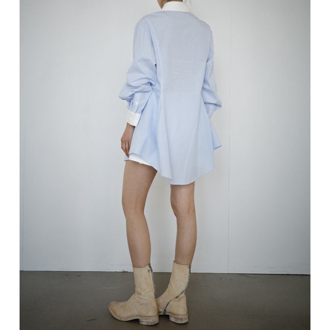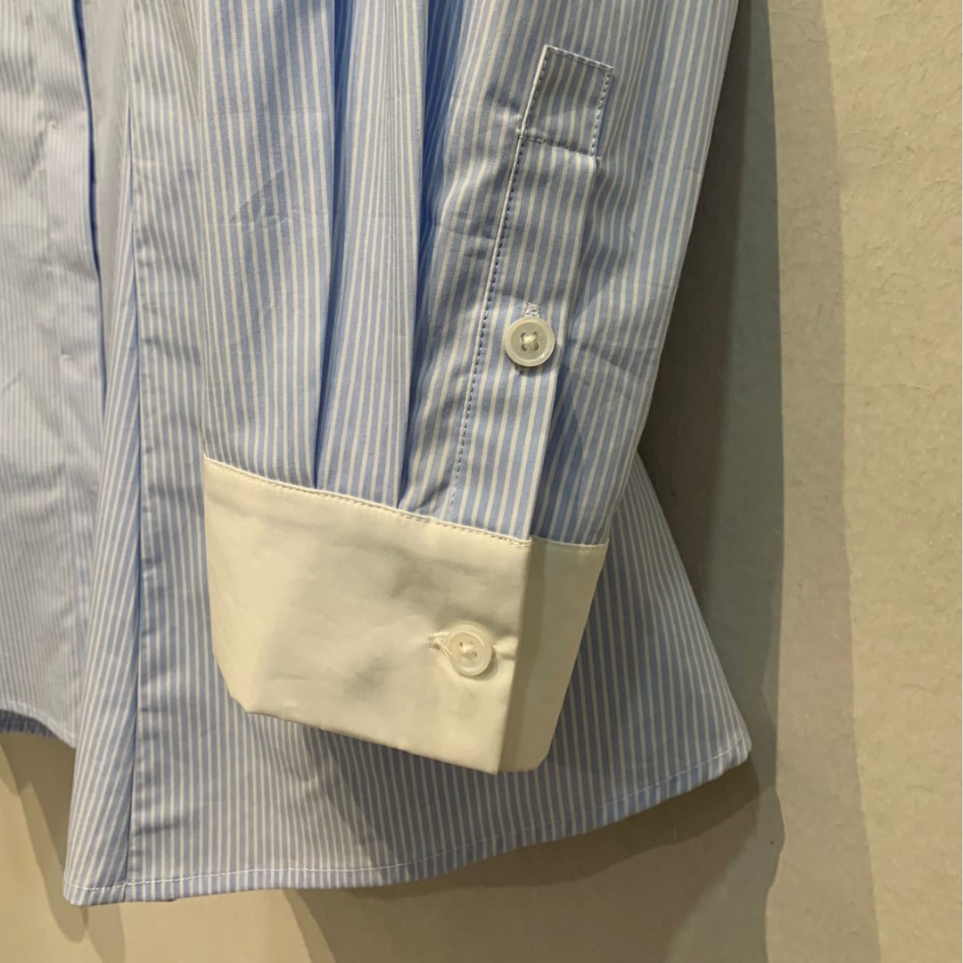 白シャツとストライプシャツを重ね着をしたように見えるフェイクレイヤードシャツ。