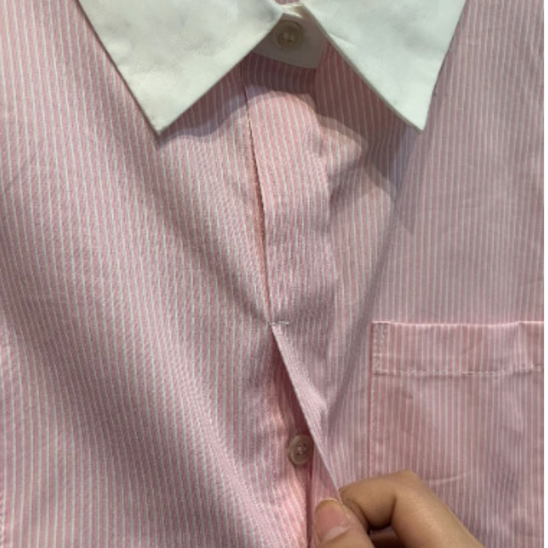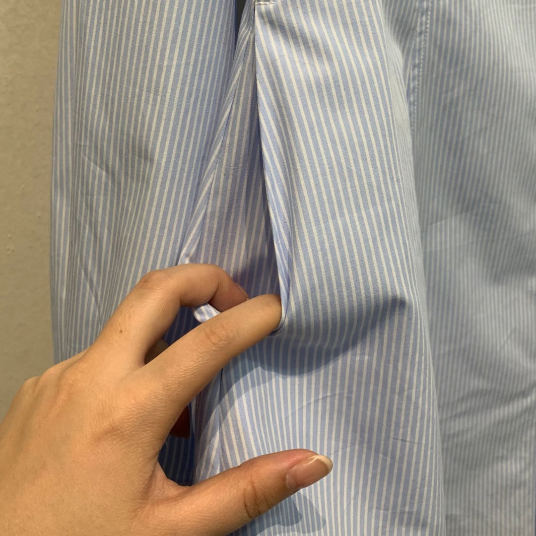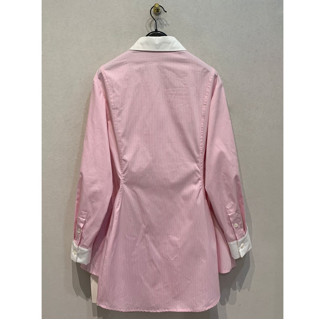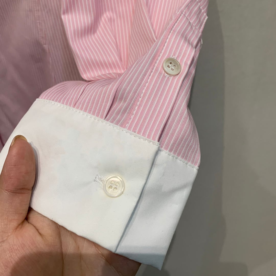 白シャツとストライプシャツを重ね着をしたように見えるフェイクレイヤードシャツ。