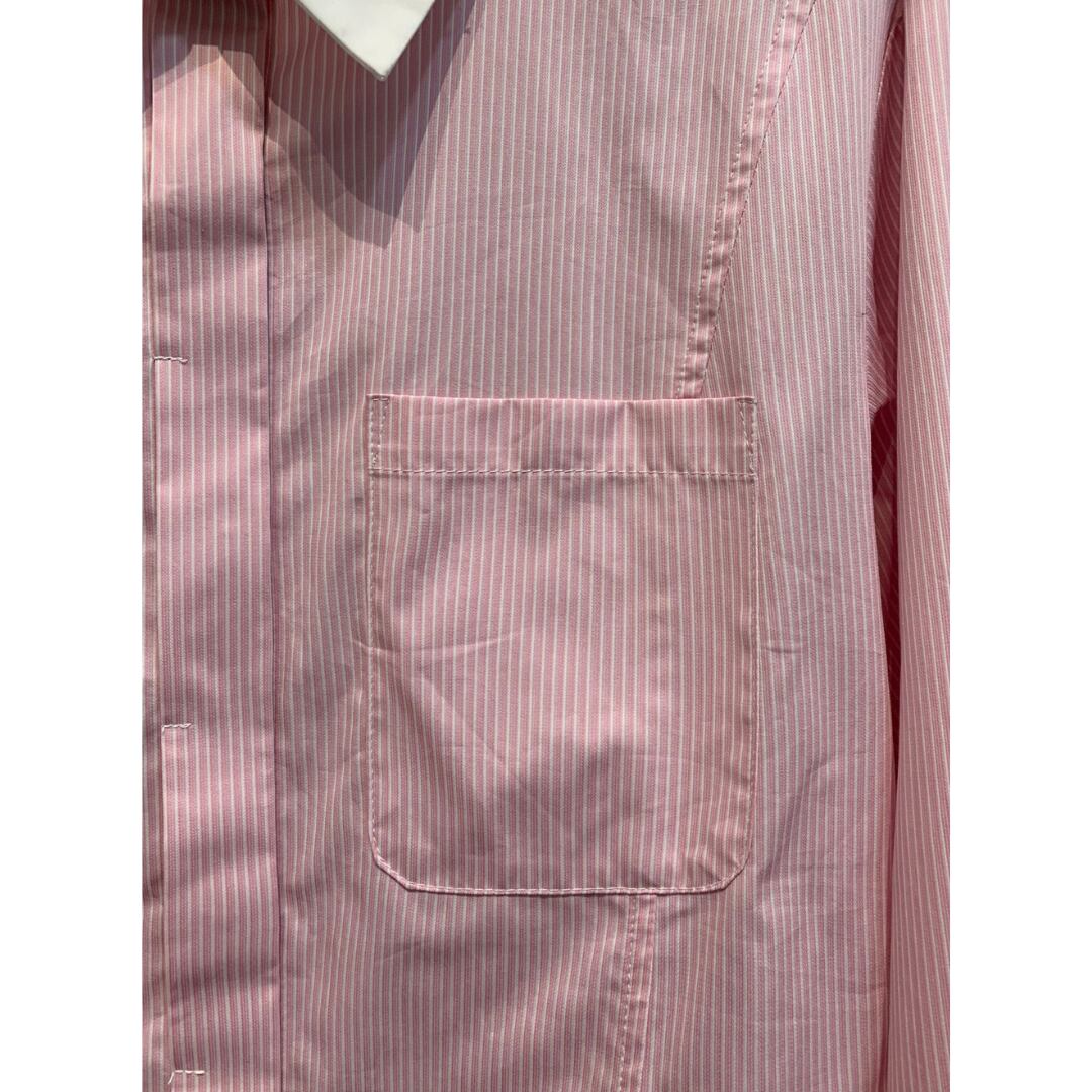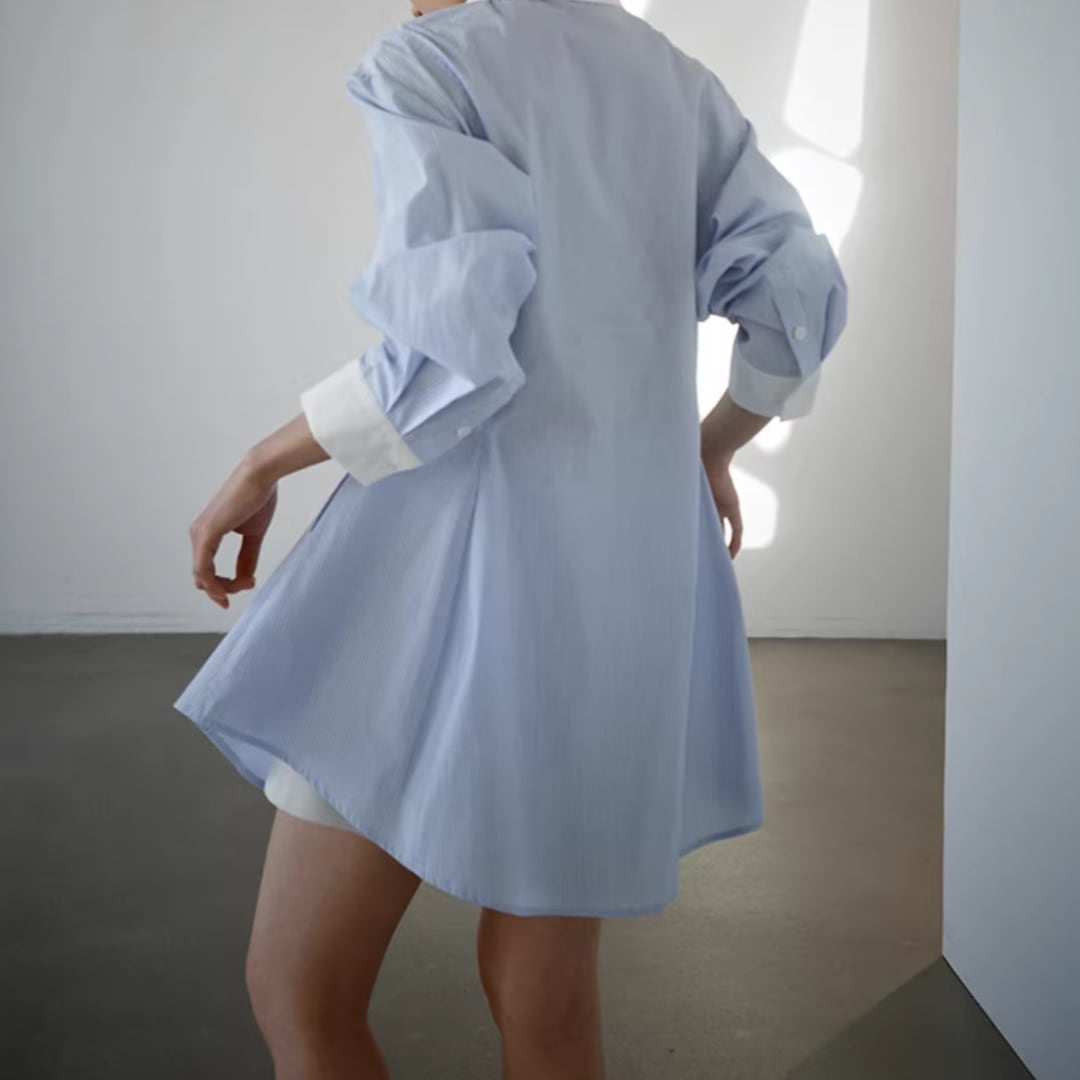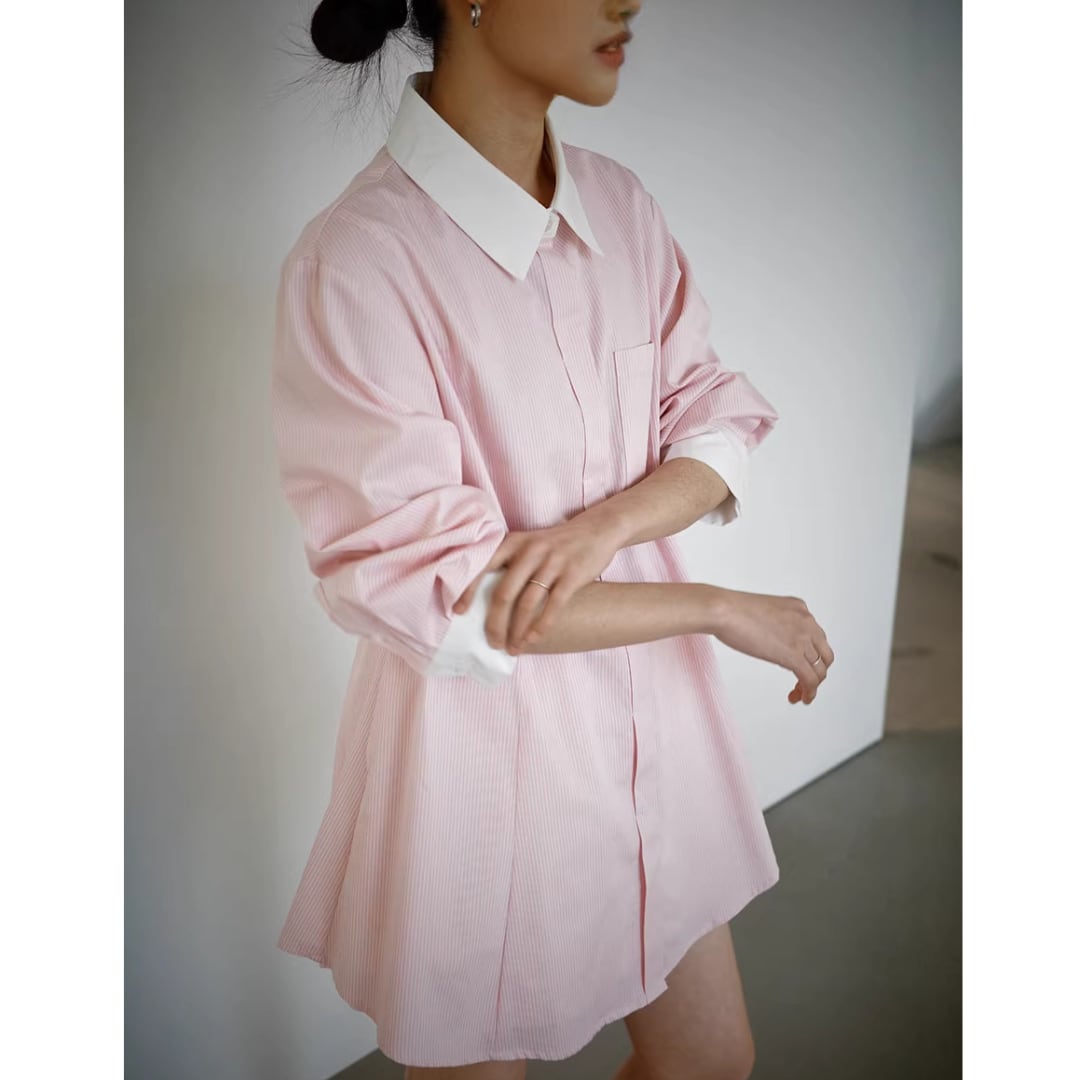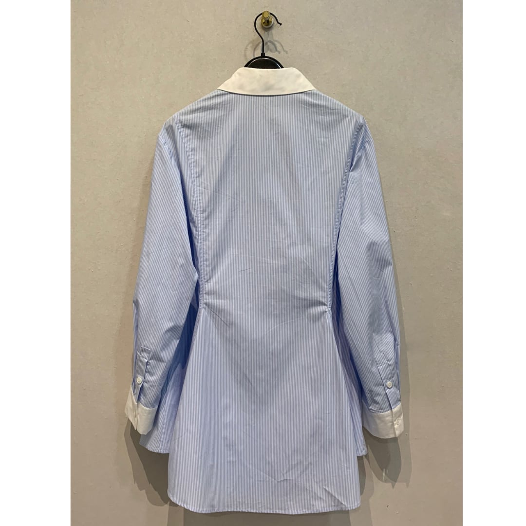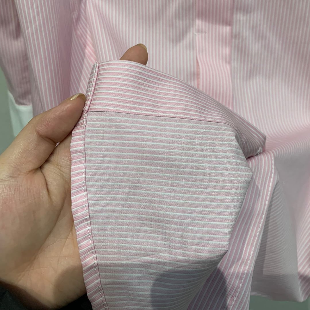 白シャツとストライプシャツを重ね着をしたように見えるフェイクレイヤードシャツ。