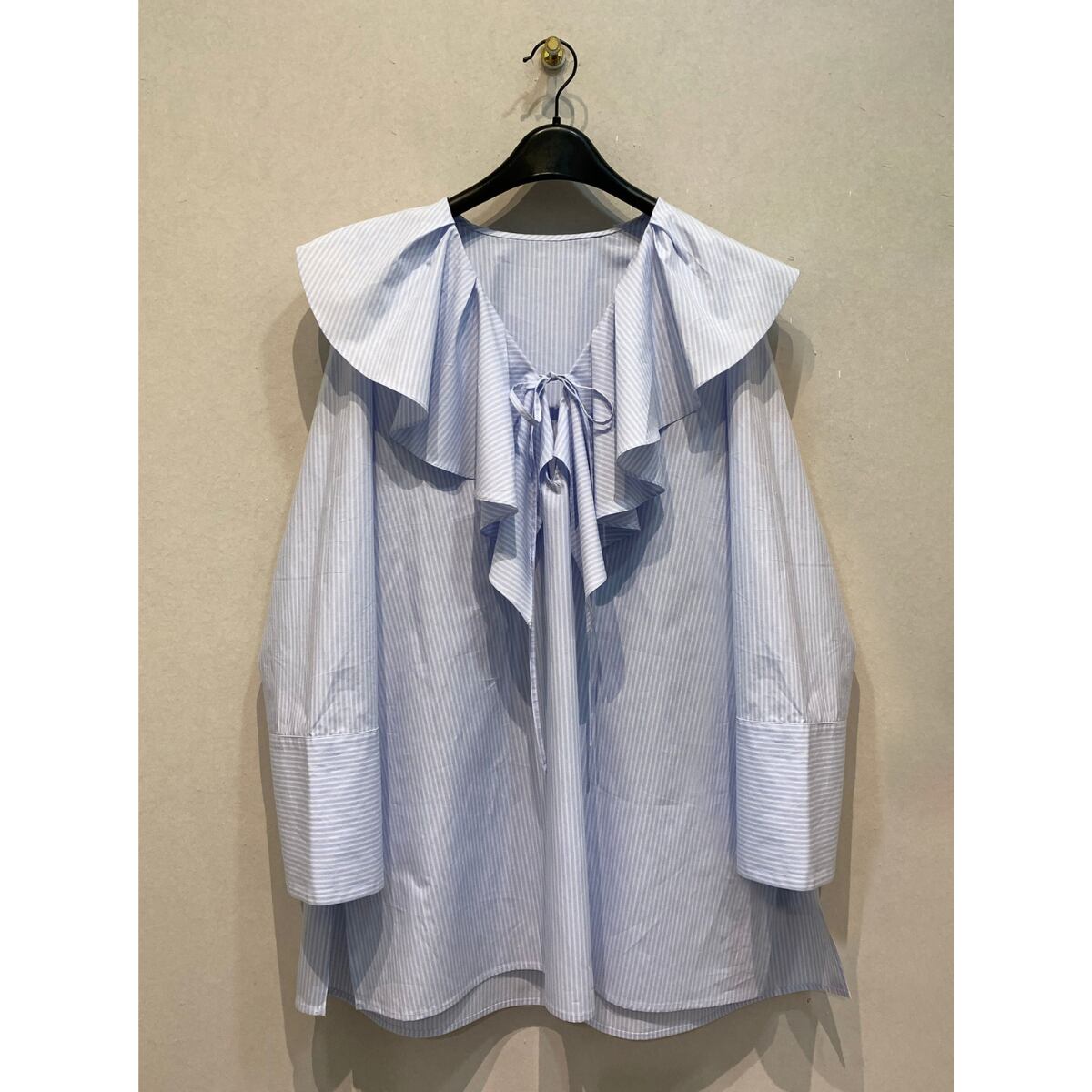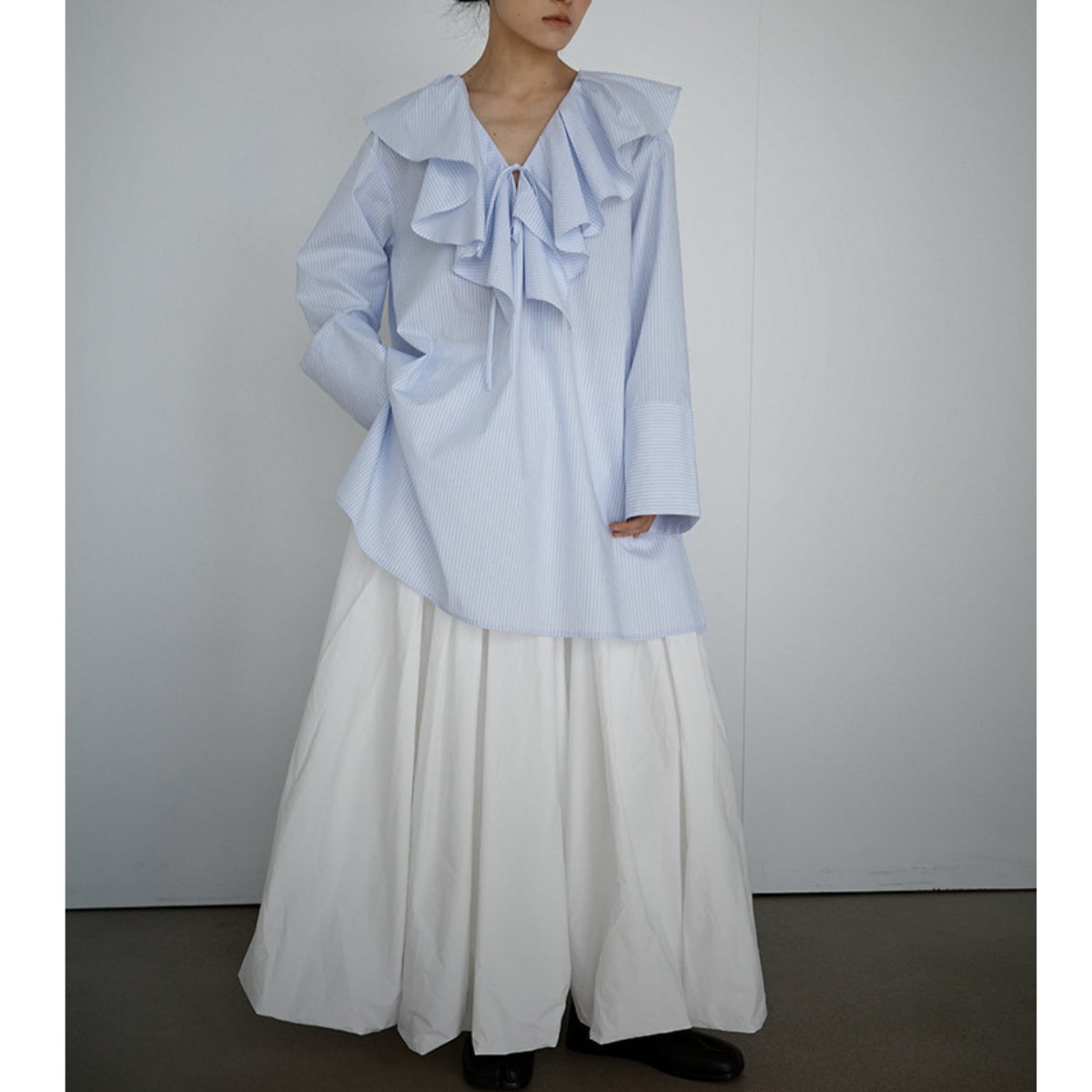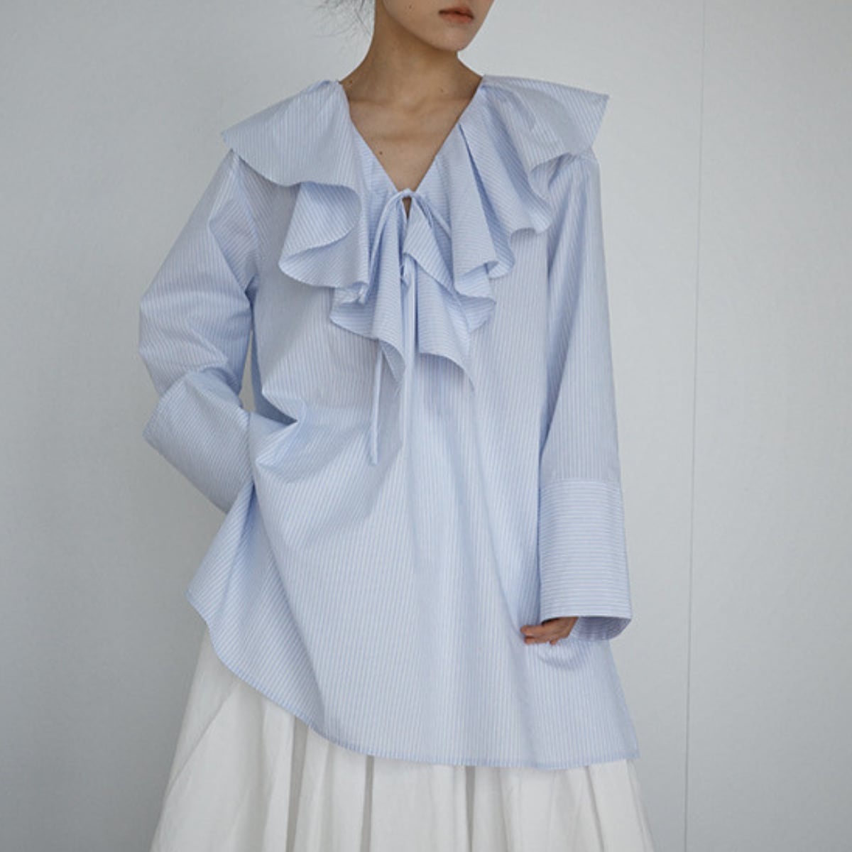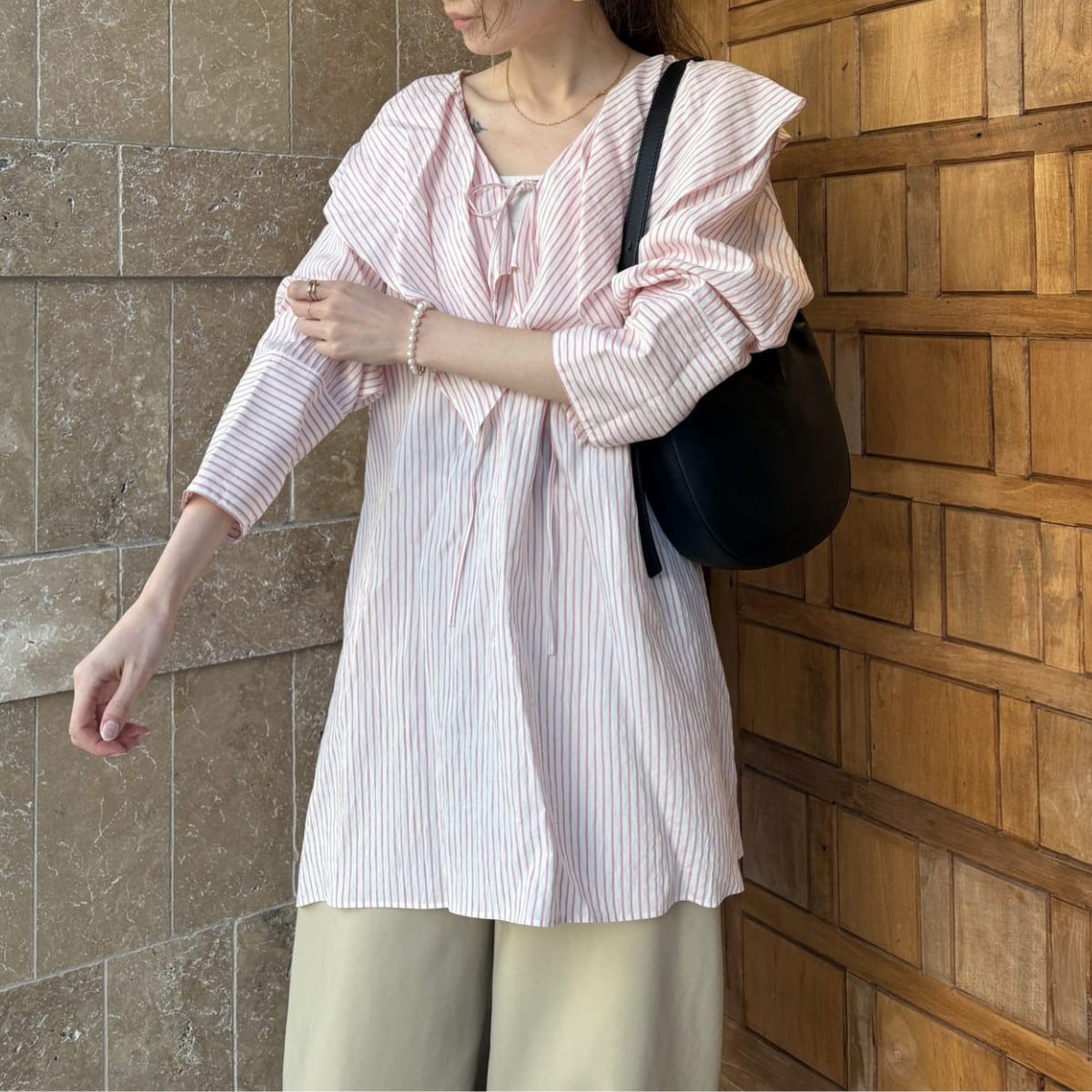柔らかな色合いのストライプが爽やかな印象のラッフルカラーブラウス。