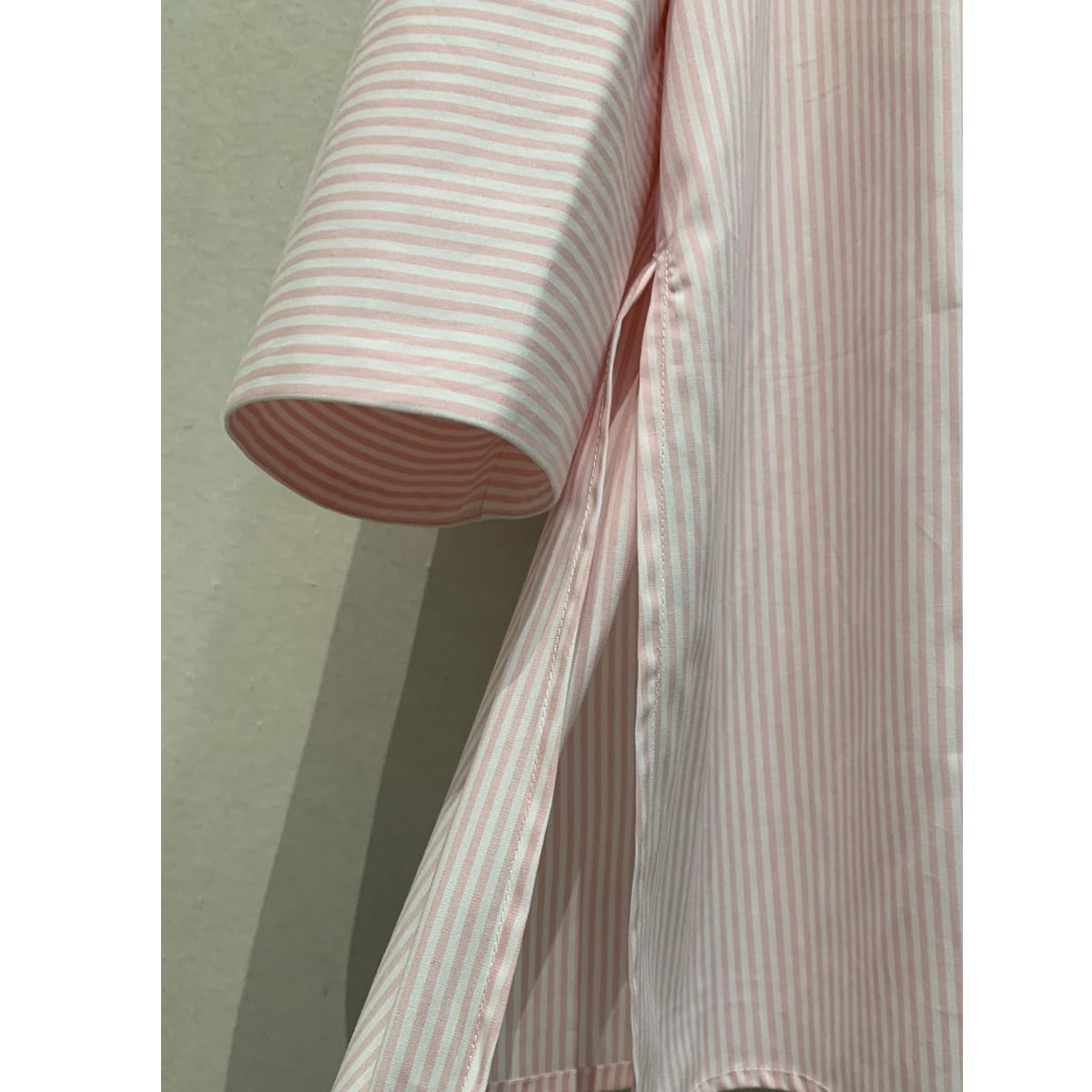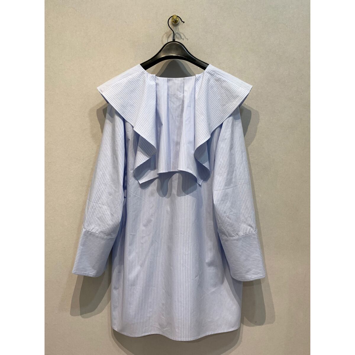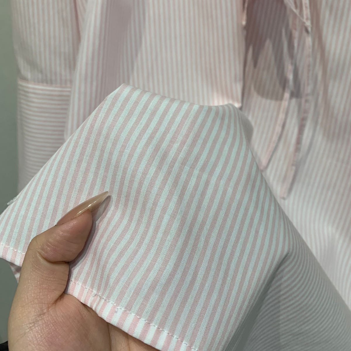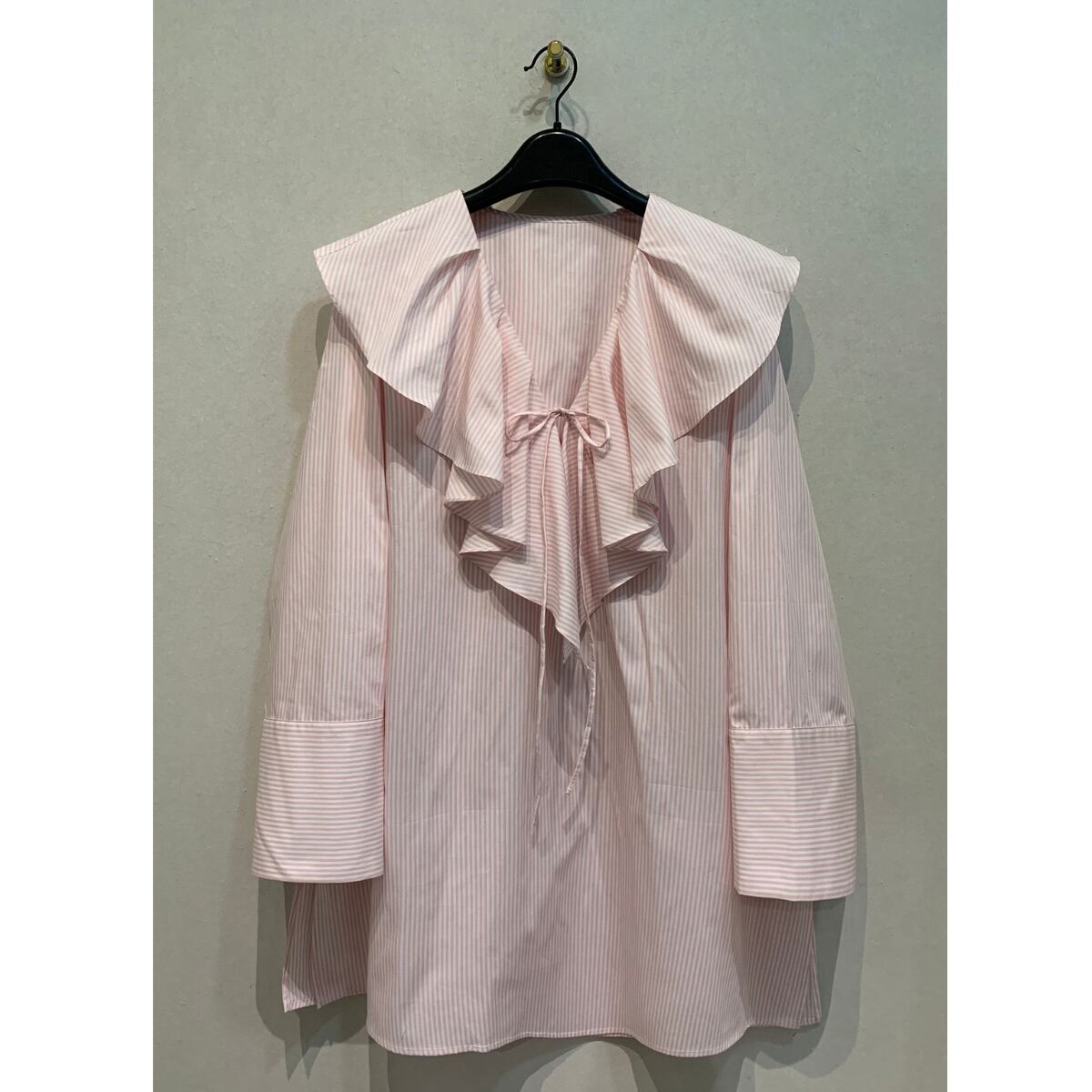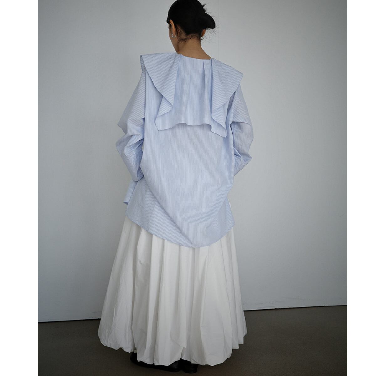 柔らかな色合いのストライプが爽やかな印象のラッフルカラーブラウス。