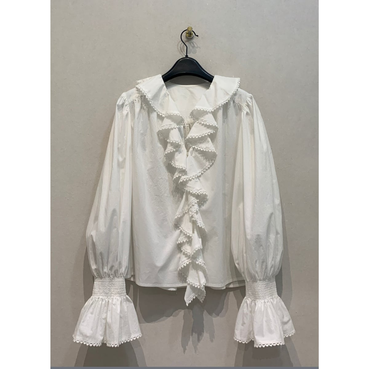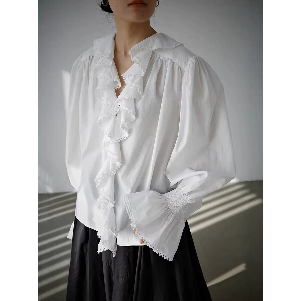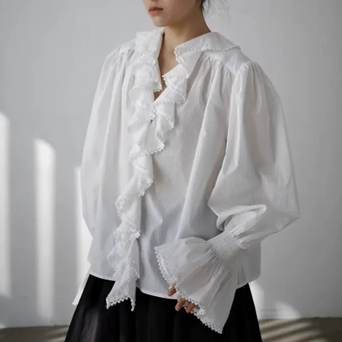 繊細なレースフリルが上品な印象のホワイトブラウス。