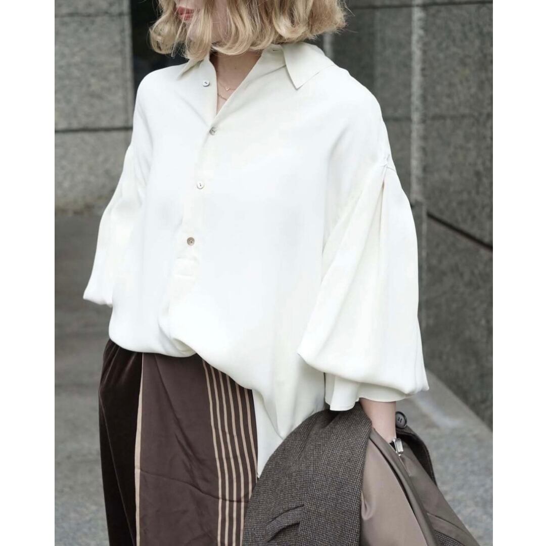 たっぷりとボーリュームを持たせた袖のデザインが、仕草を優雅に見せてくれる華やかなブラウスです。