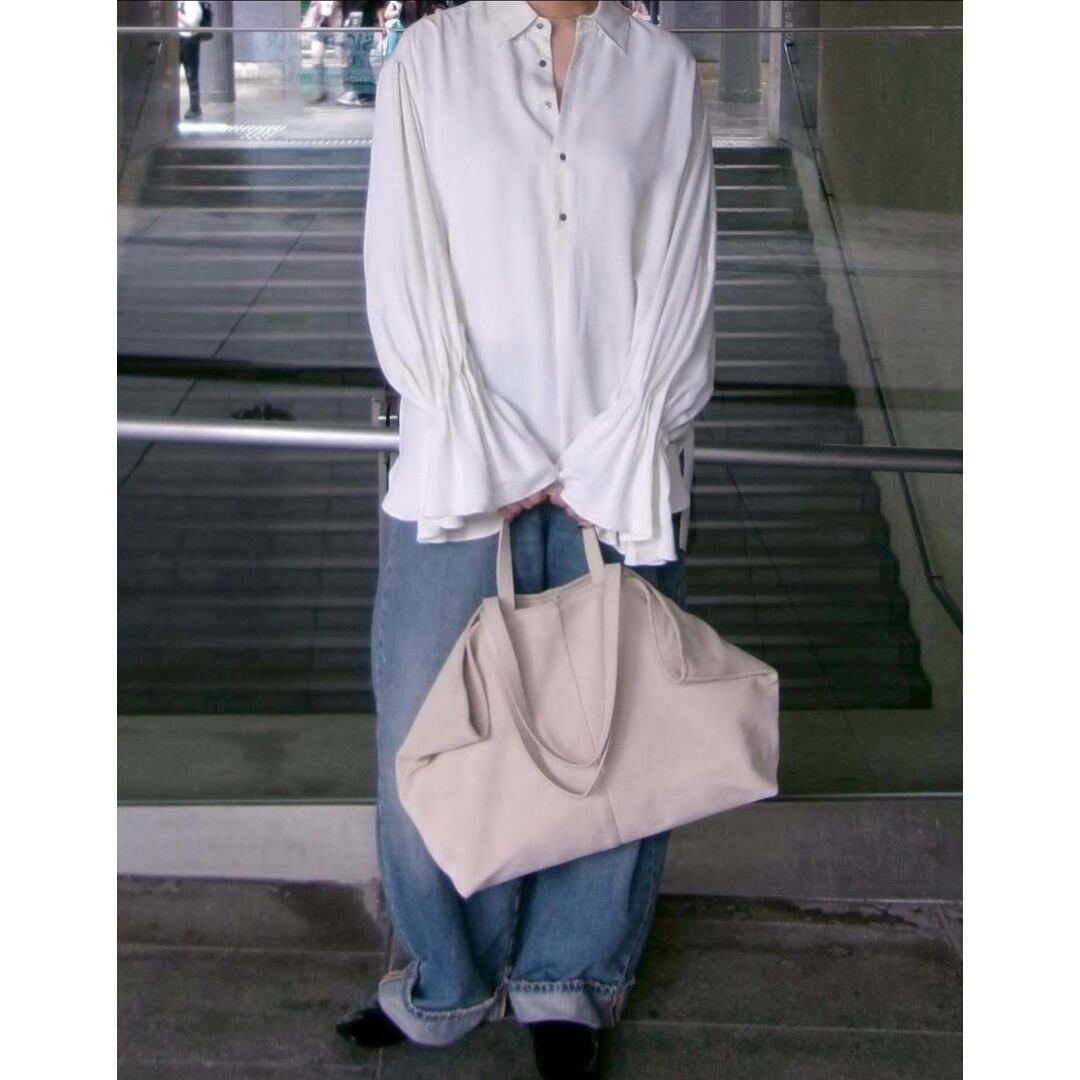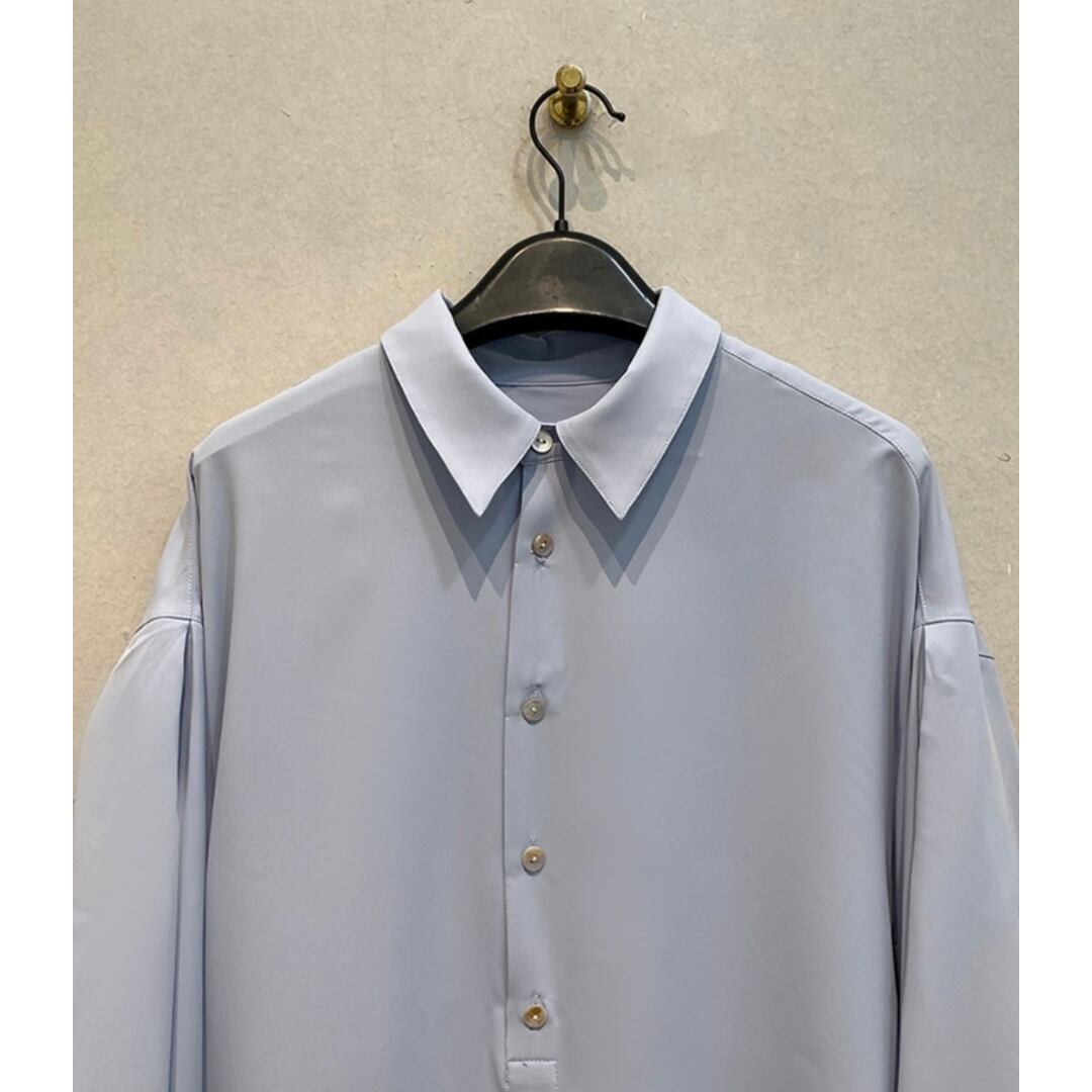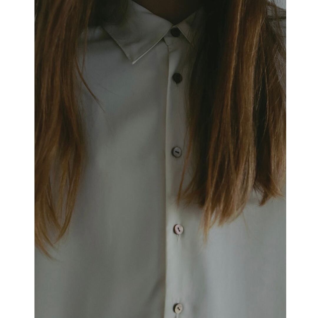 清潔感のある生地が上品な印象を与え、ボトムスにインしてもアウトしてもバランスよく決まる、着回し力の高い一枚です。