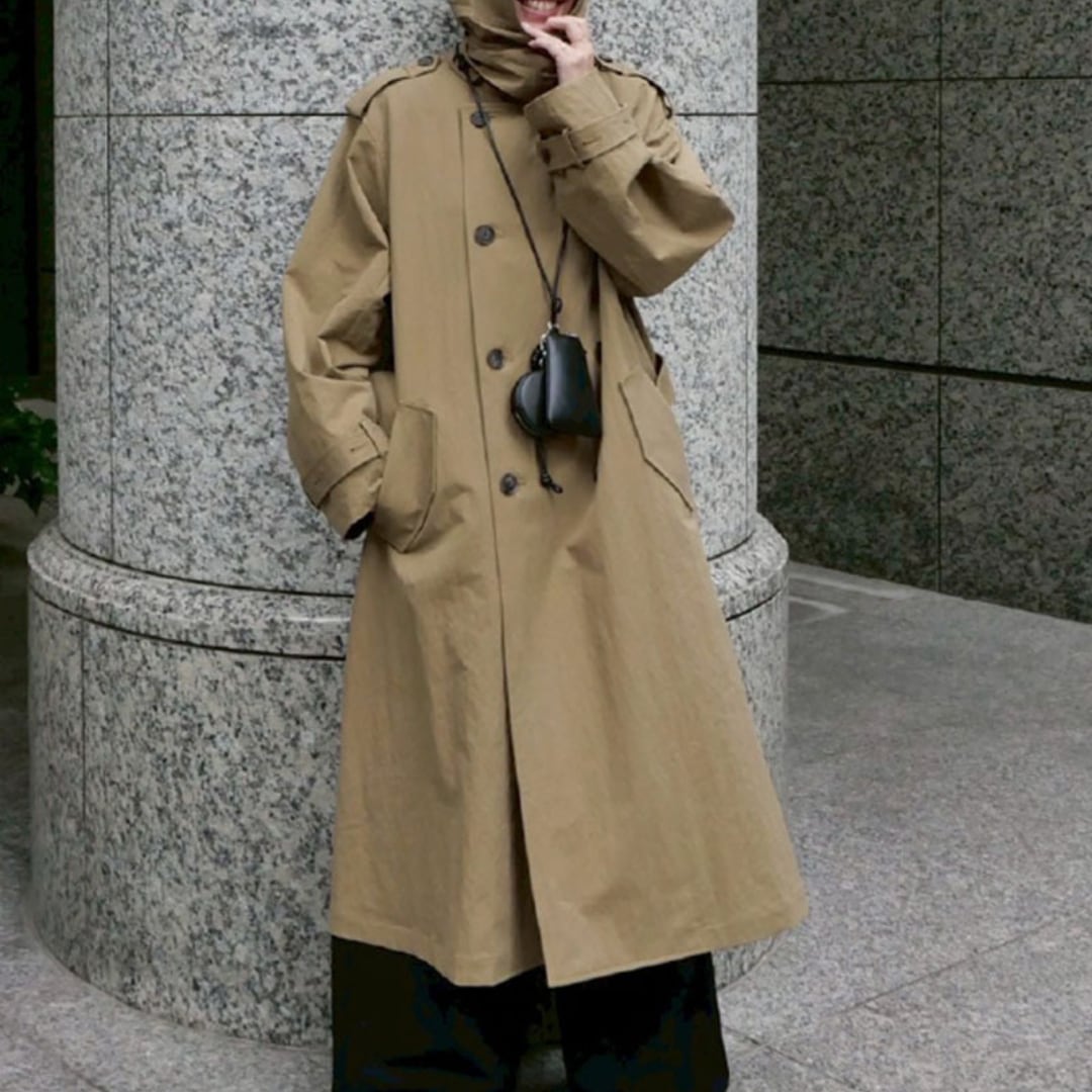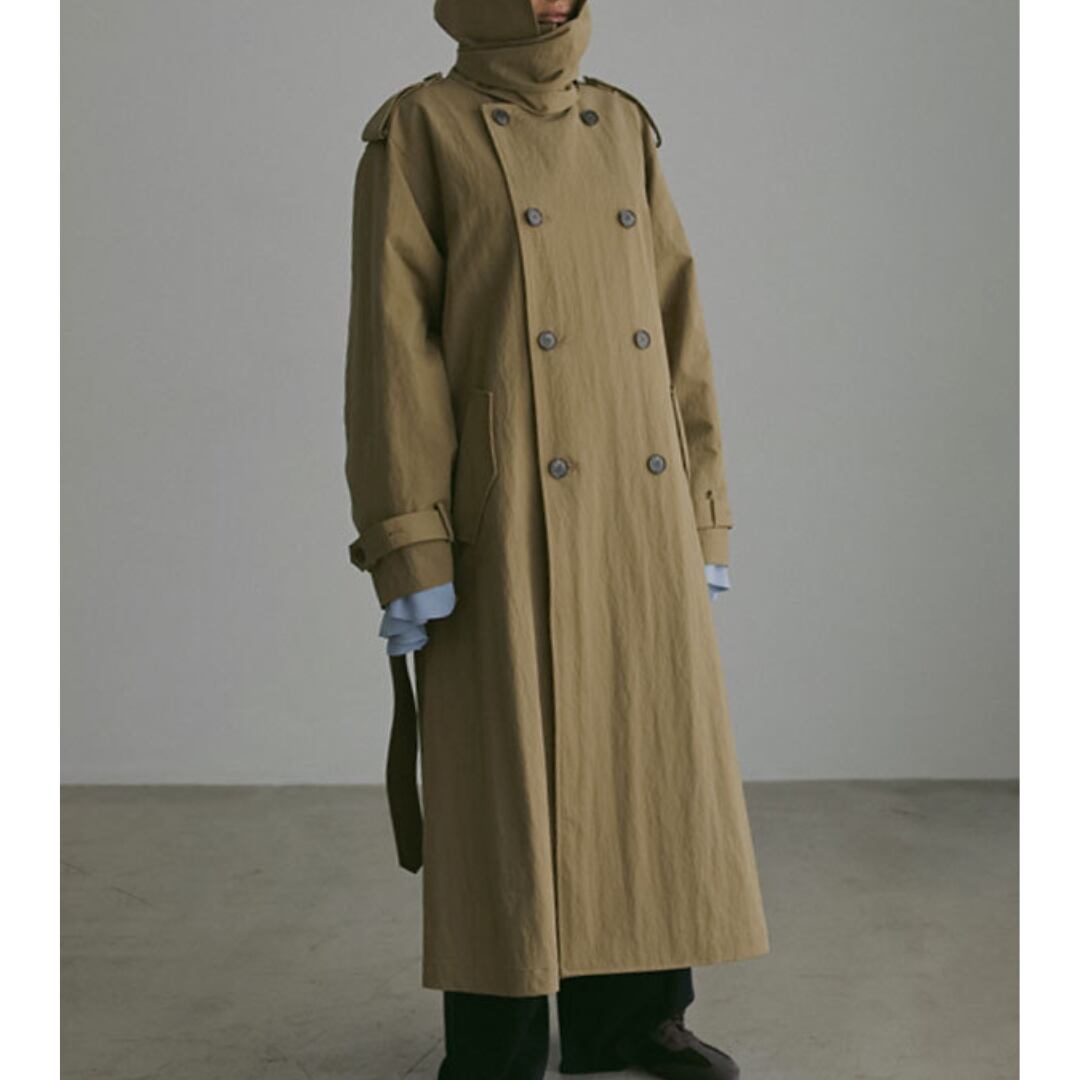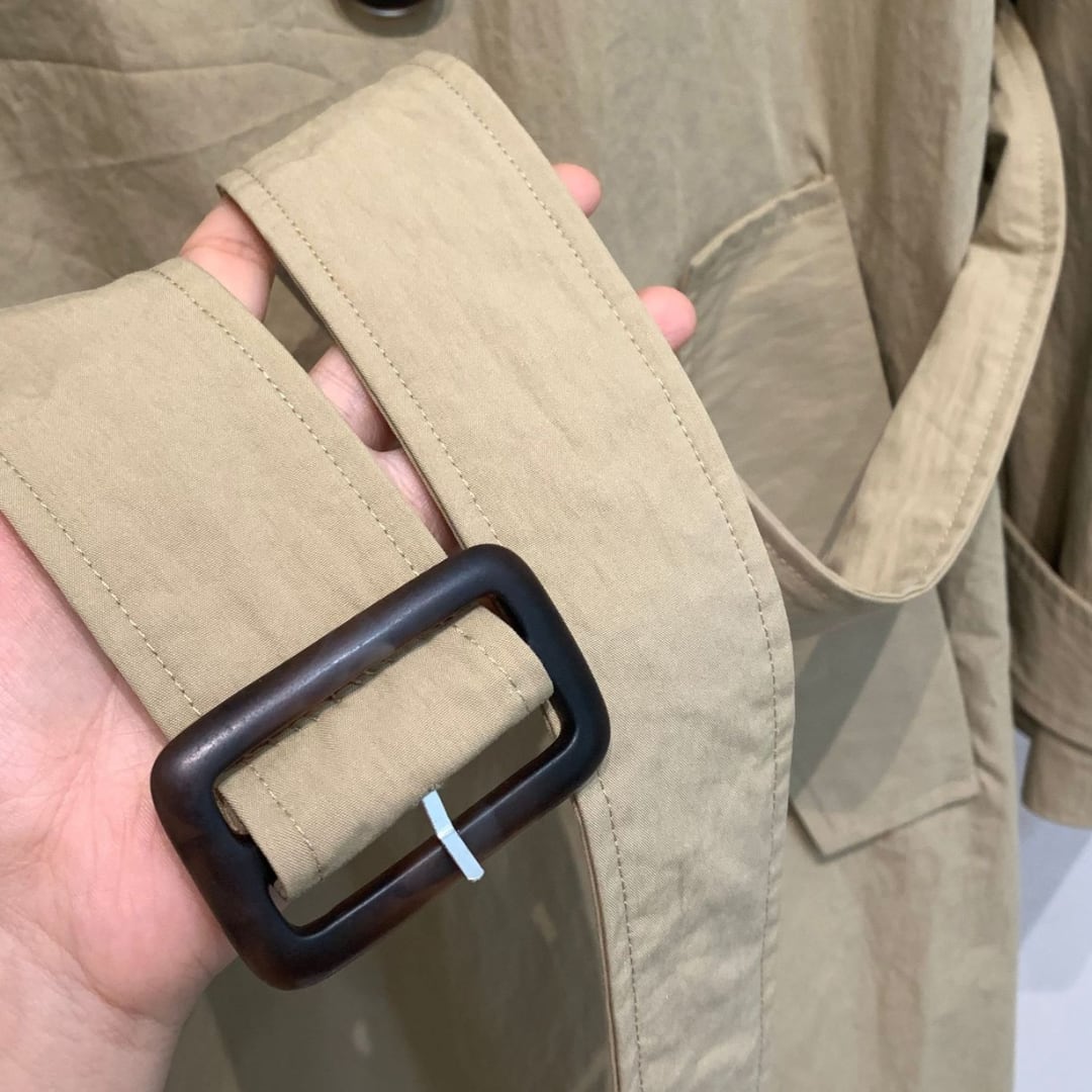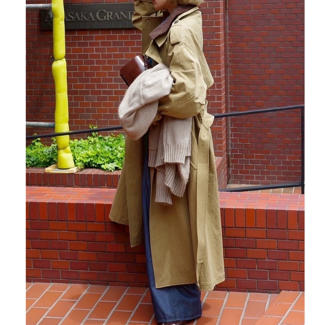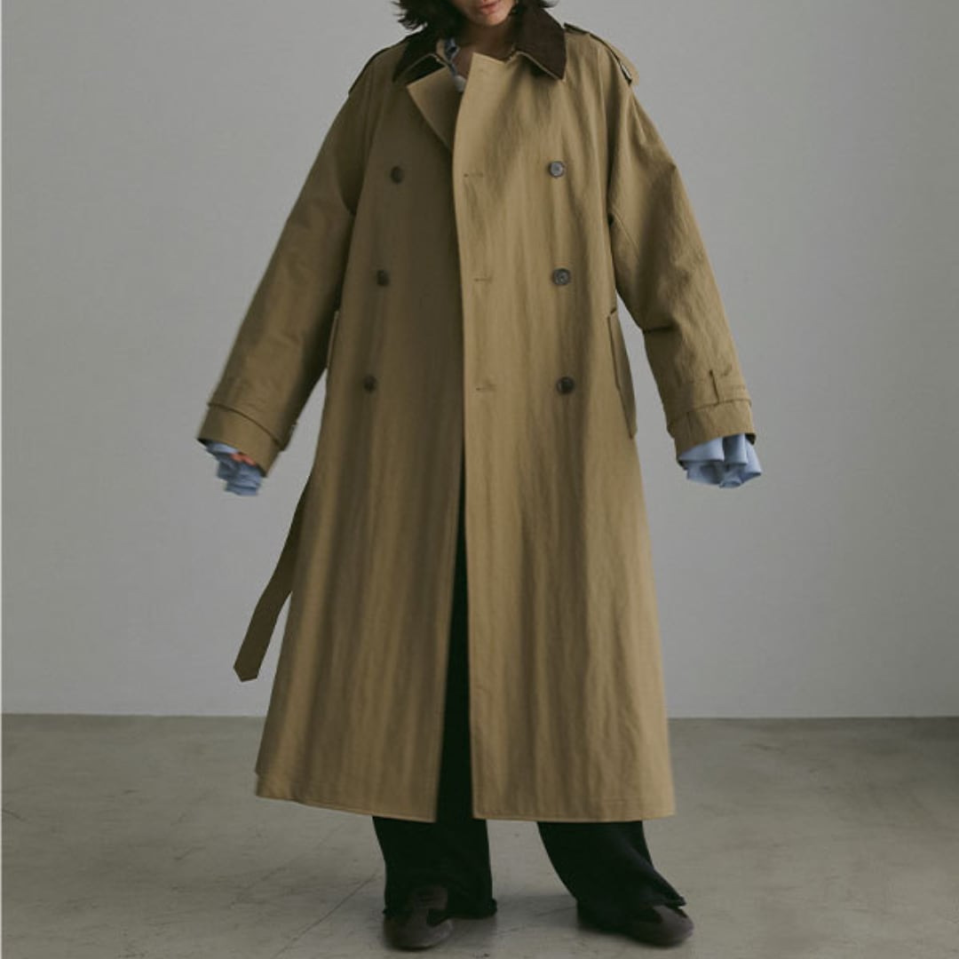 ベルトデザインが特徴的なロングトレンチコート。