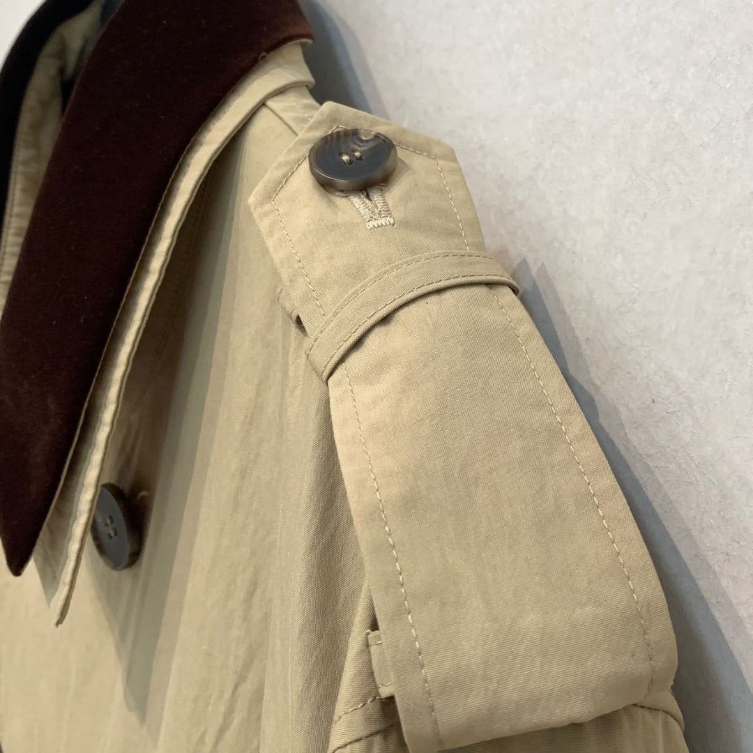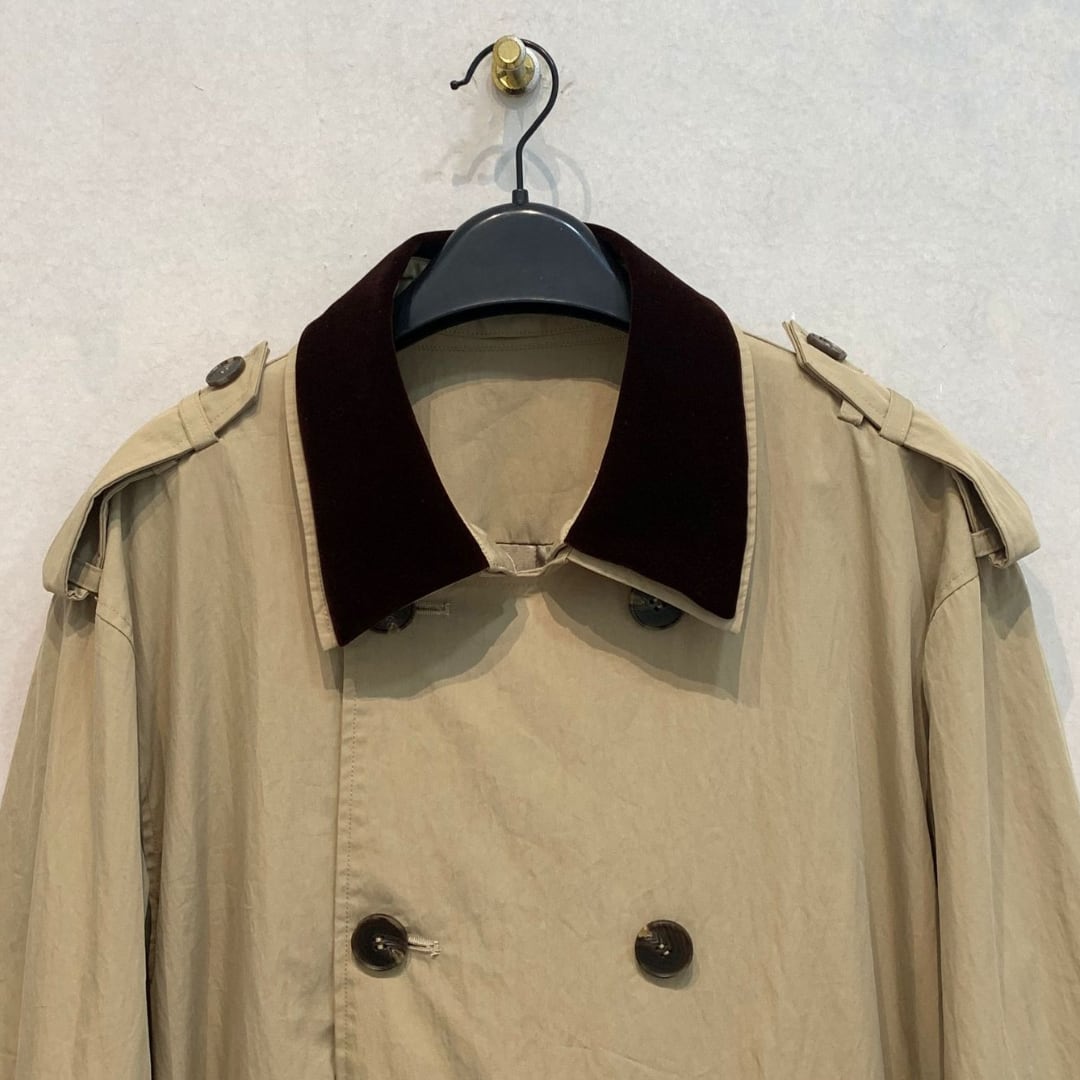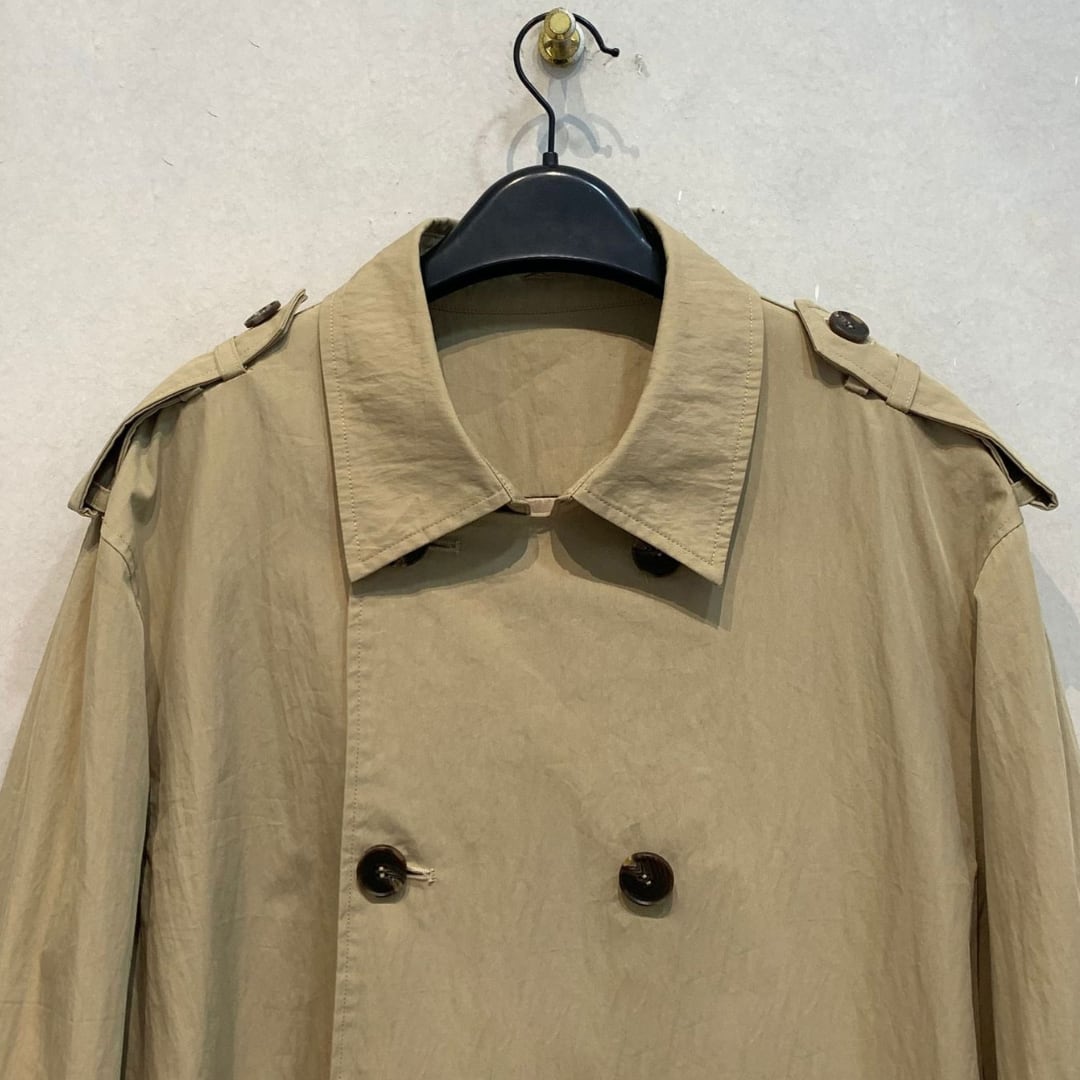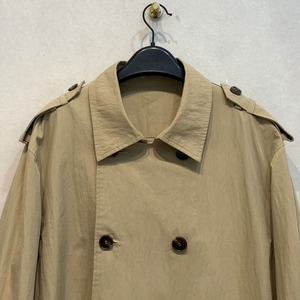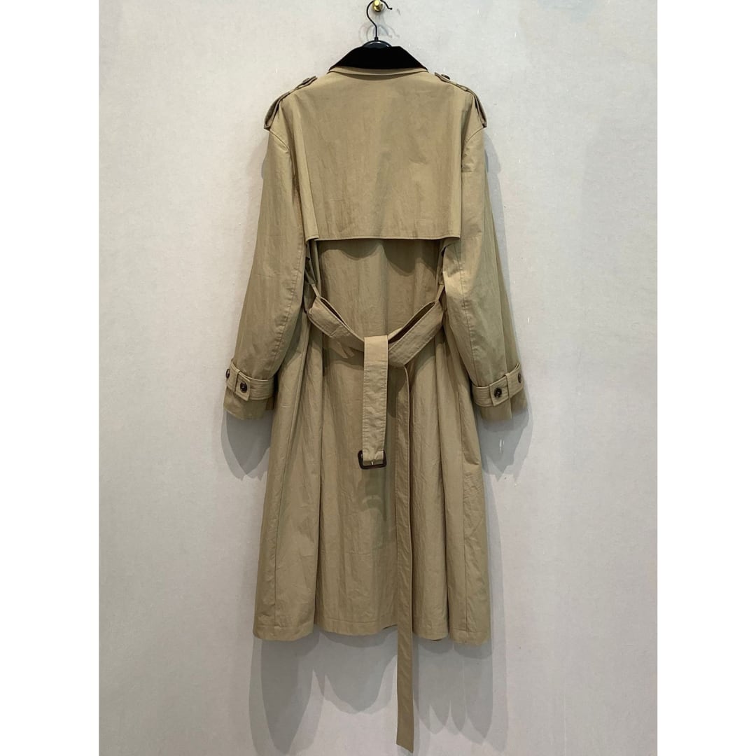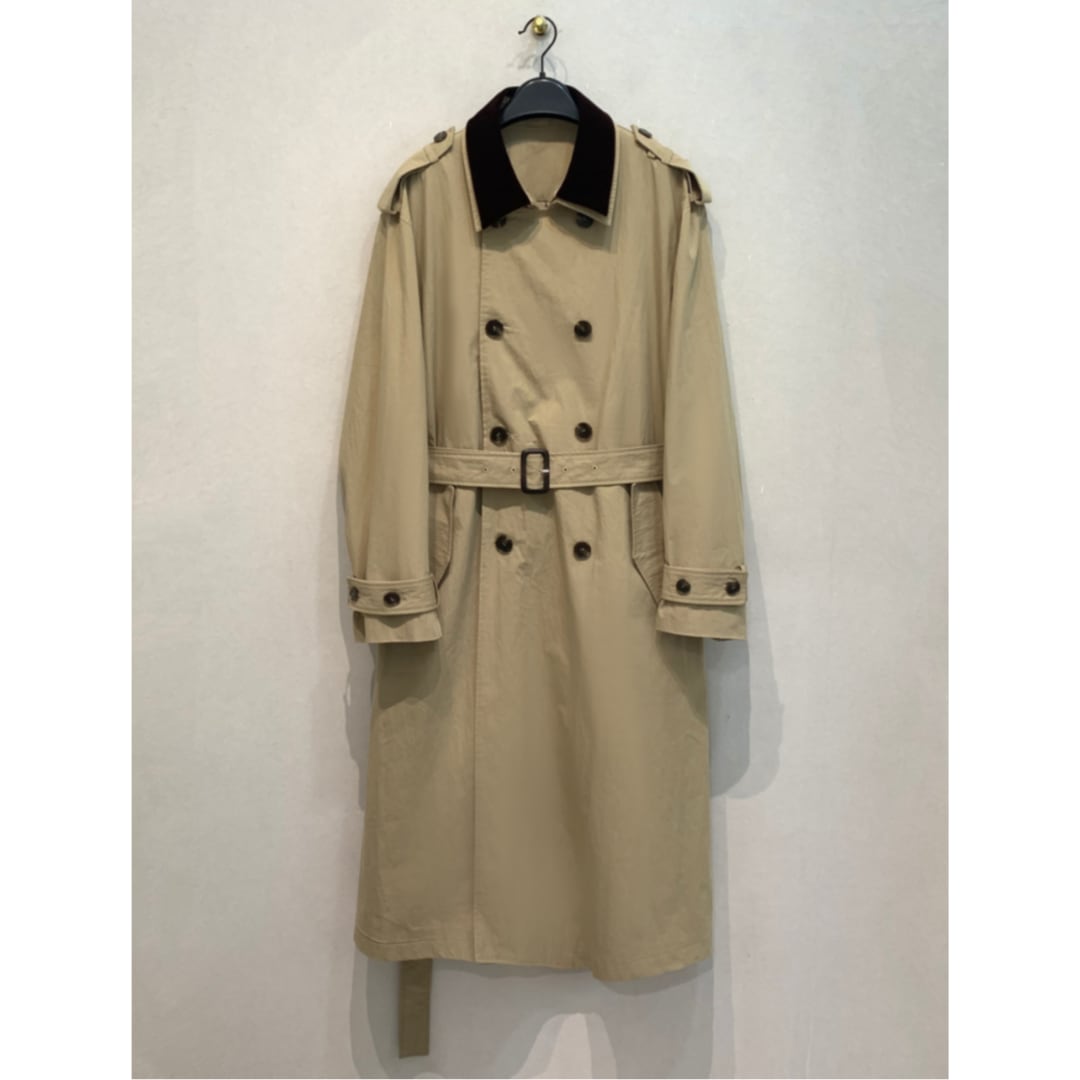 ベルトデザインが特徴的なロングトレンチコート。