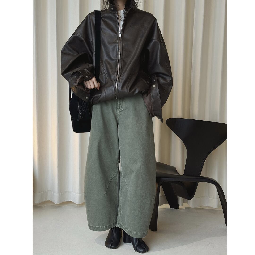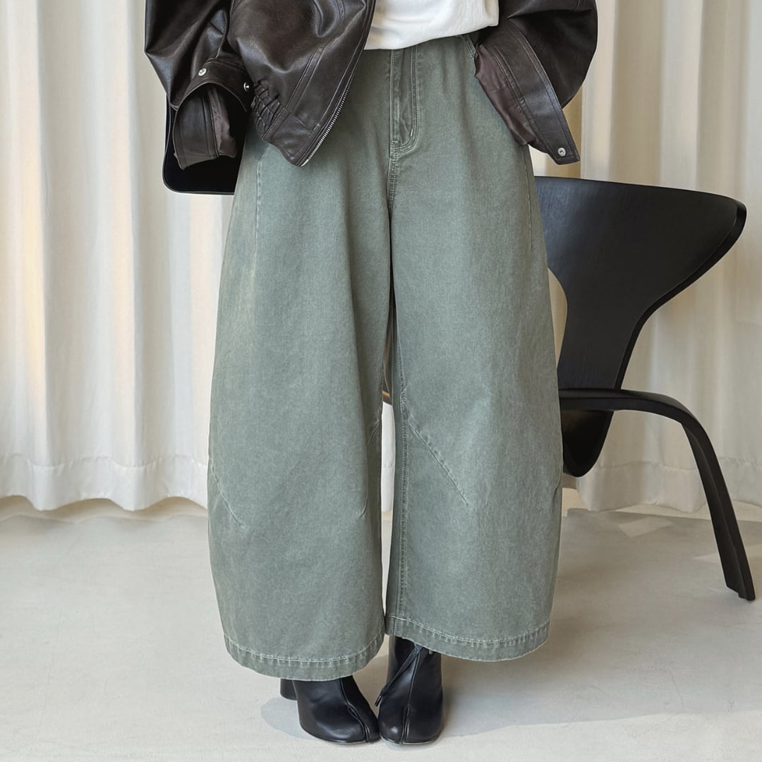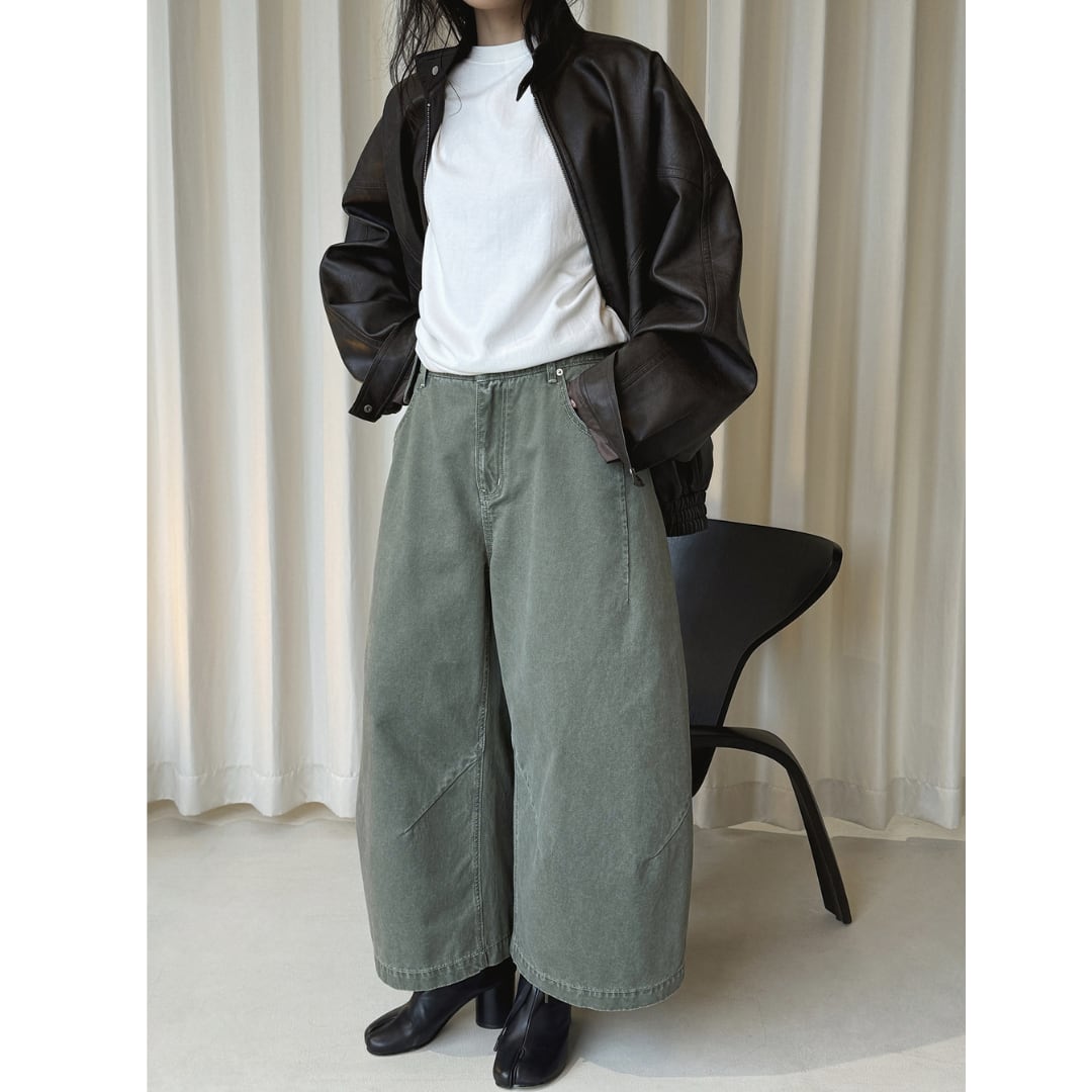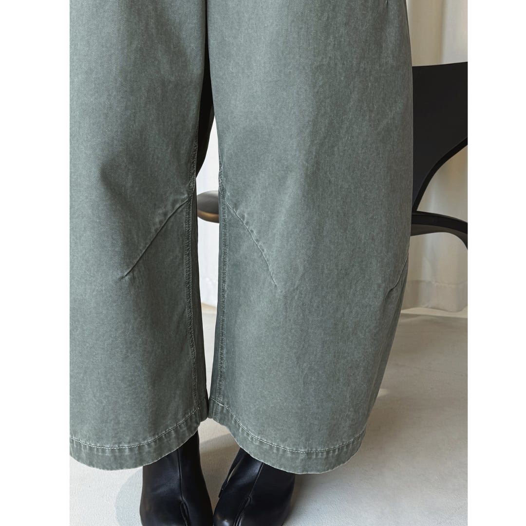 ミリタリーコーデにも活躍するくすみグリーンのワイドパンツ。