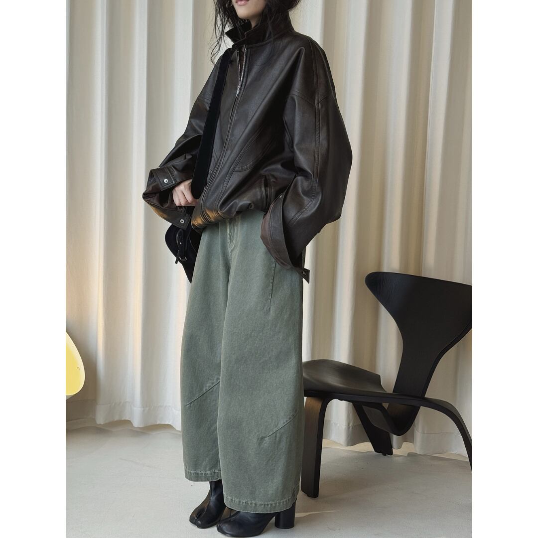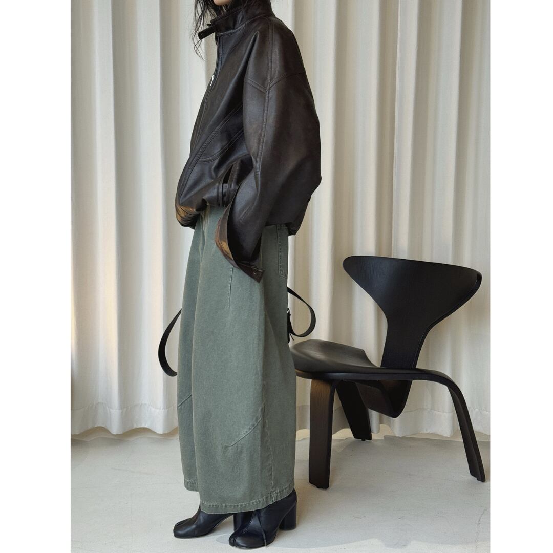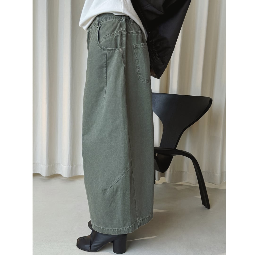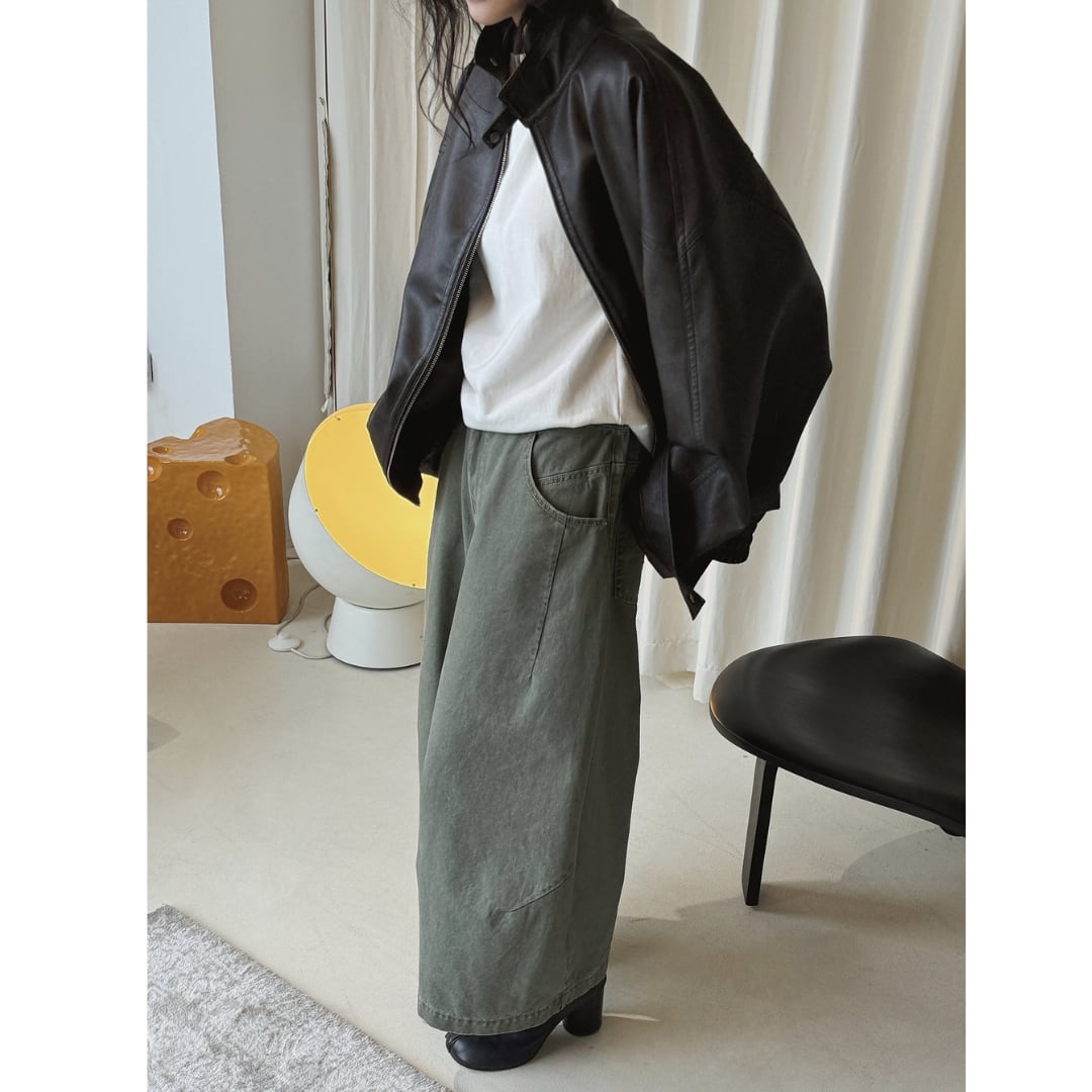 ミリタリーコーデにも活躍するくすみグリーンのワイドパンツ。