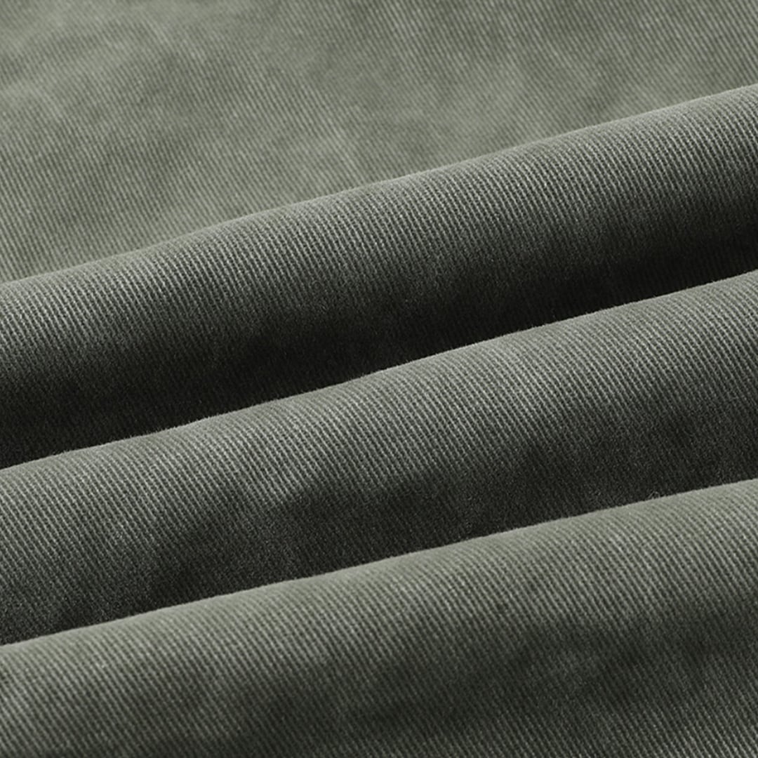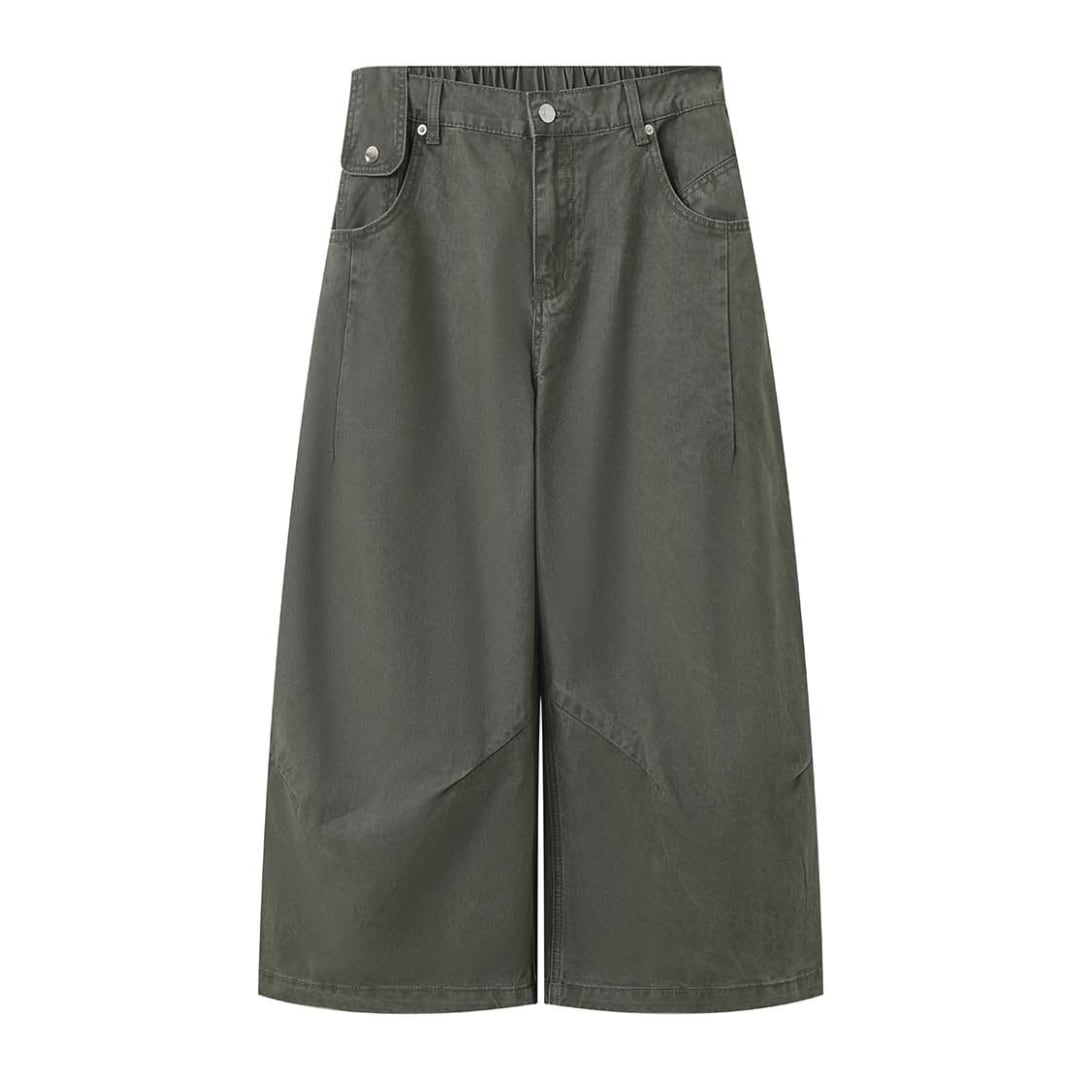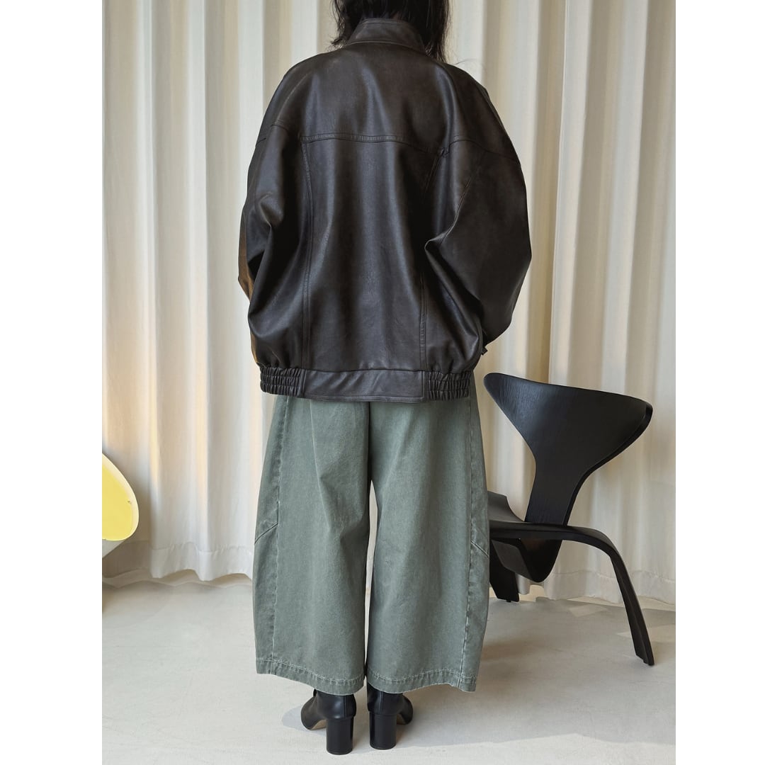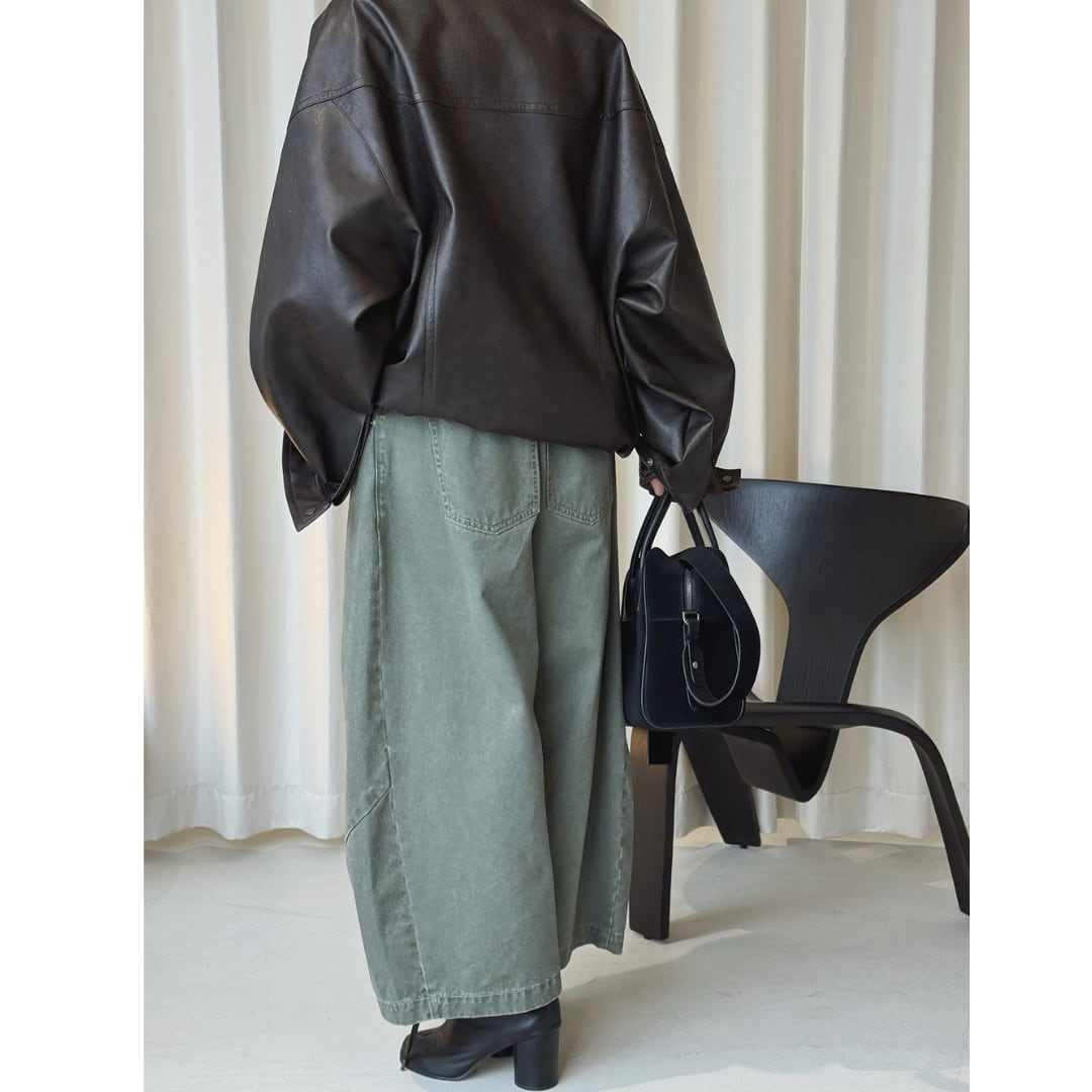 ミリタリーコーデにも活躍するくすみグリーンのワイドパンツ。