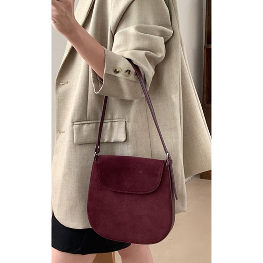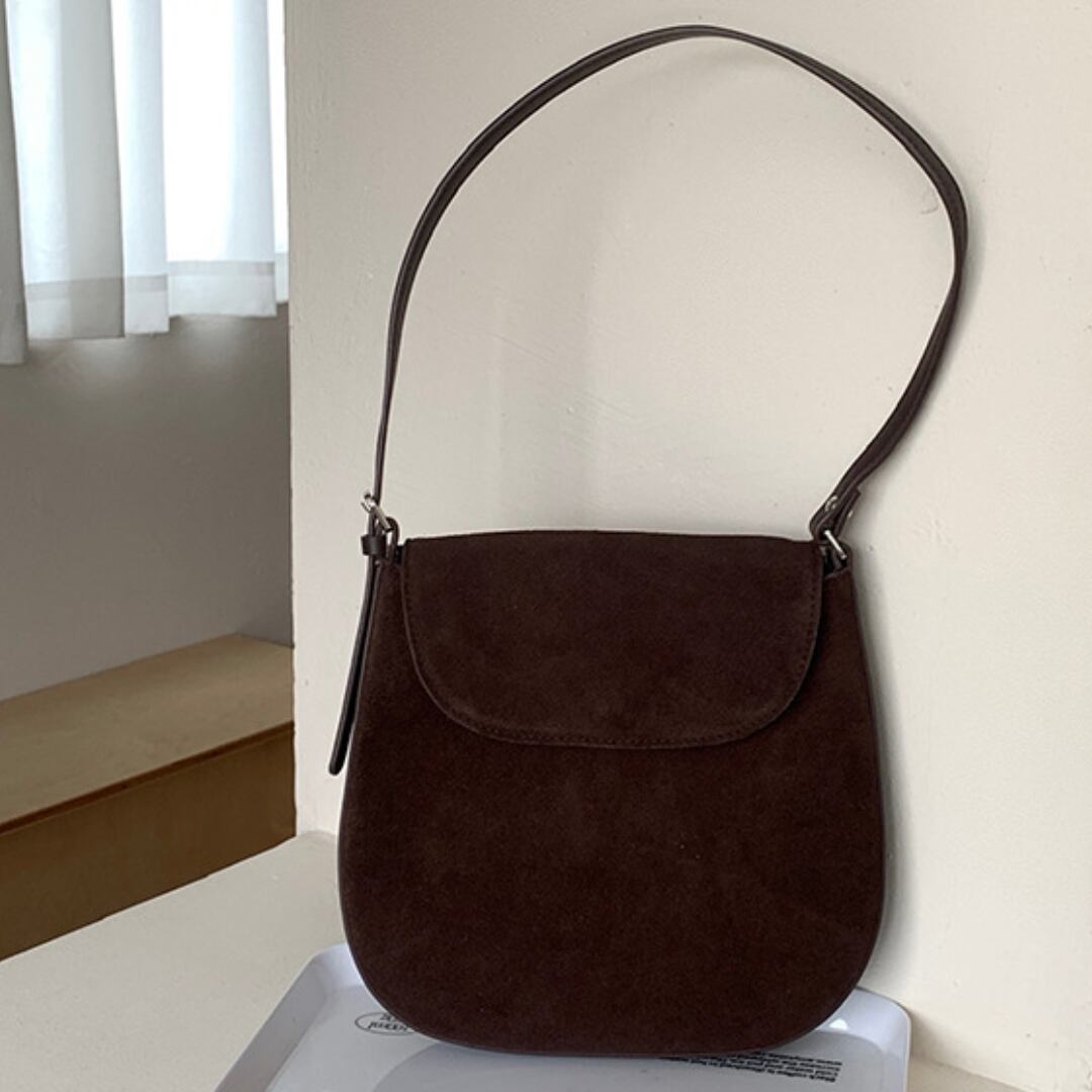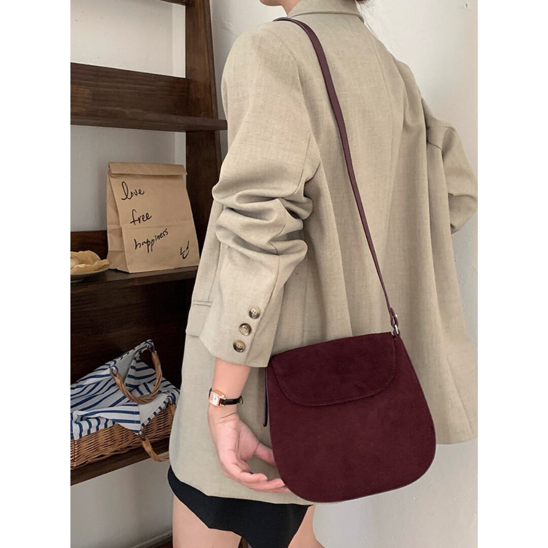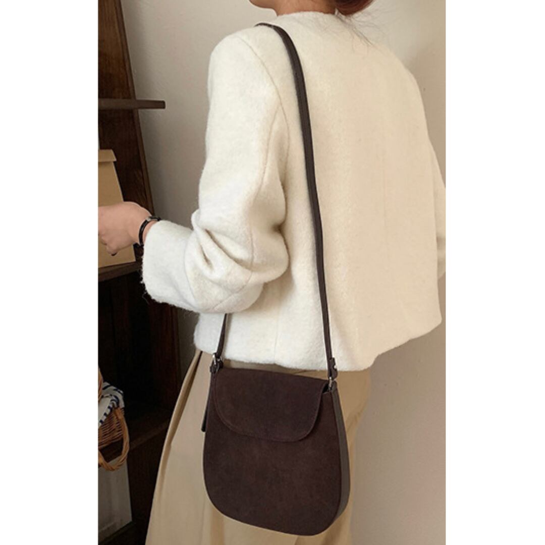 丸みを帯びたフォルムと牛革スエードで優しい雰囲気が漂うショルダーバッグ。