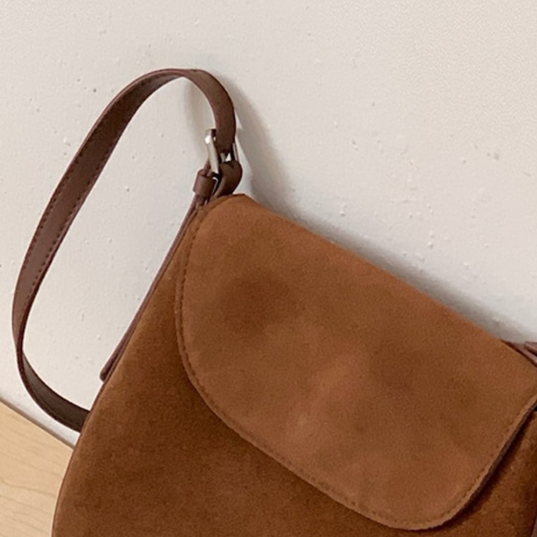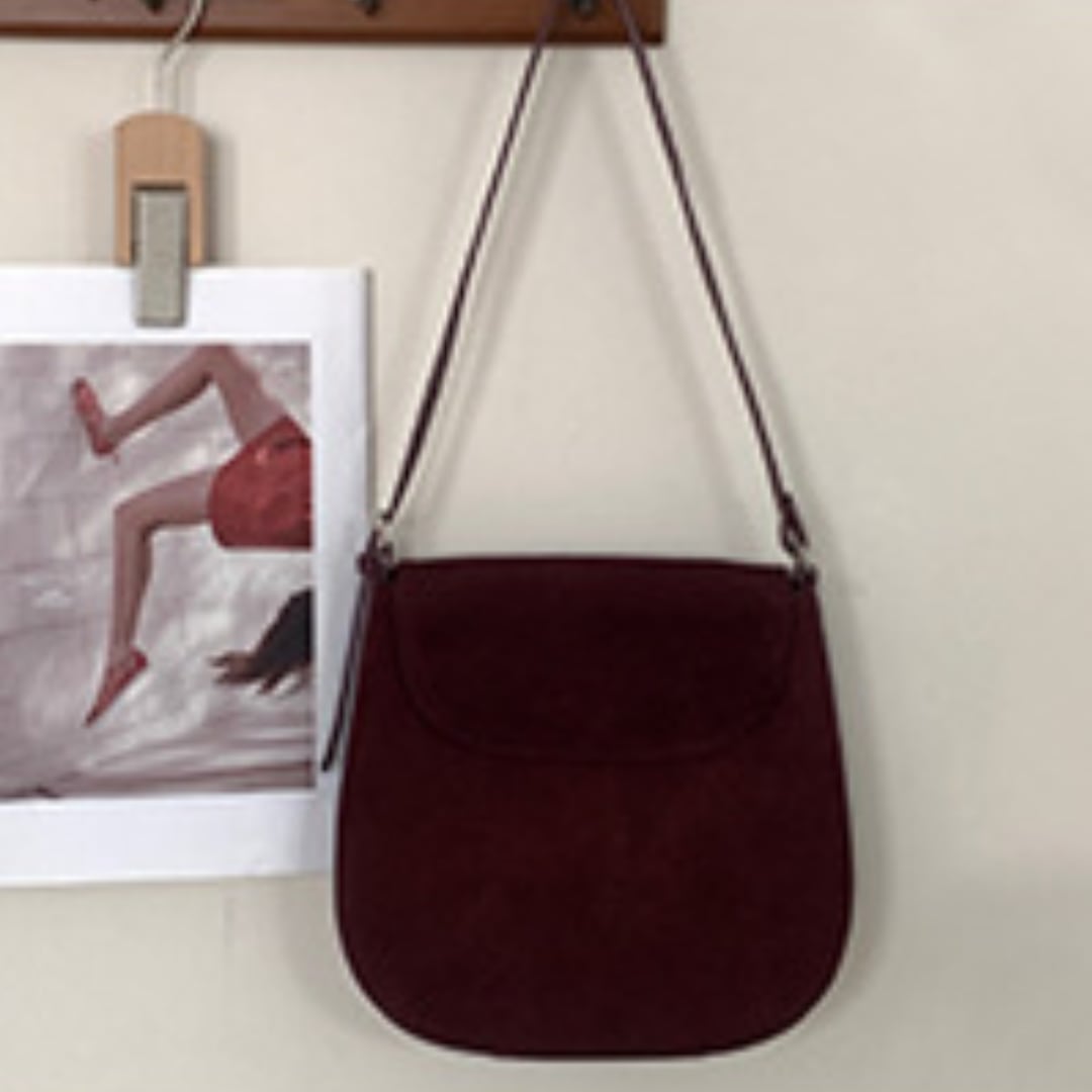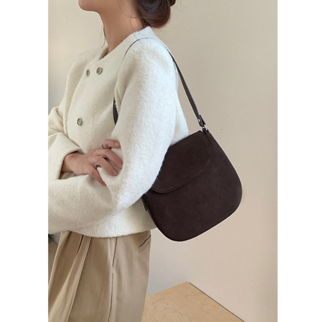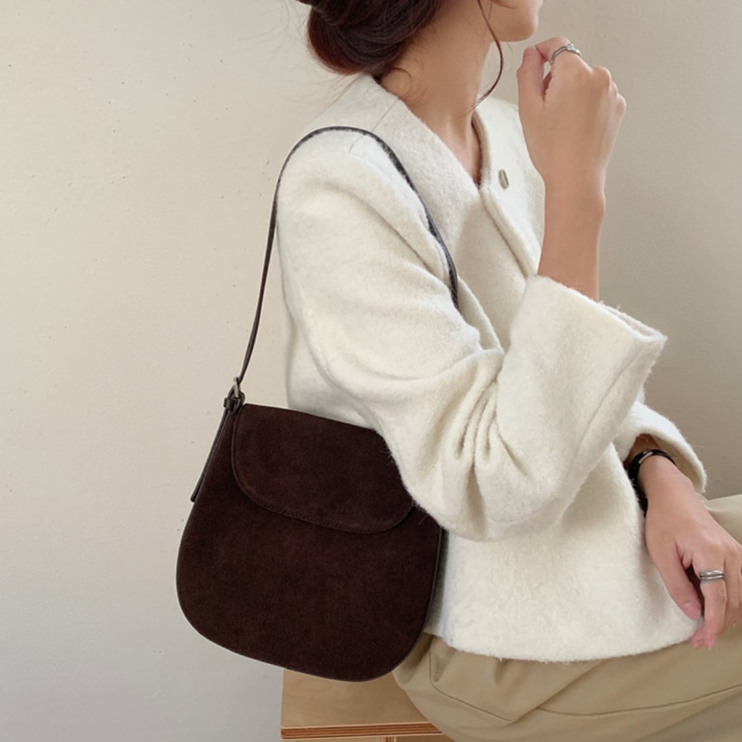 丸みを帯びたフォルムと牛革スエードで優しい雰囲気が漂うショルダーバッグ。