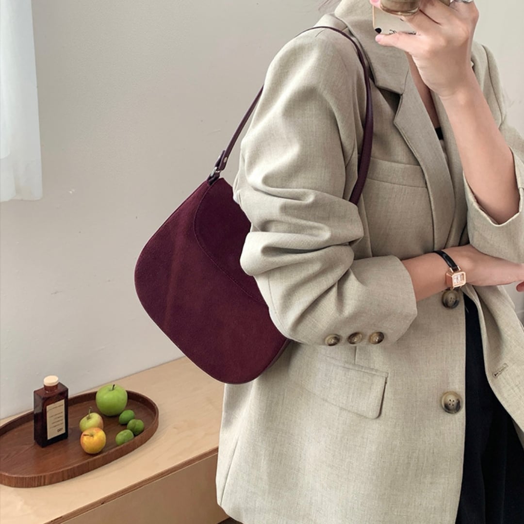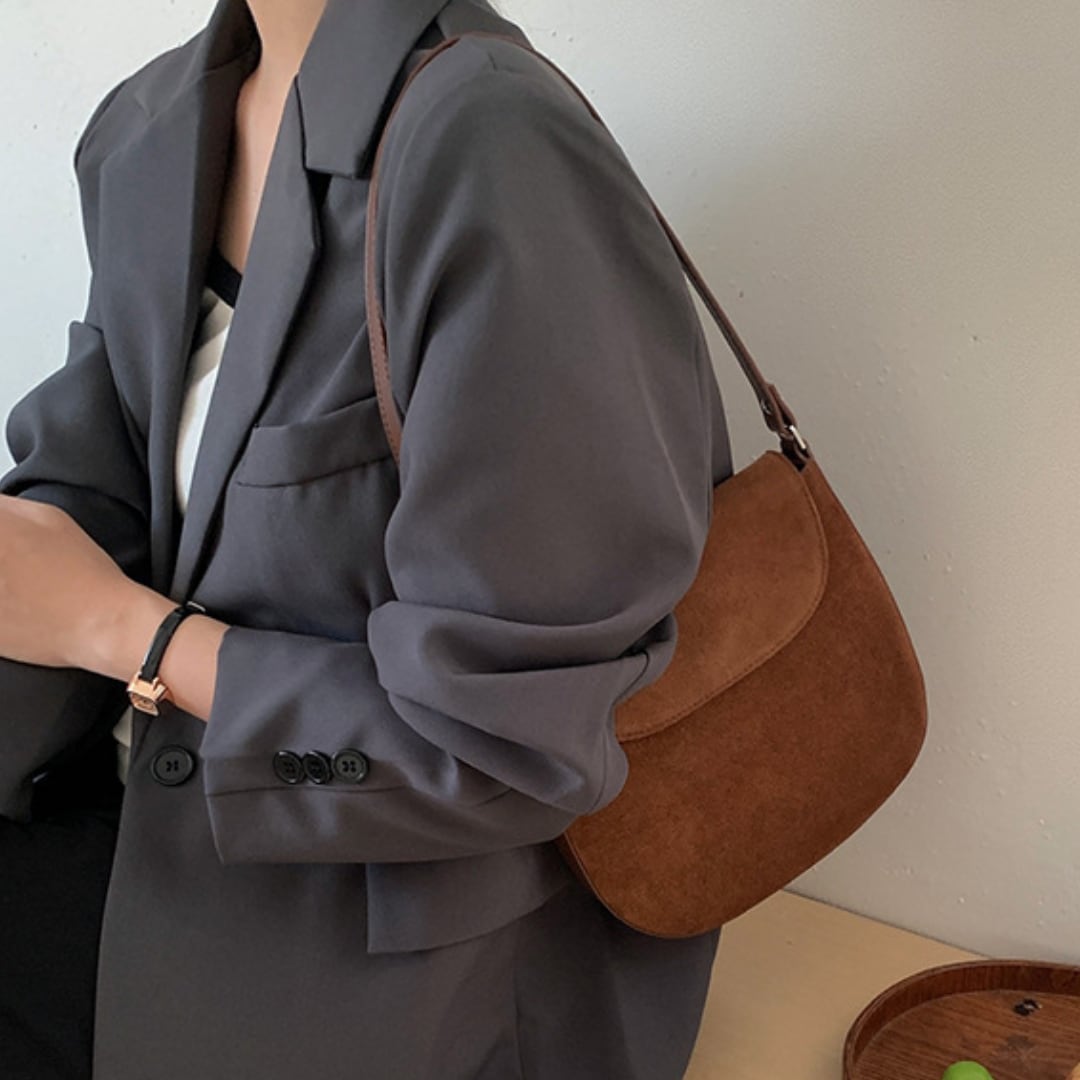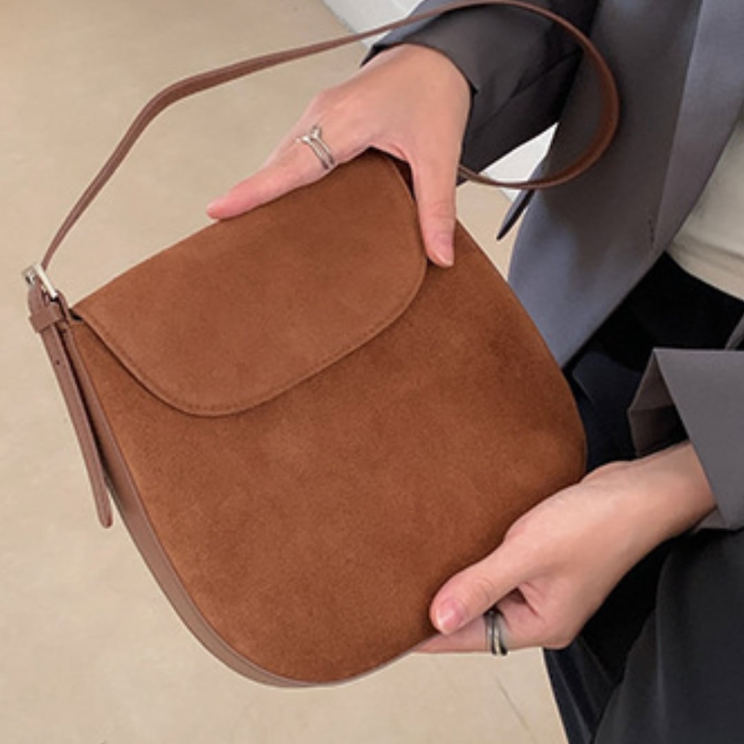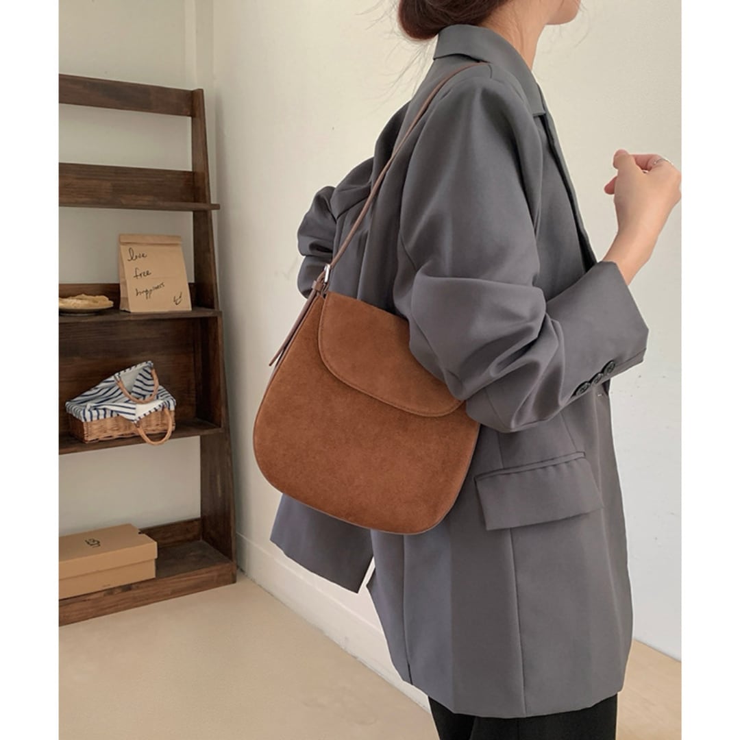 丸みを帯びたフォルムと牛革スエードで優しい雰囲気が漂うショルダーバッグ。