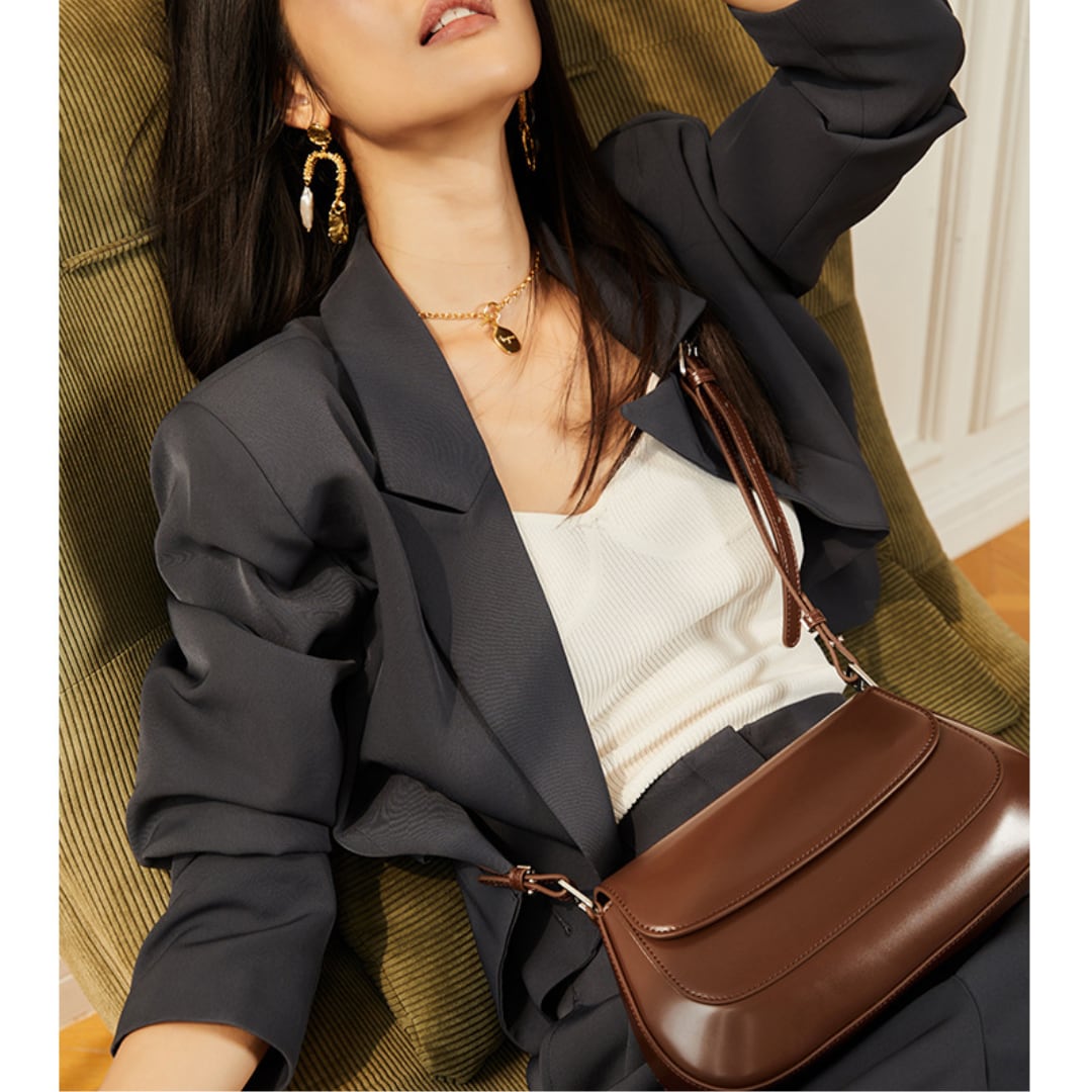 優しいカーブを描いたレザーショルダーバッグ。