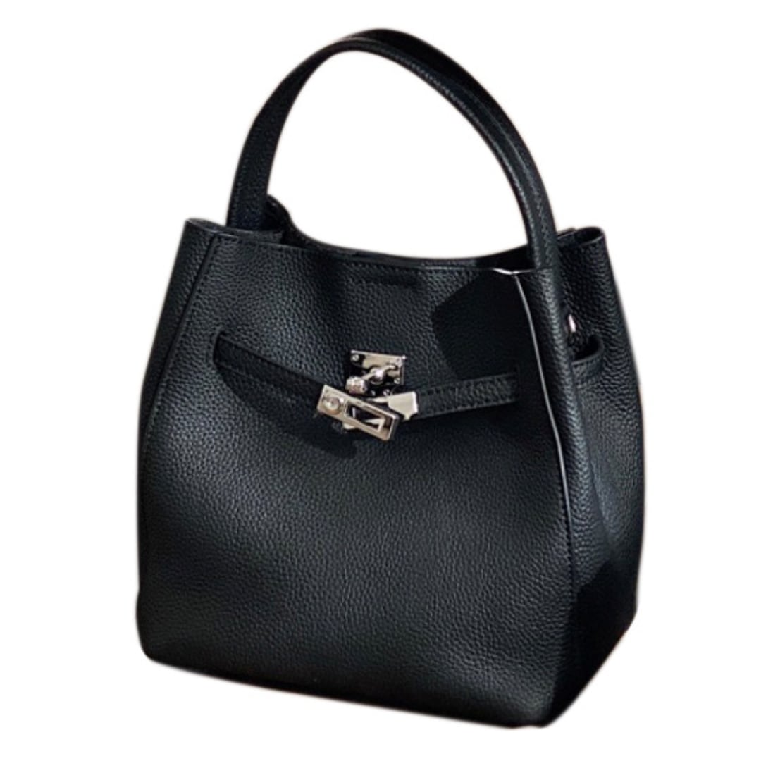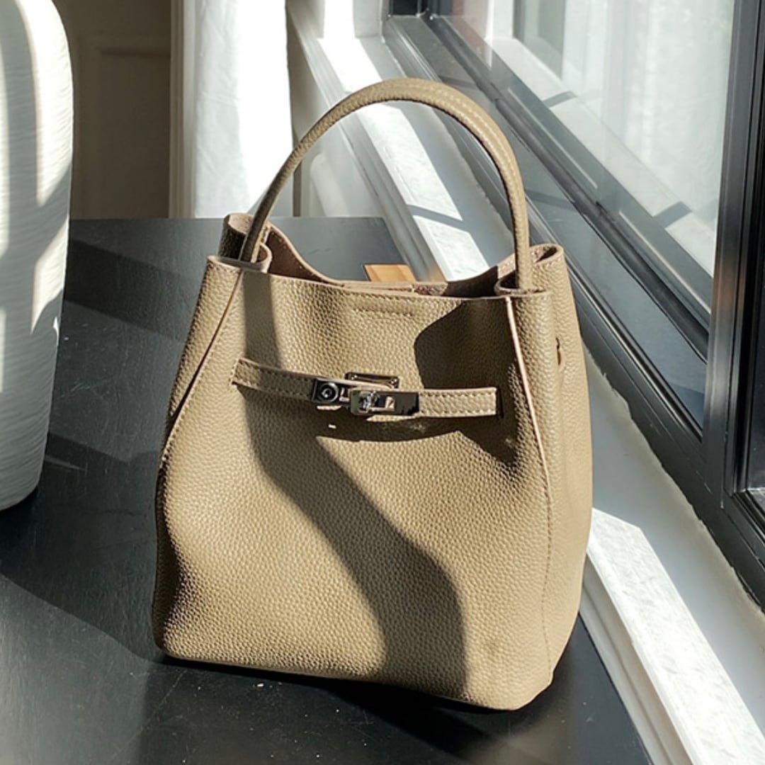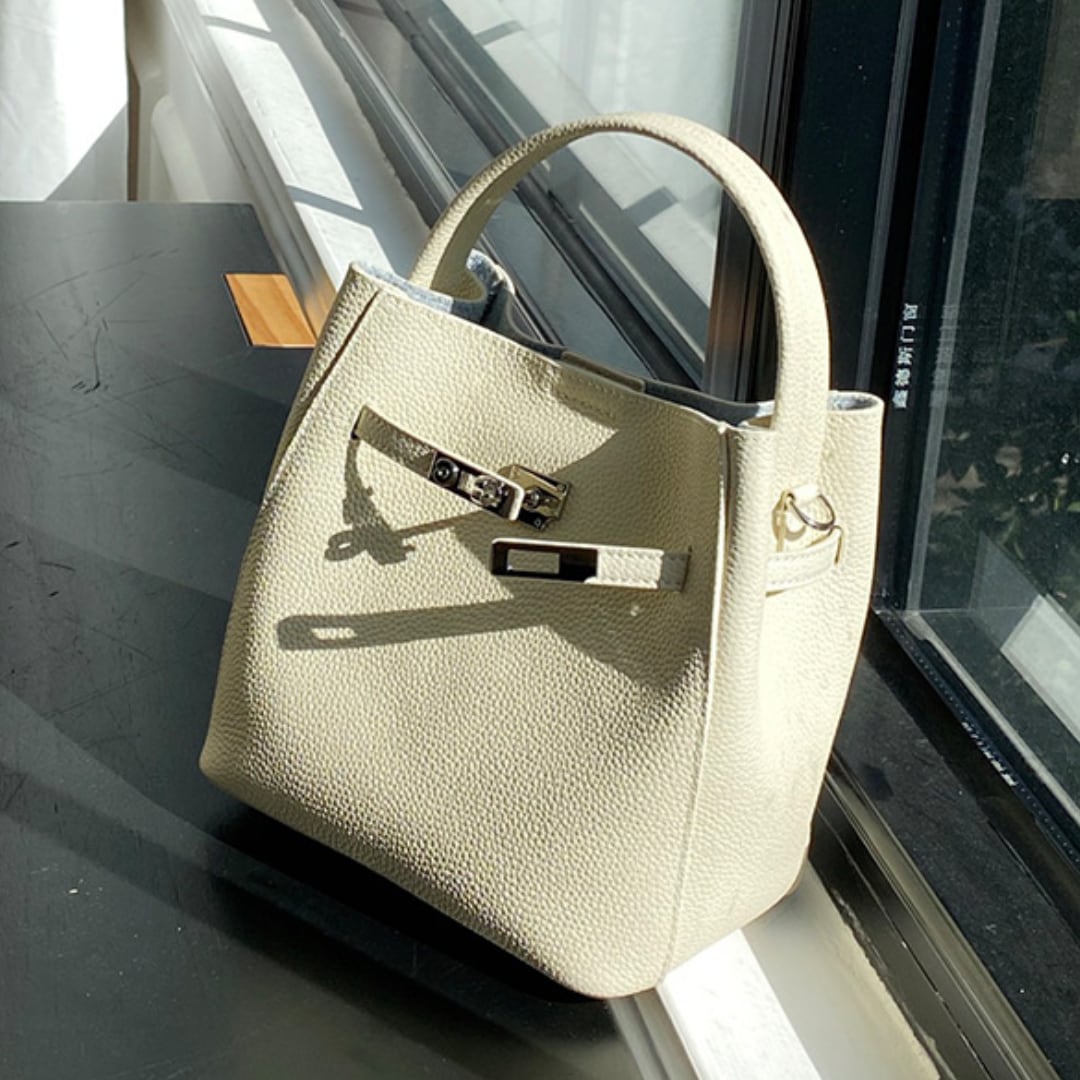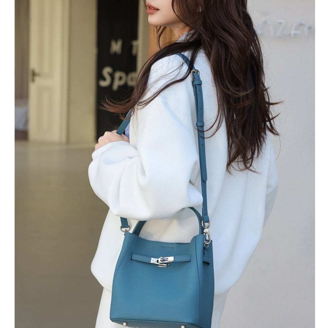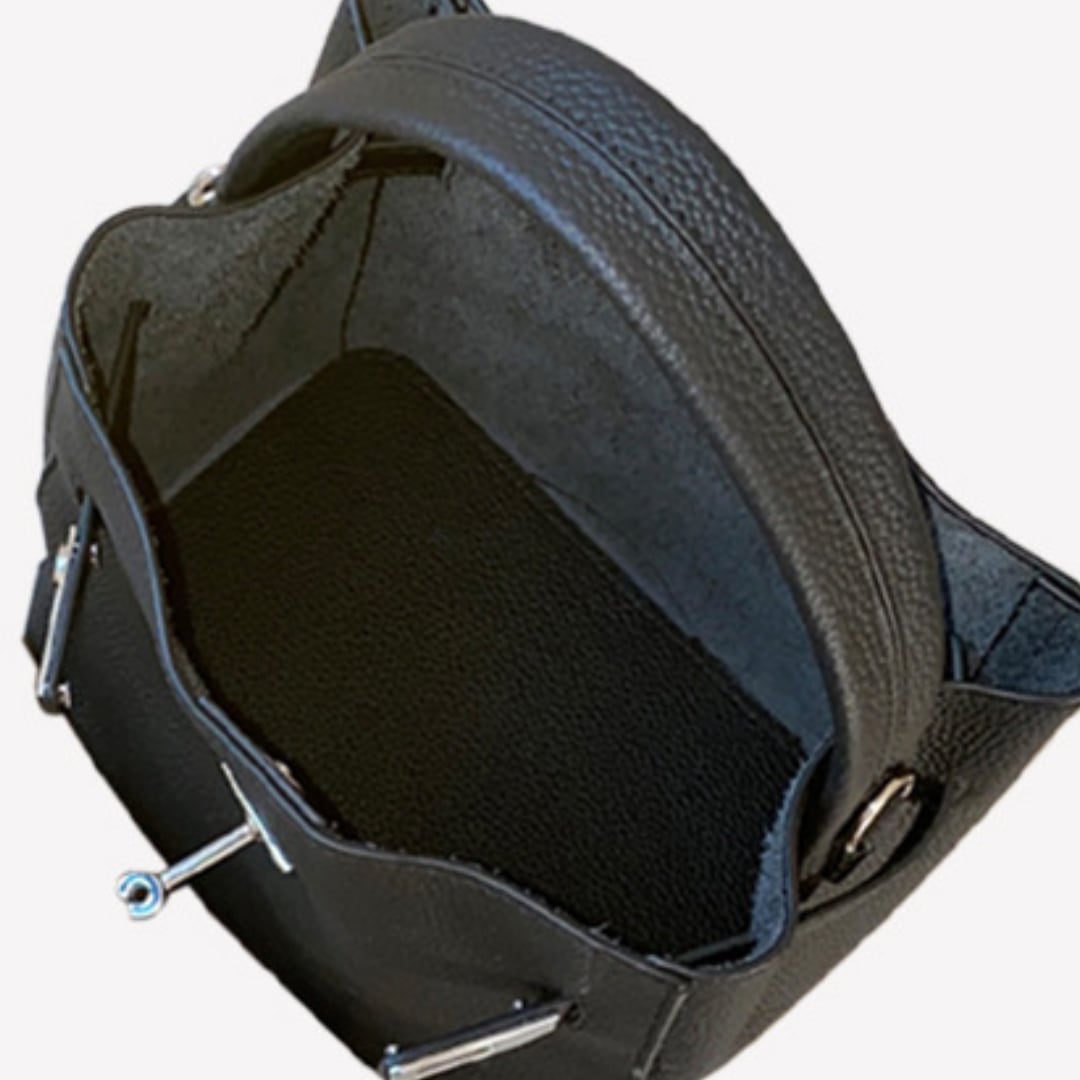 レザーアイテムならではのシボ感が魅力的な台形ミニバッグ。