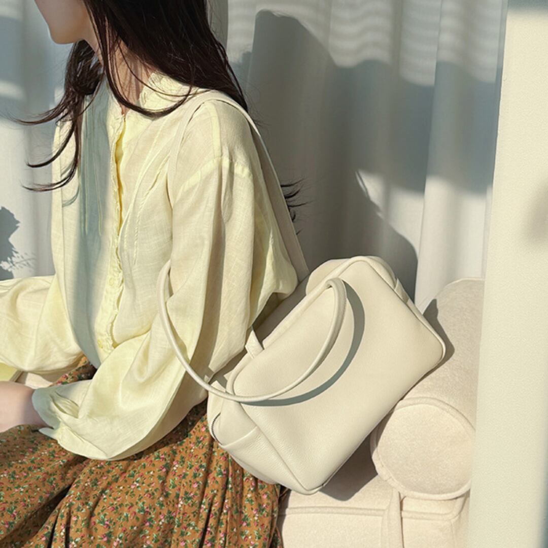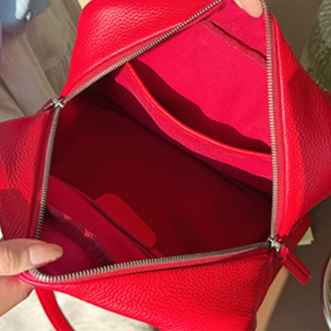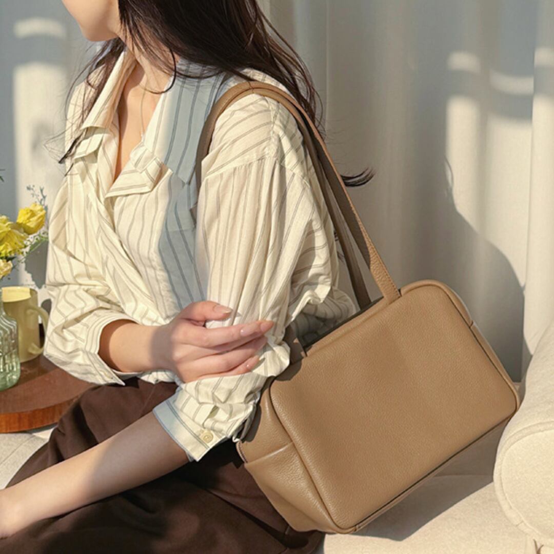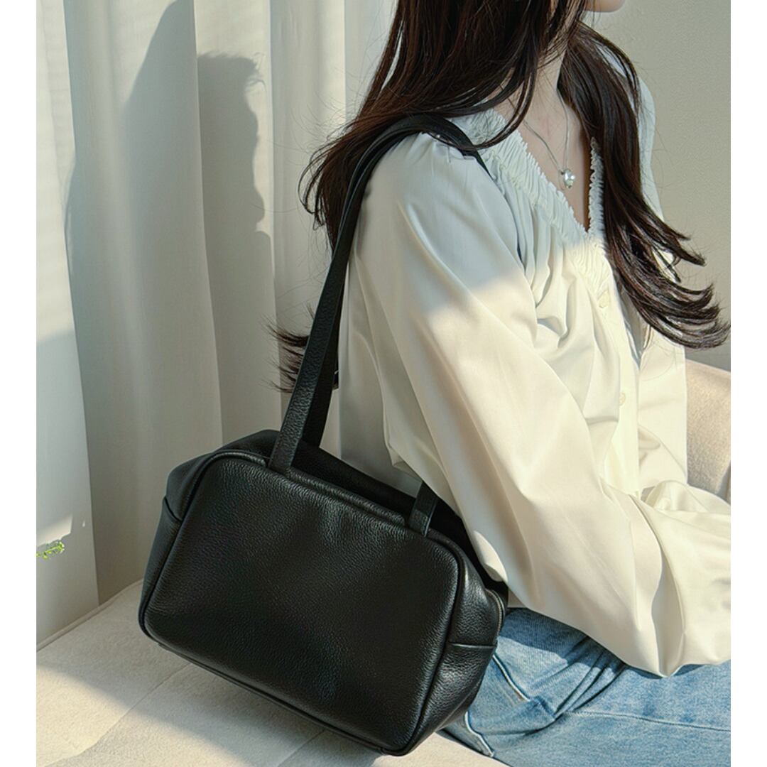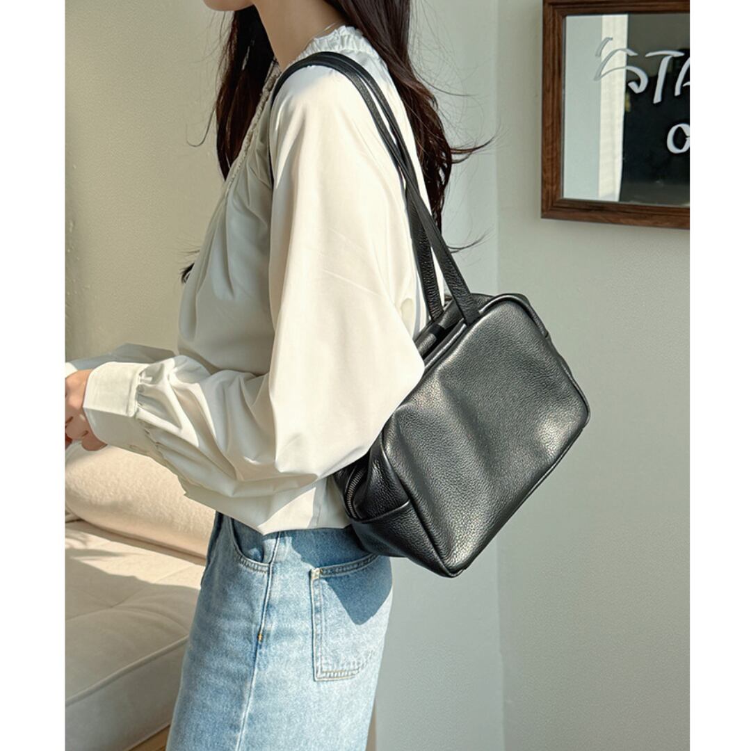 上品なシボ感で、大きすぎず小さすぎないサイズに仕上がっています。幅広いコーディネートに合わせやすく、定期・ハンカチ・ティッシュなどをサッと取り出しやすいオープンポケット付きです。