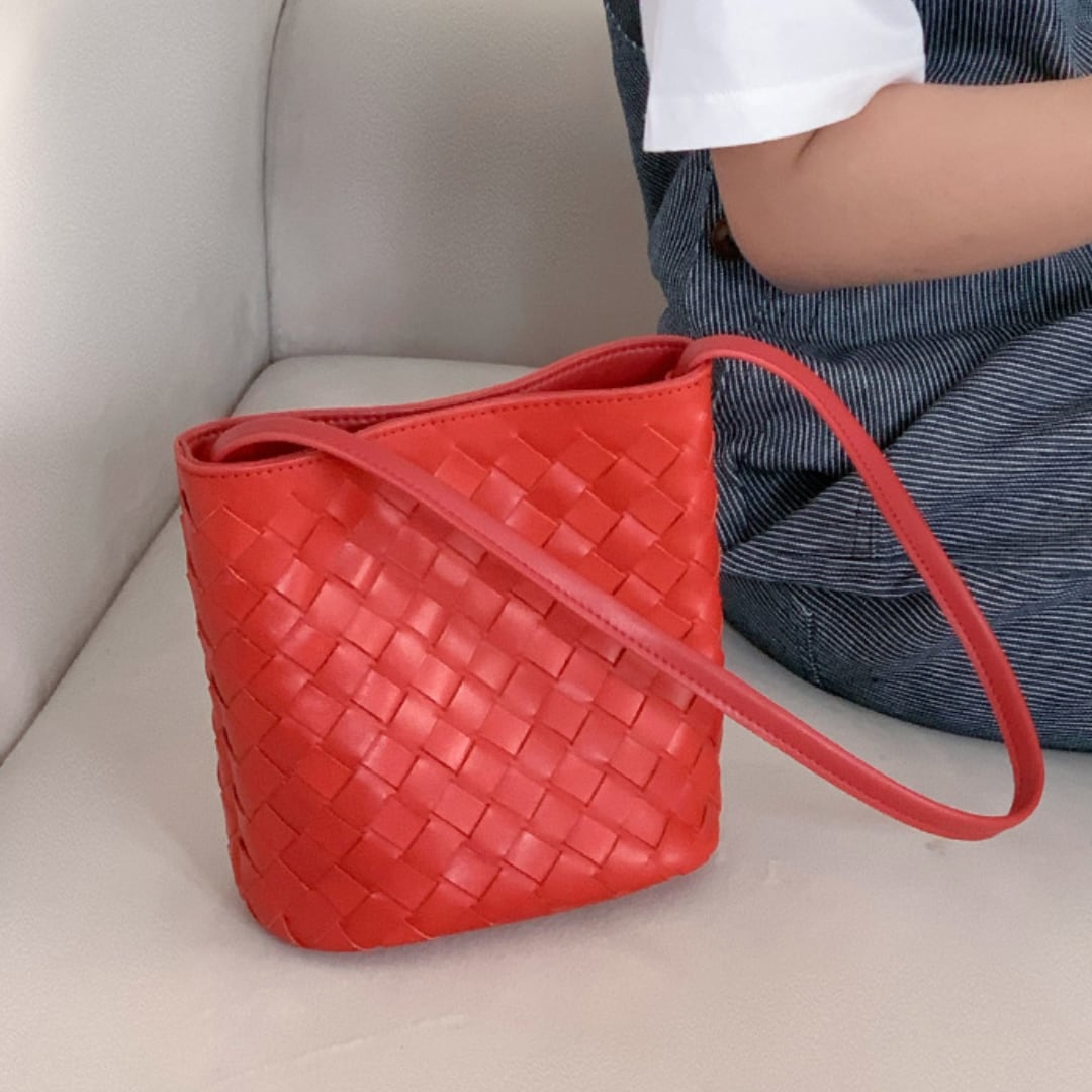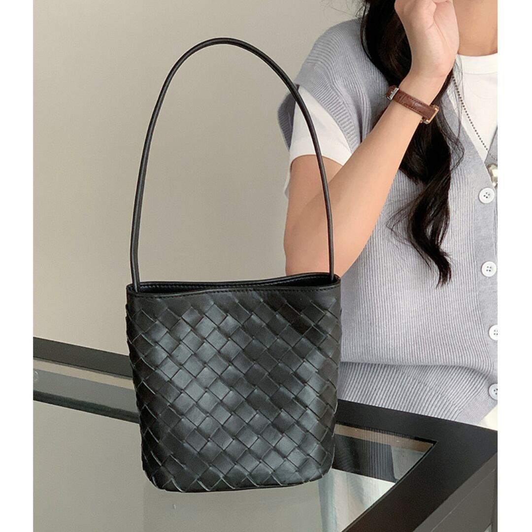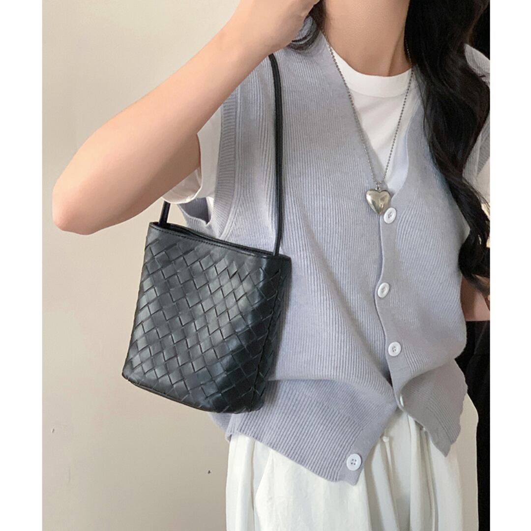 編み込みデザインならではの個性があり、コスメや香水など小物類の持ち歩きに最適。春夏コーデに添えると涼し気な印象を与えてくれます。