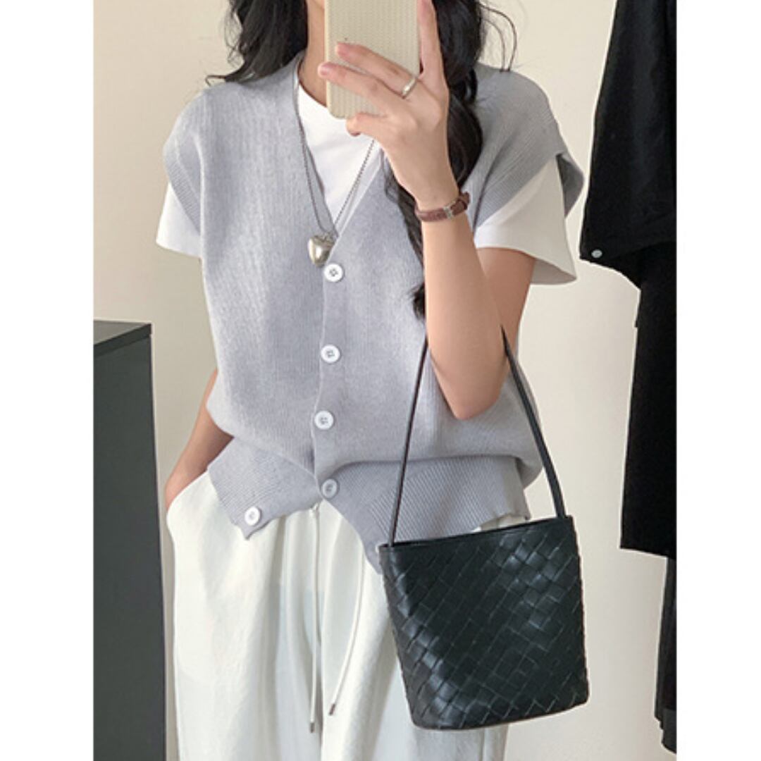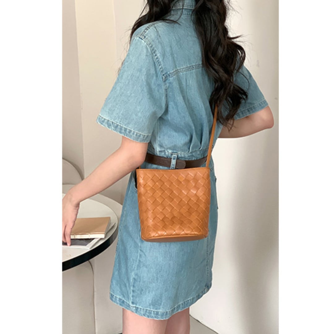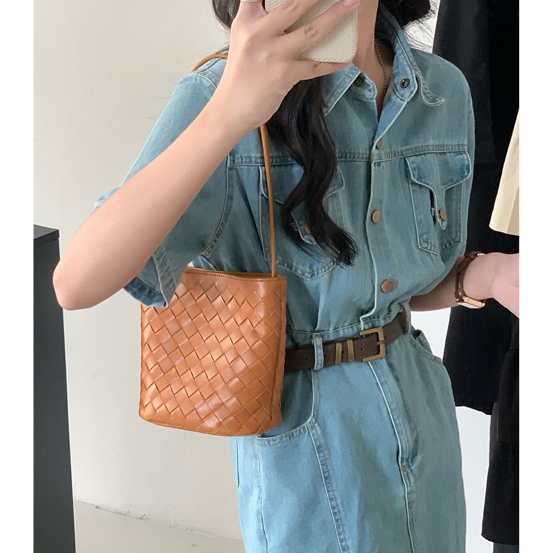 編み込みデザインならではの個性があり、コスメや香水など小物類の持ち歩きに最適。春夏コーデに添えると涼し気な印象を与えてくれます。