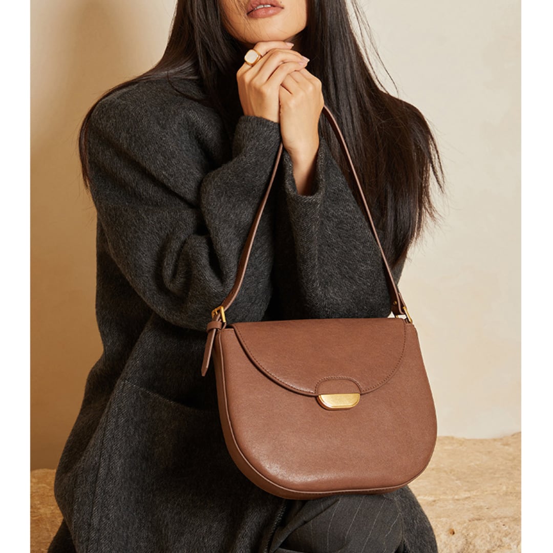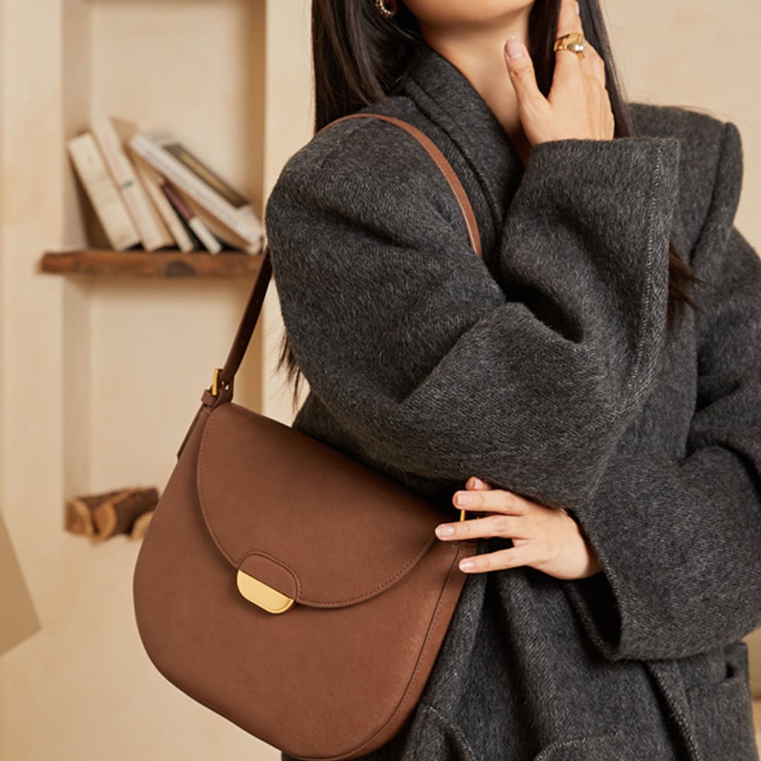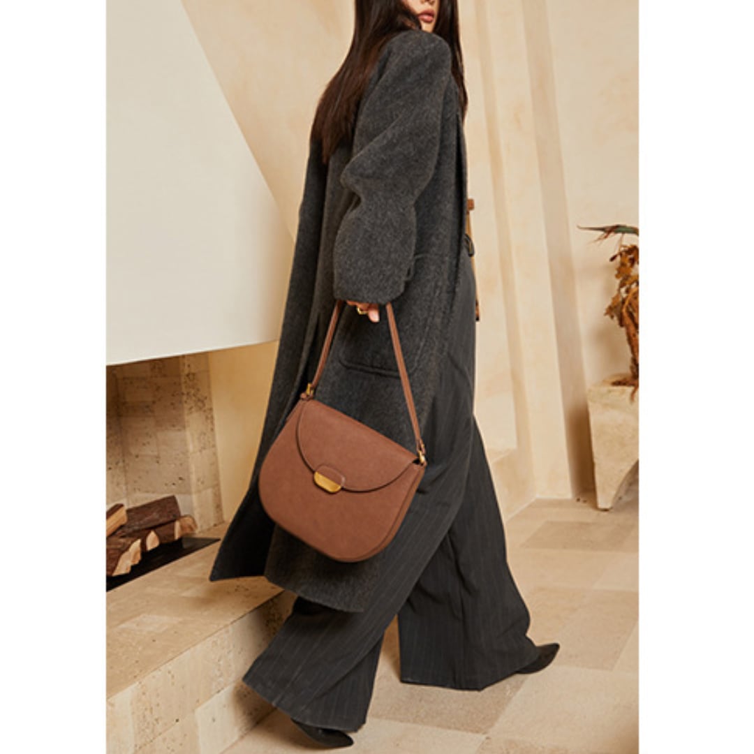 収納力がありながら厚みを出さずに持ち歩ける設計で、フラップの金具はさり気なく目を惹く存在。内部はオープンポケット×1、ファスナー付きポケット×1で小物の整理収納に不便しない設計です。