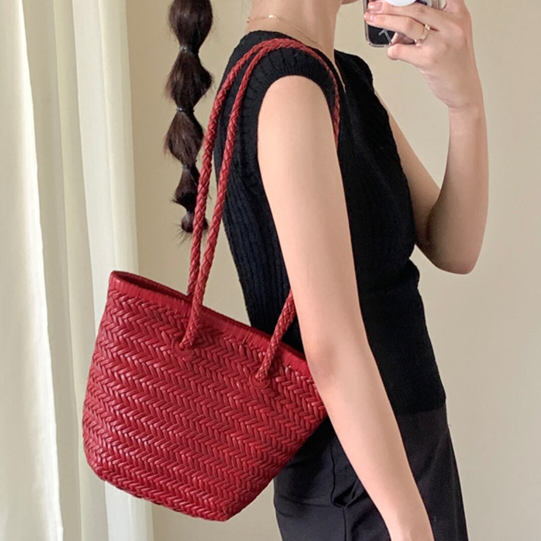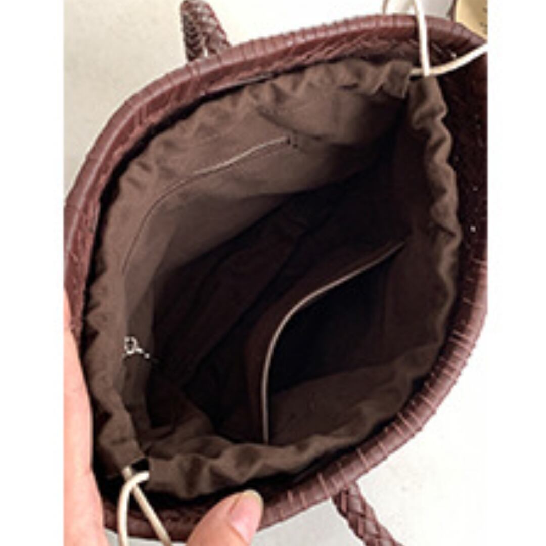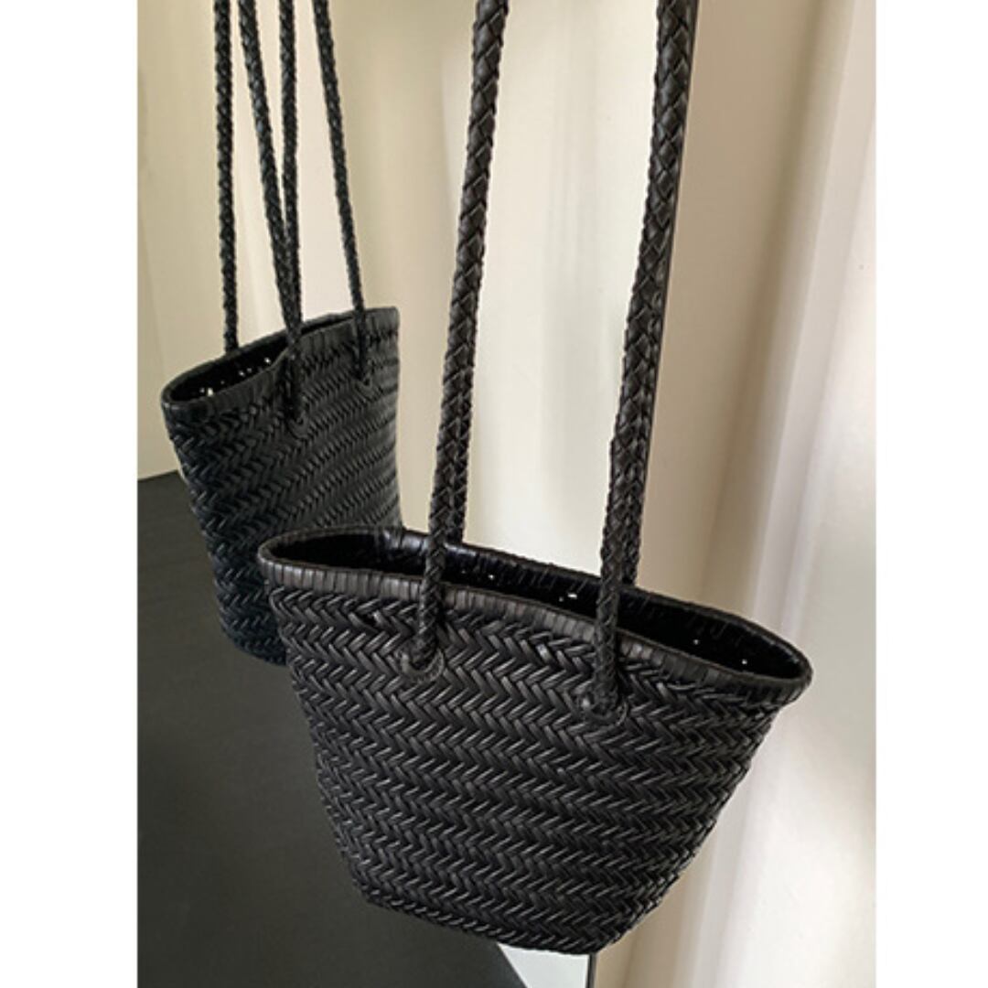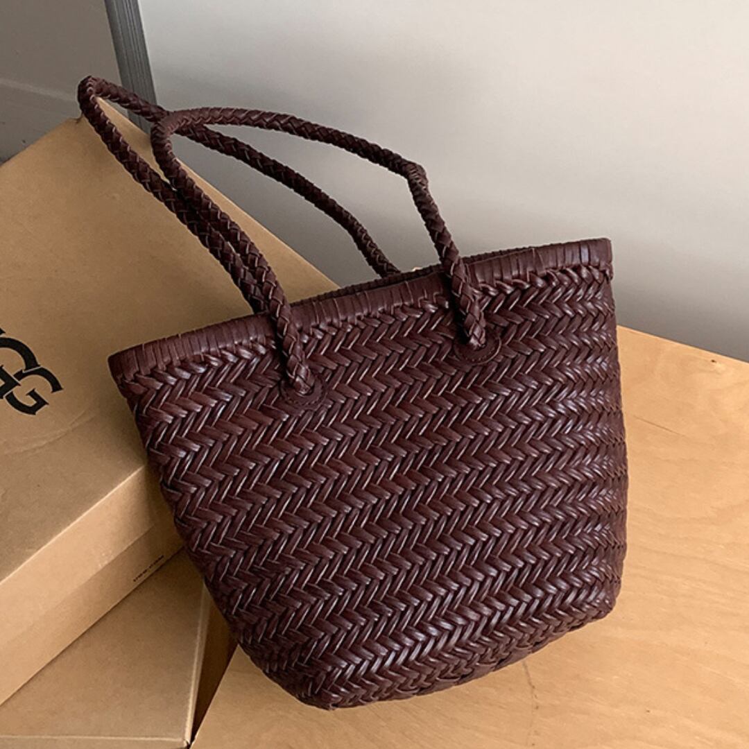 ヘリンボーン柄に編み込まれたレザートートバッグ。