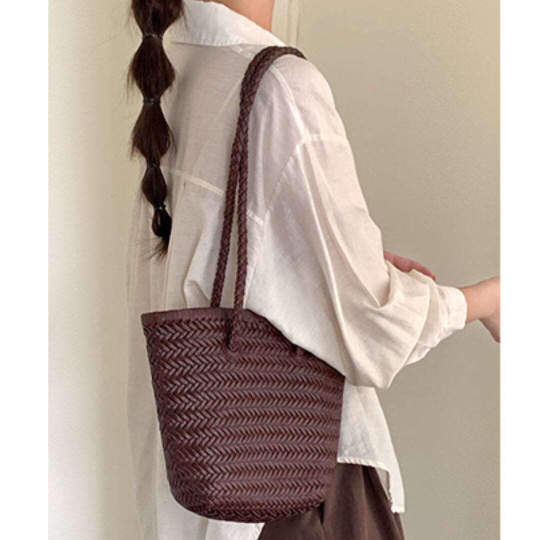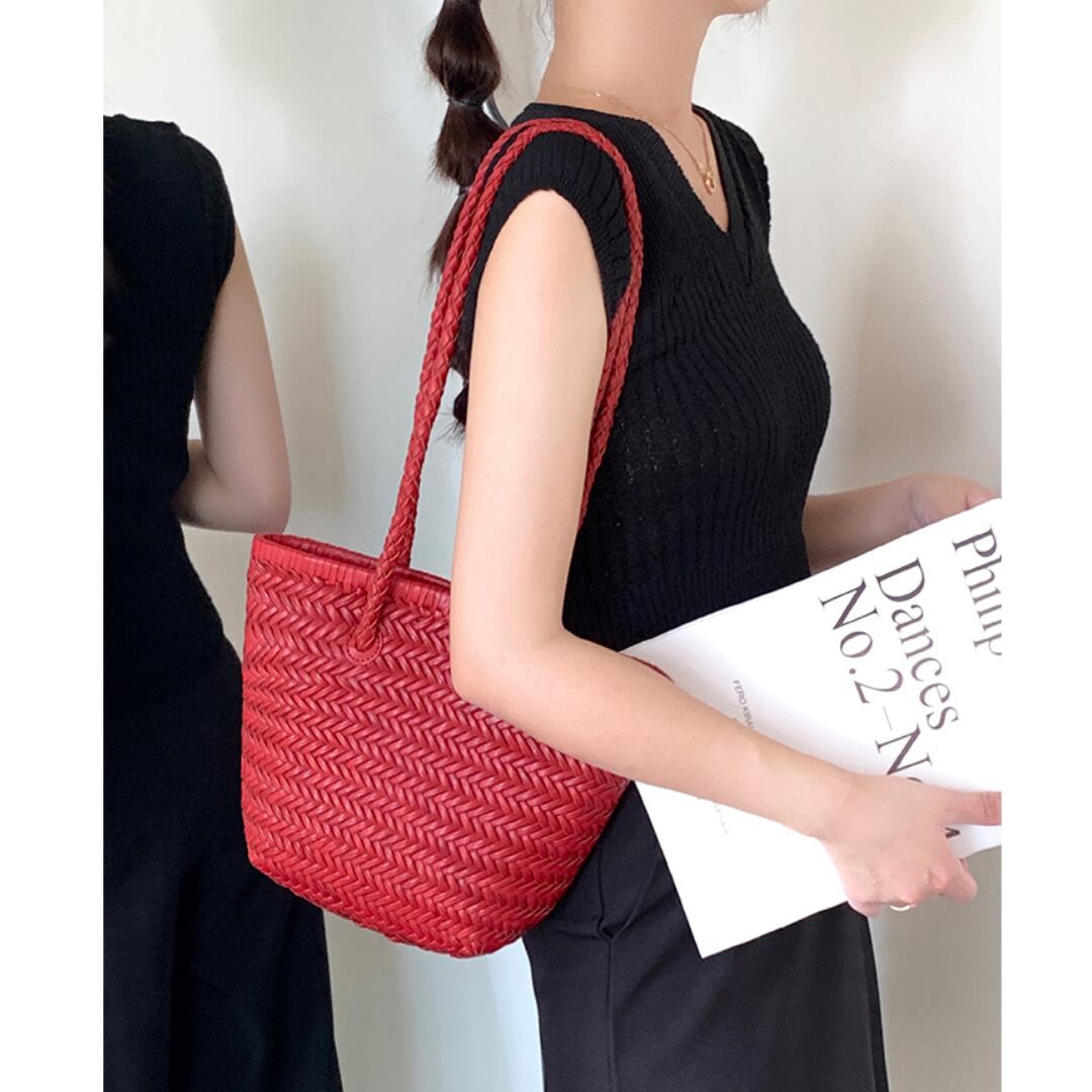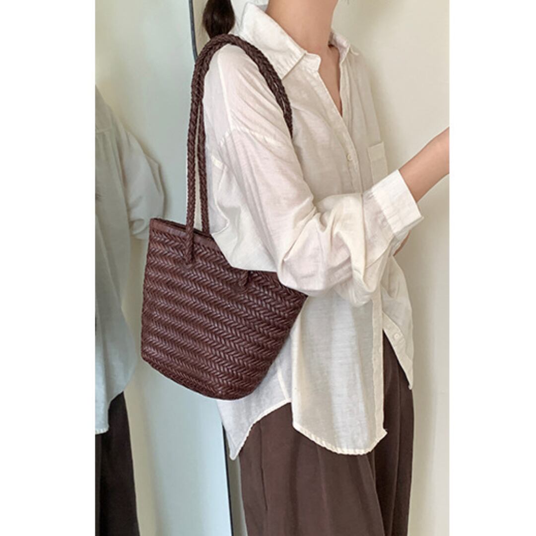 ヘリンボーン柄に編み込まれたレザートートバッグ。