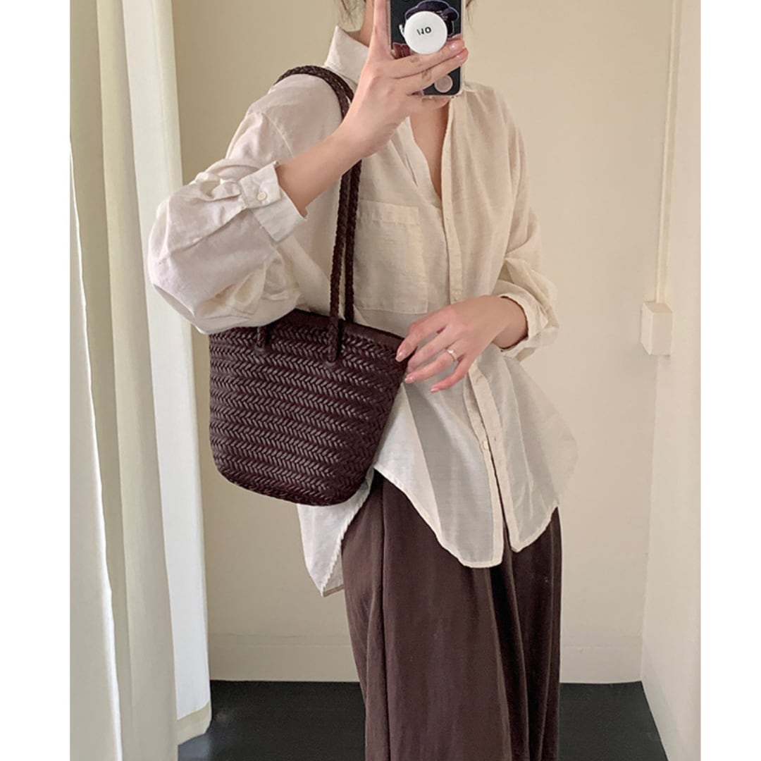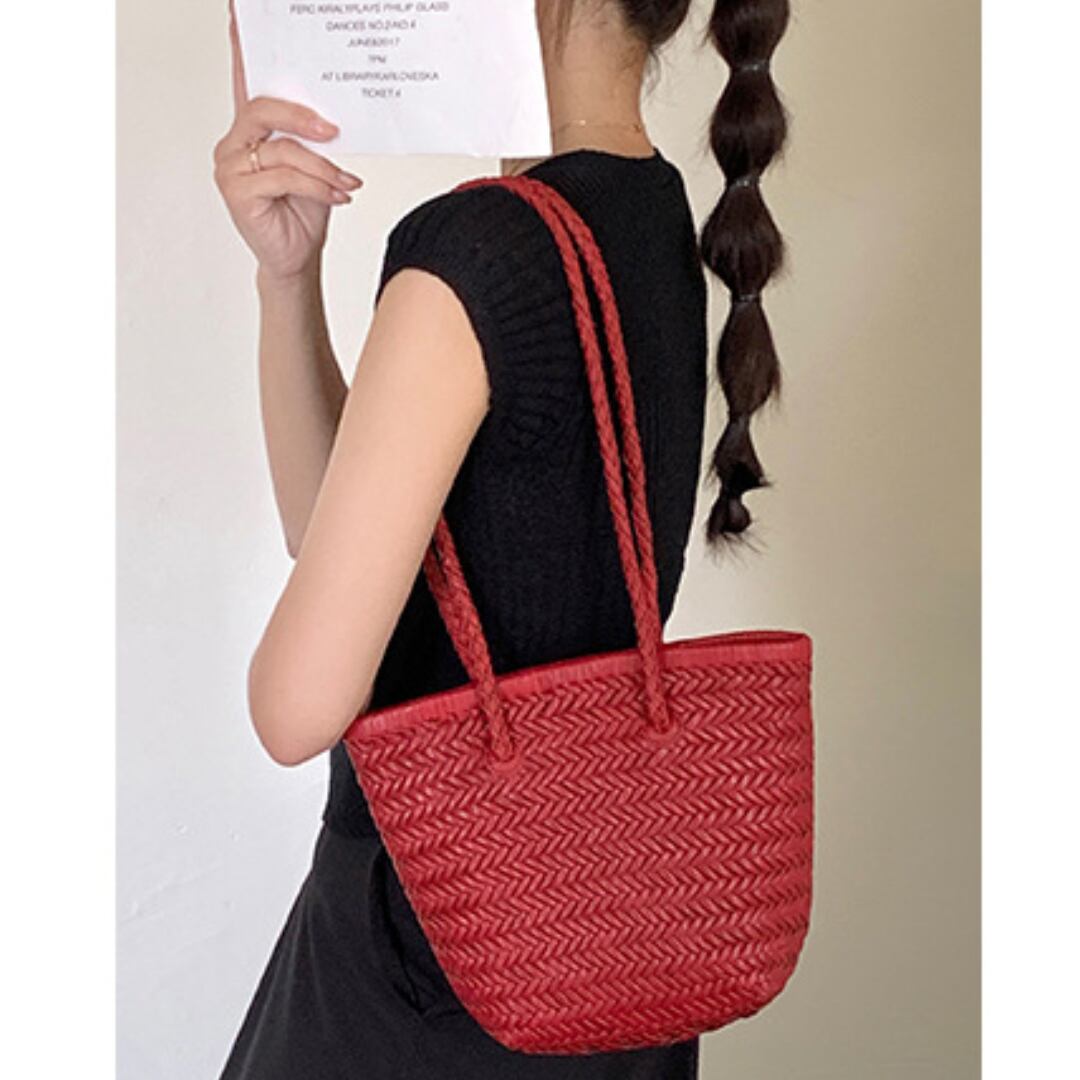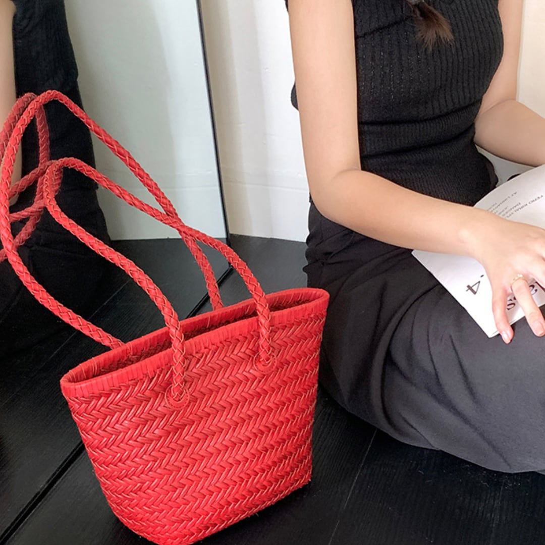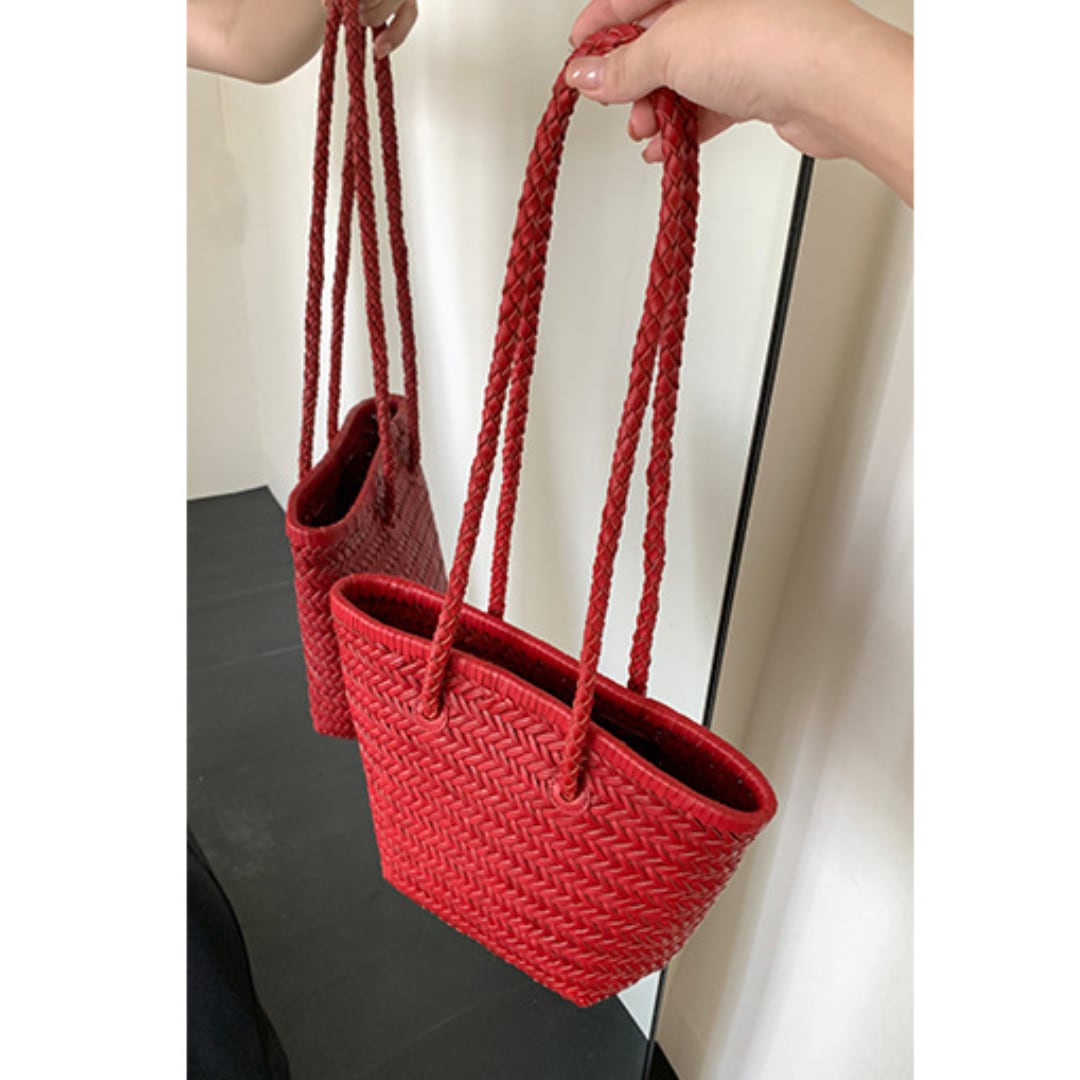 ヘリンボーン柄に編み込まれたレザートートバッグ。