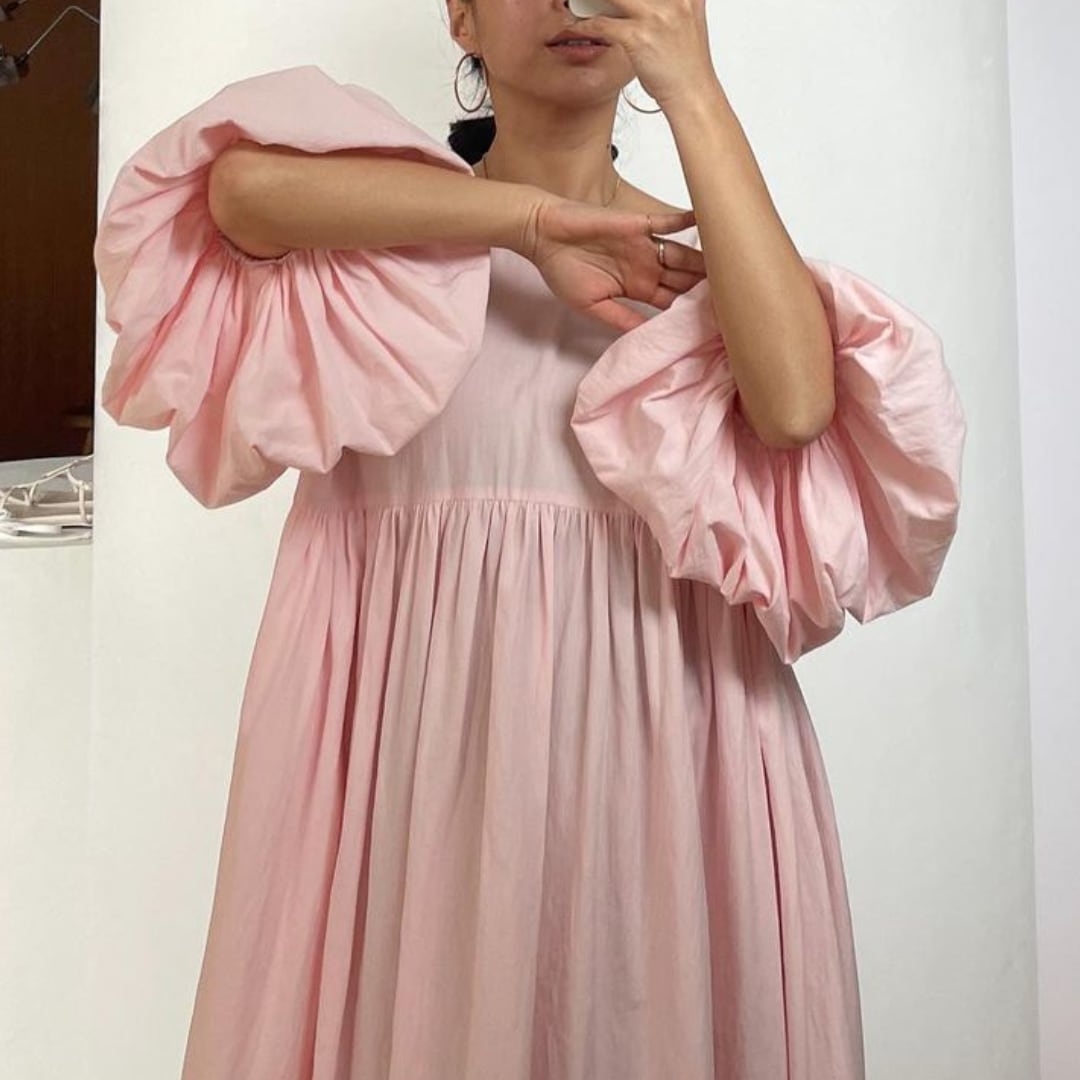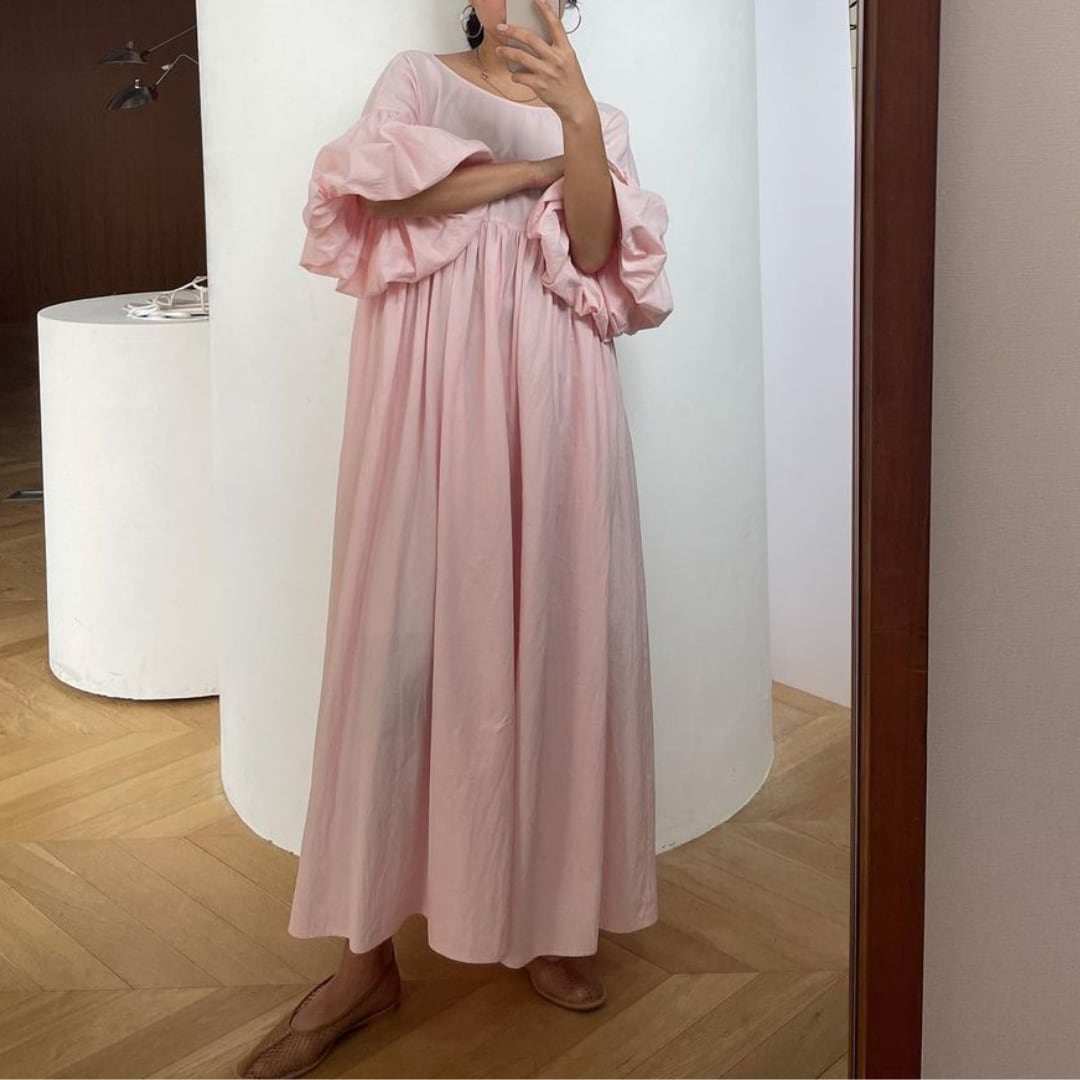存在感のある大きめのパフスリーブで華やかな印象を与えるワンピース。