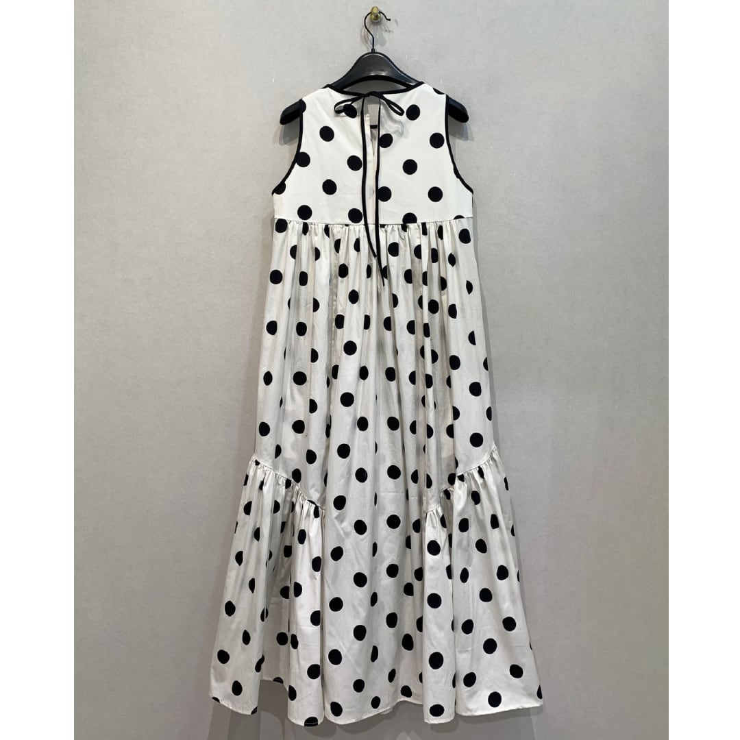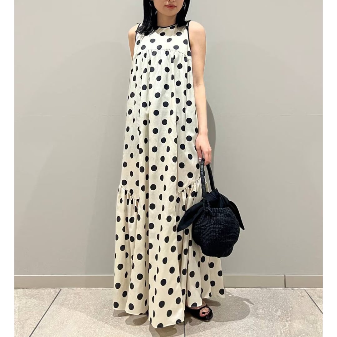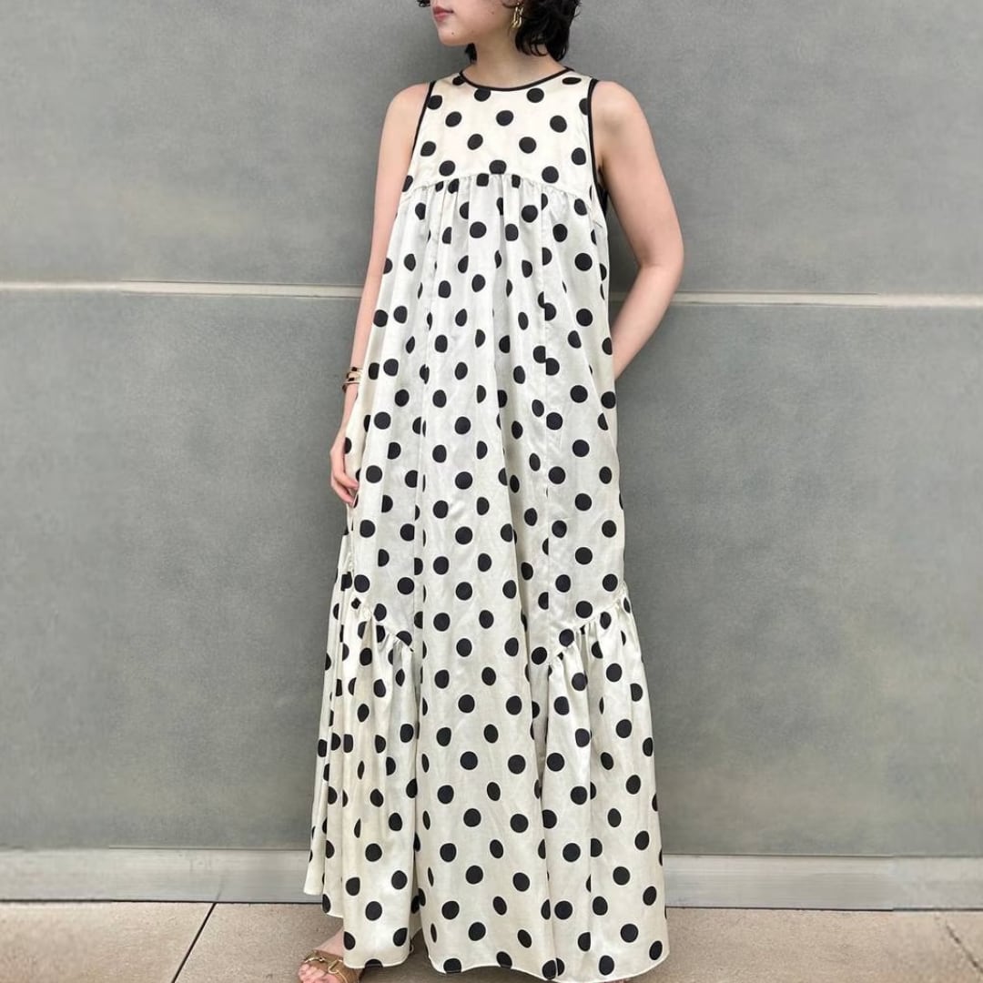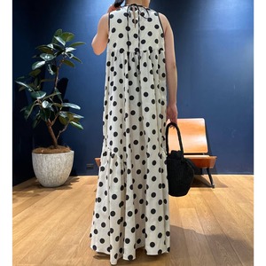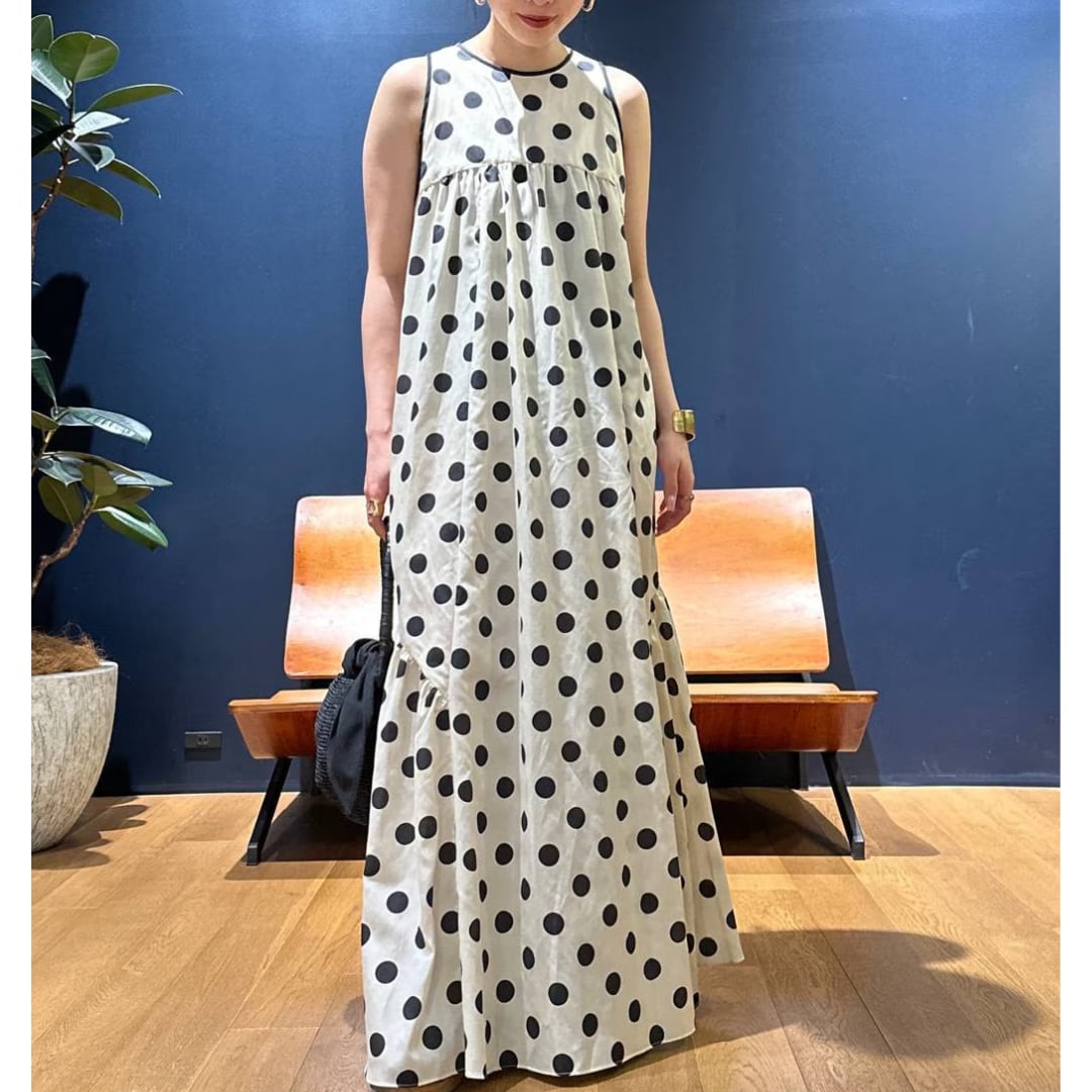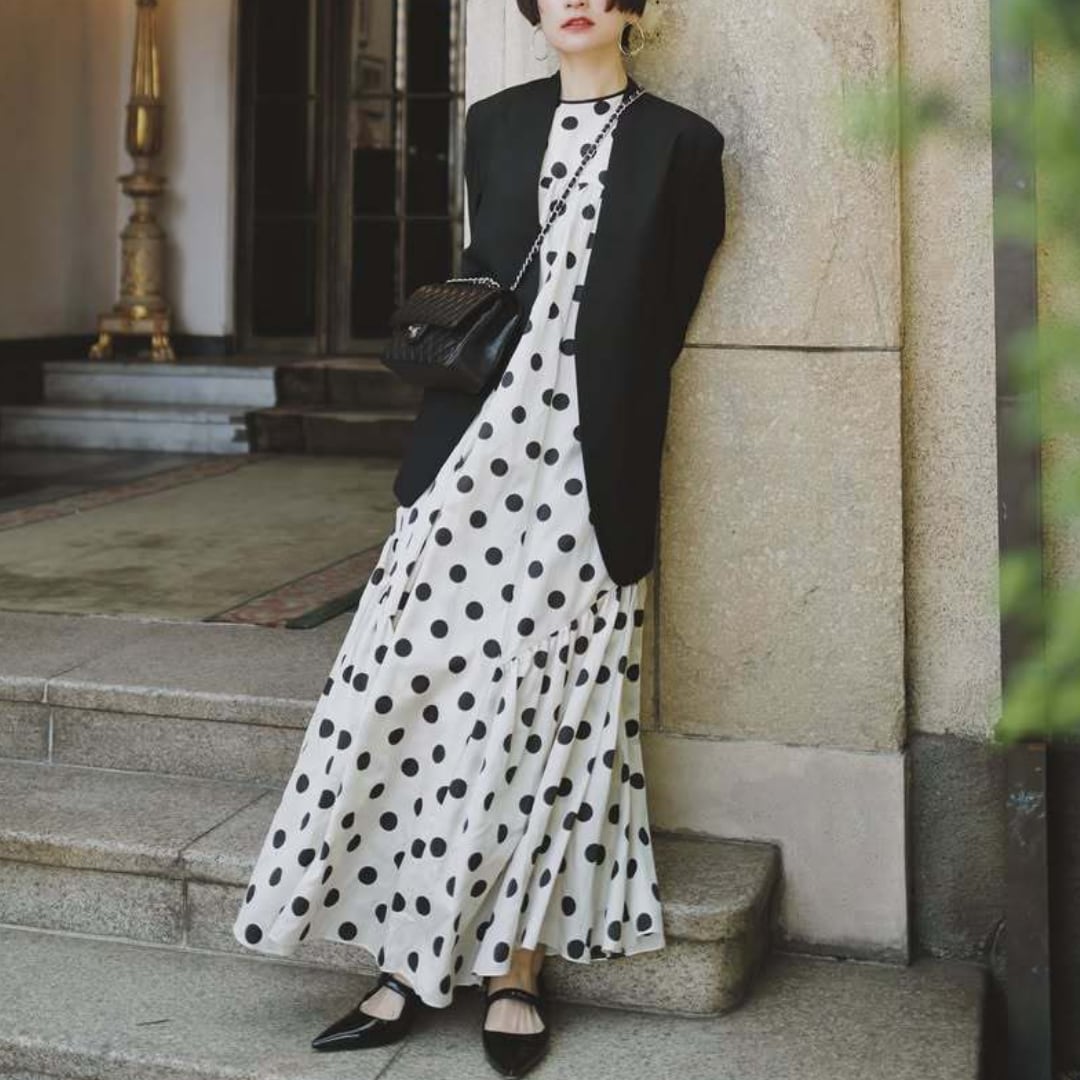 爽やかな雰囲気が漂うモノトーンの水玉柄ロングワンピース。