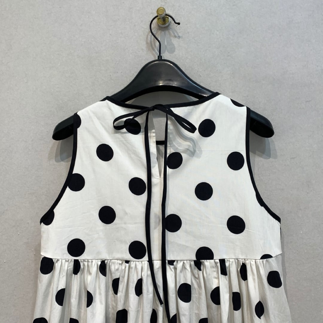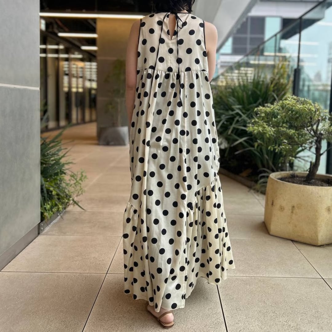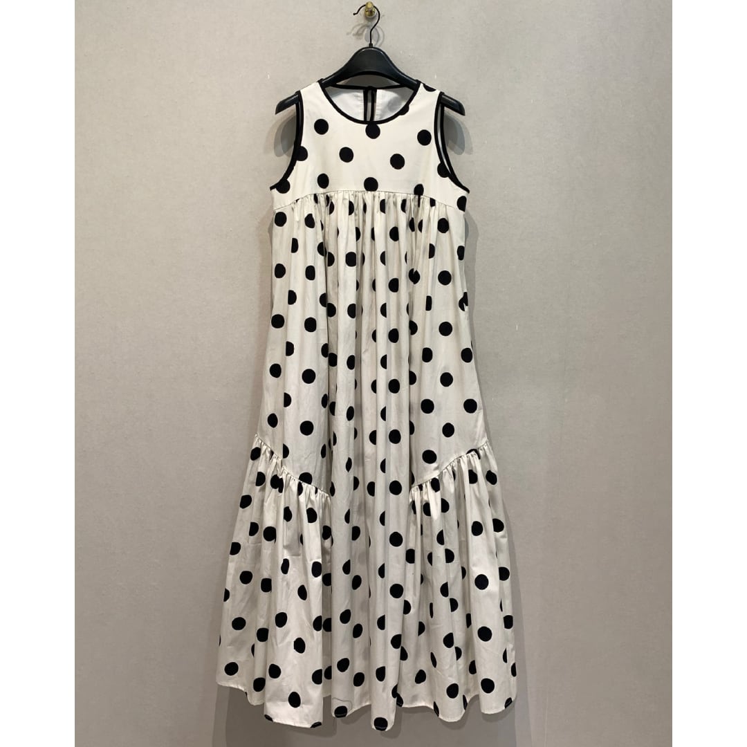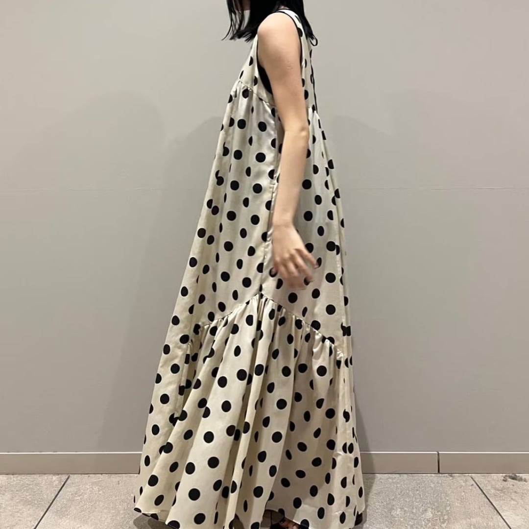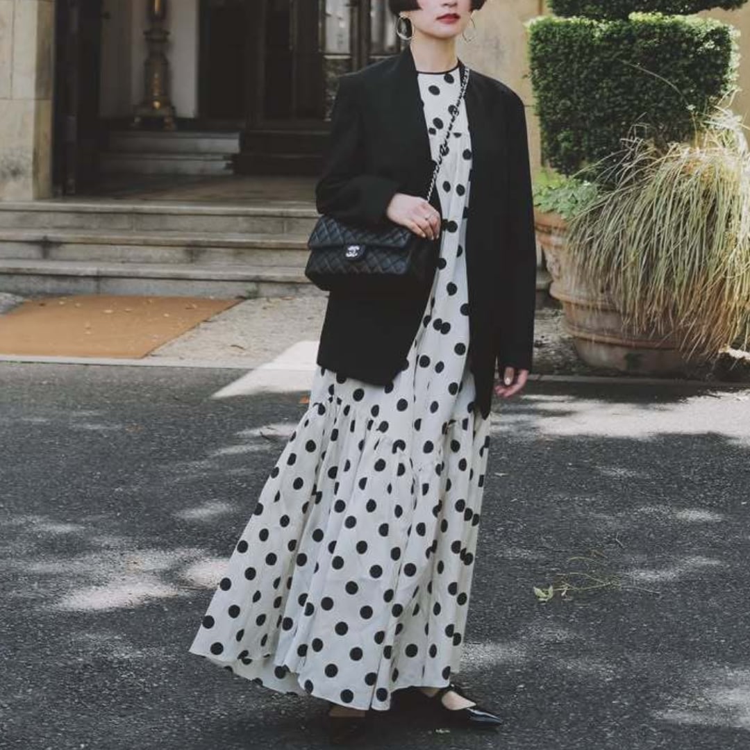 爽やかな雰囲気が漂うモノトーンの水玉柄ロングワンピース。