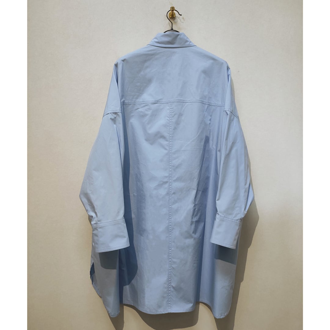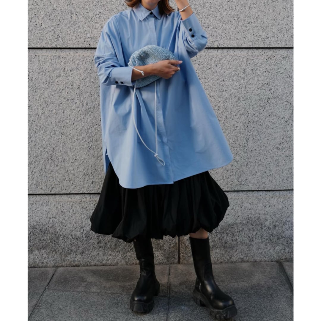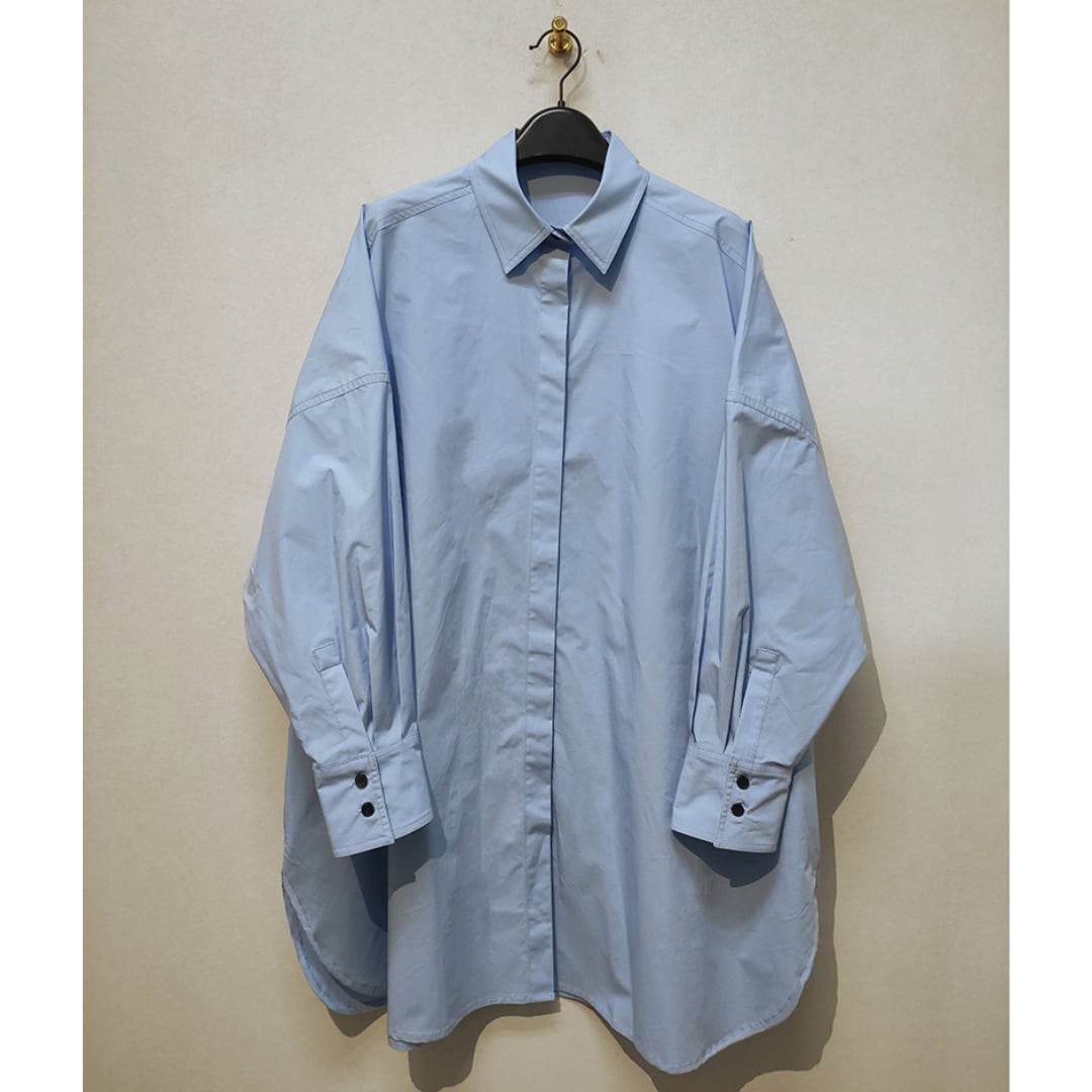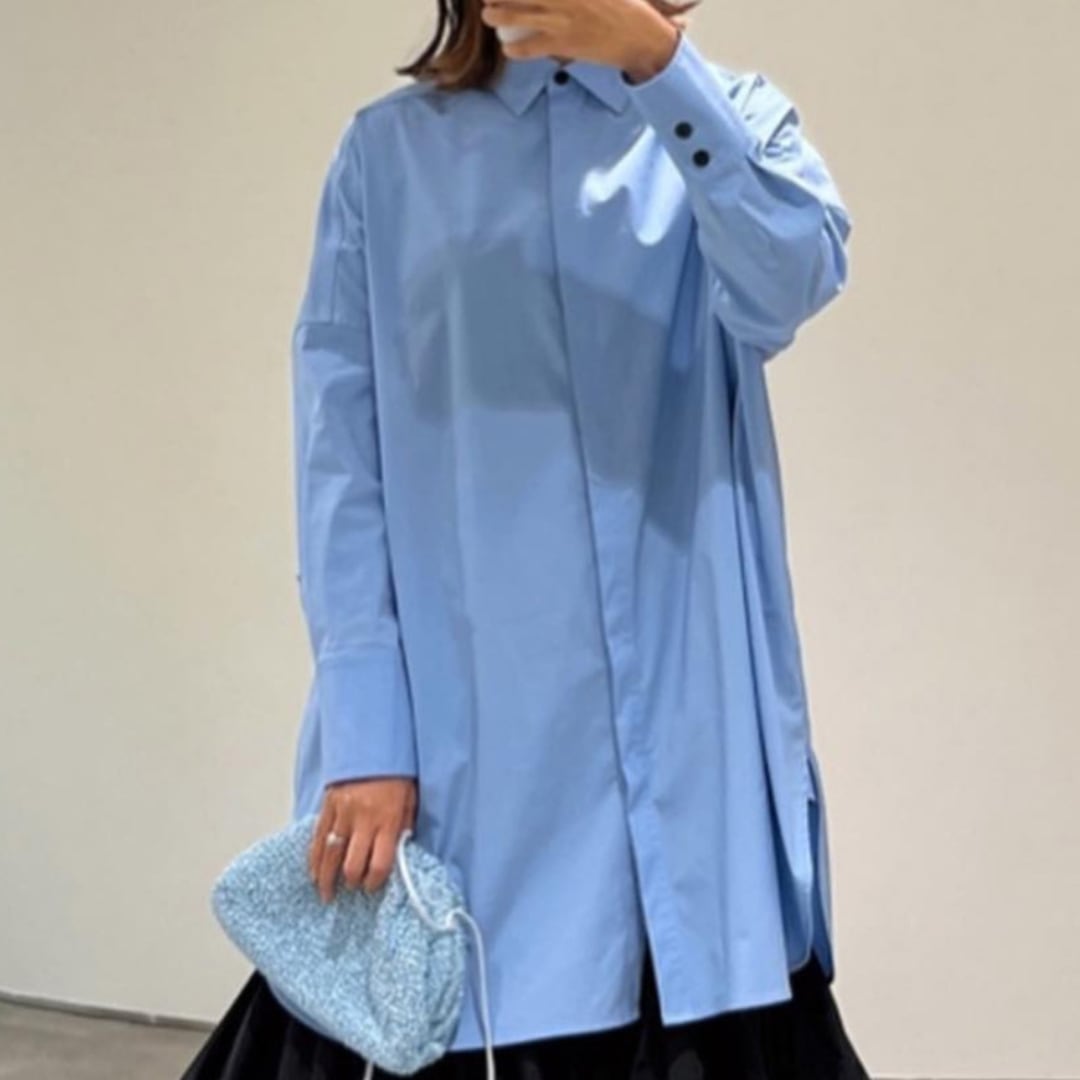 ビックシルエットでこなれ感があり、ハリとサラッとした質感を兼ね備えたコットン100%の生地を使用。穏やかな空を想像させるライトブルーが清々しい印象を与えてくれます。