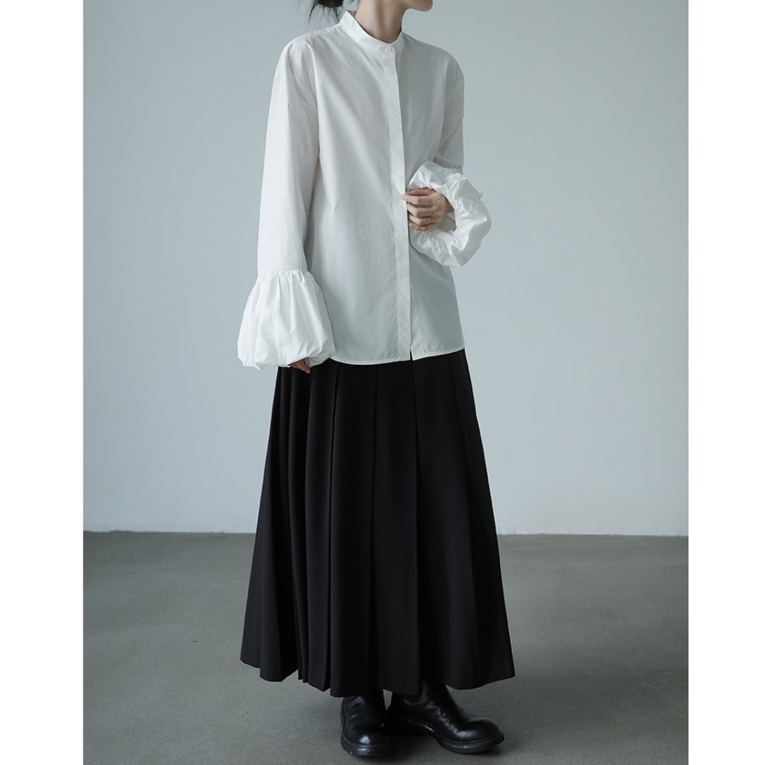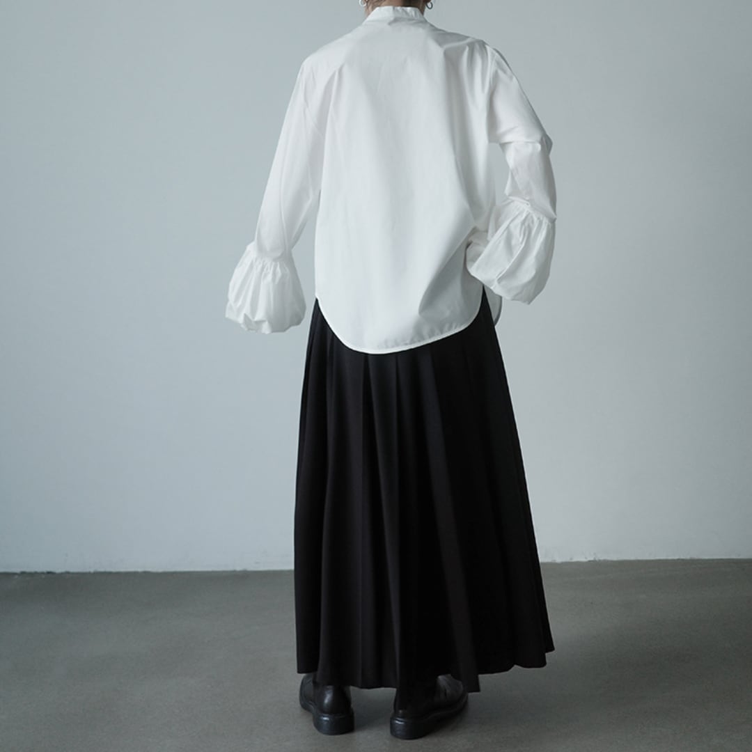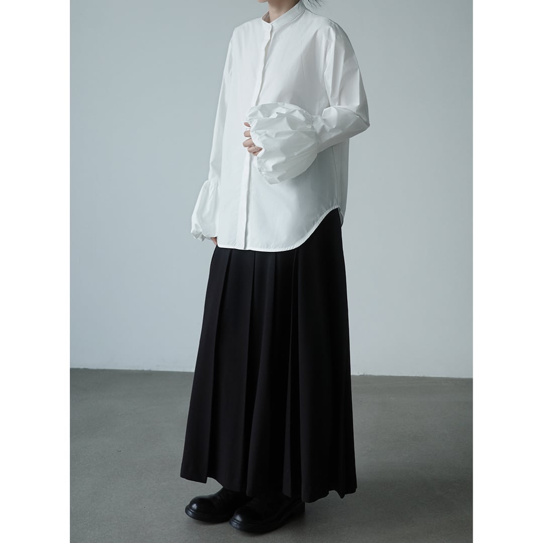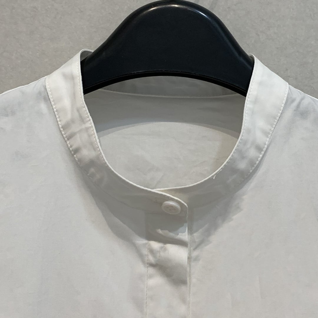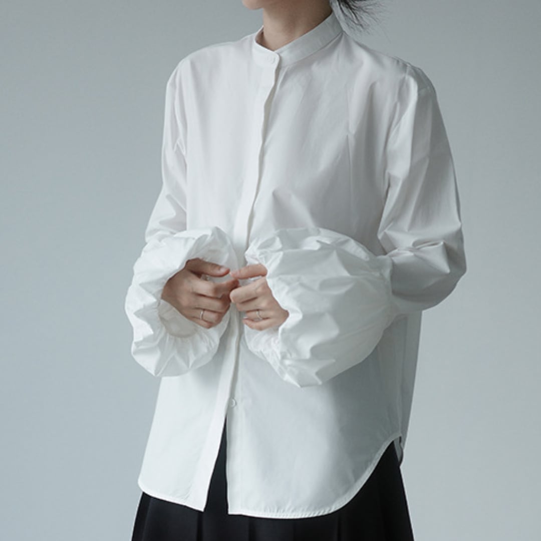 シャツとブラウスの魅力をいいとこどりした、きれいめに着こなせる比翼仕立てのバンドカラーデザイン。スカートにもパンツスタイルにも合う清楚なブラウスです。